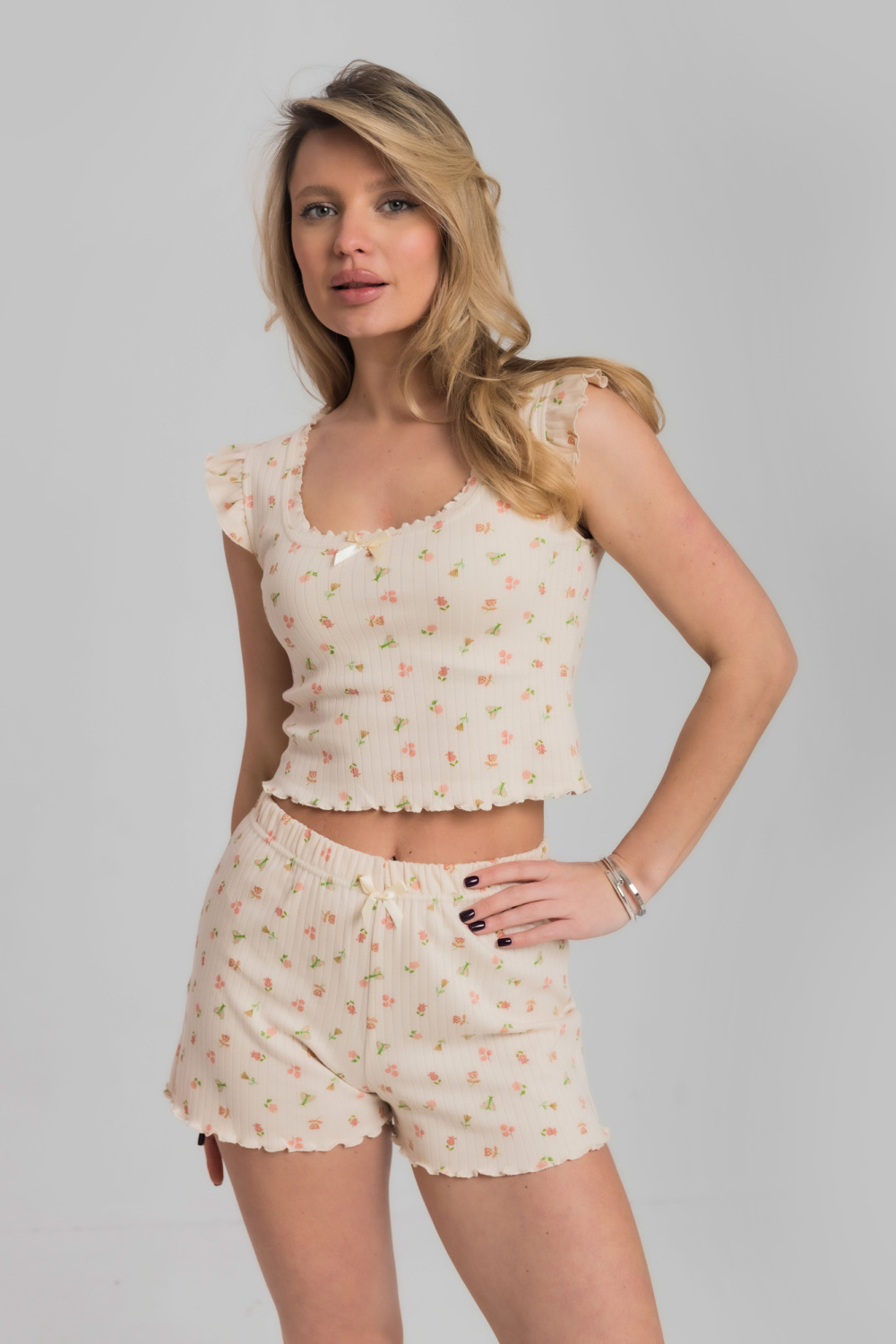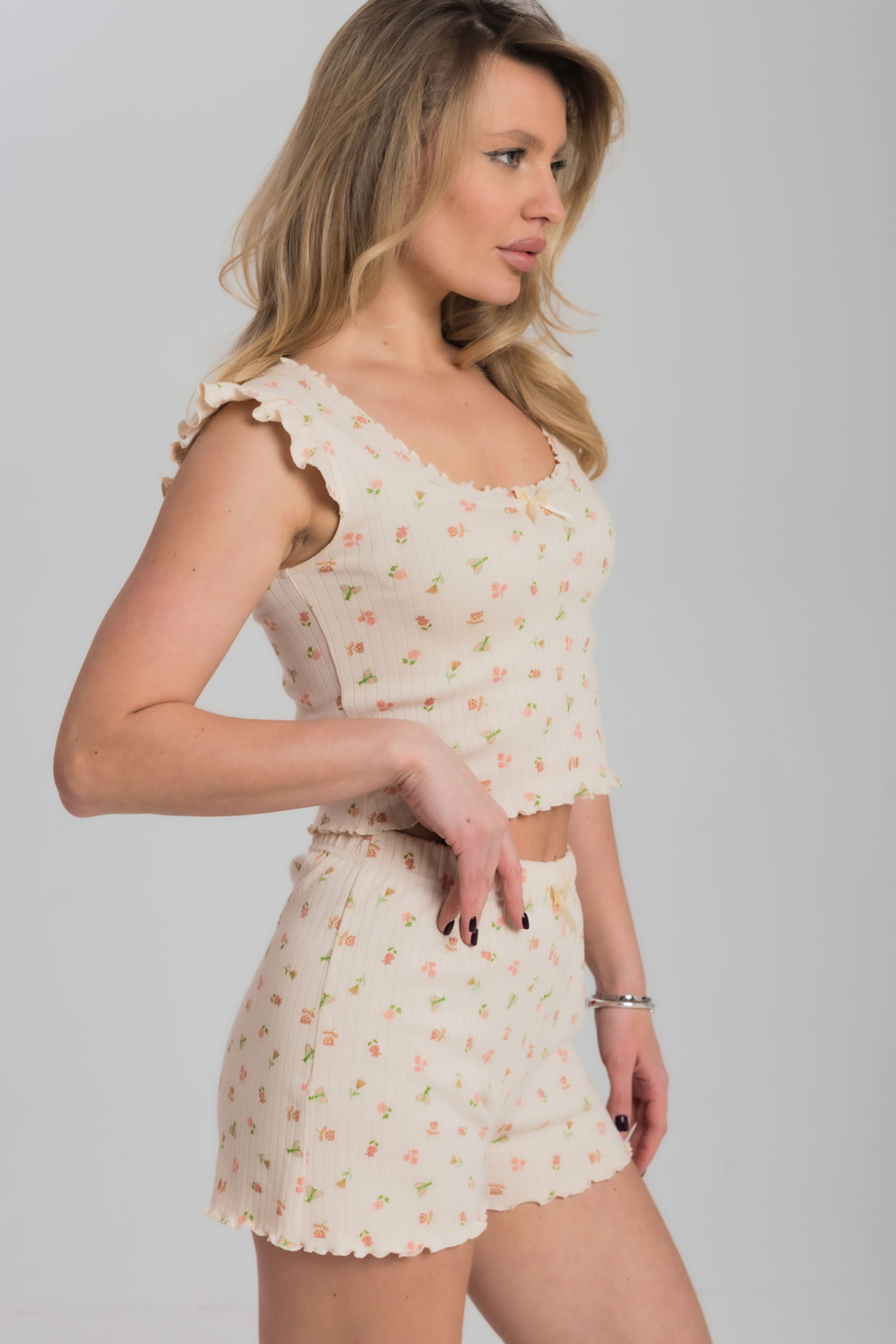 Пижама из мягкого и приятного к телу интерлока состоит из топа и шорт. Топ оформлен милыми "крылышками" по проймам и аккуратной отделкой горловины. Шорты на удобной резинке, без карманов. Пижама декорирована бантиками и отделкой на микрооверлоке, придающей образу нежность и изящность.