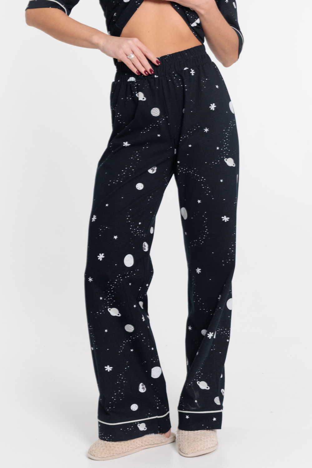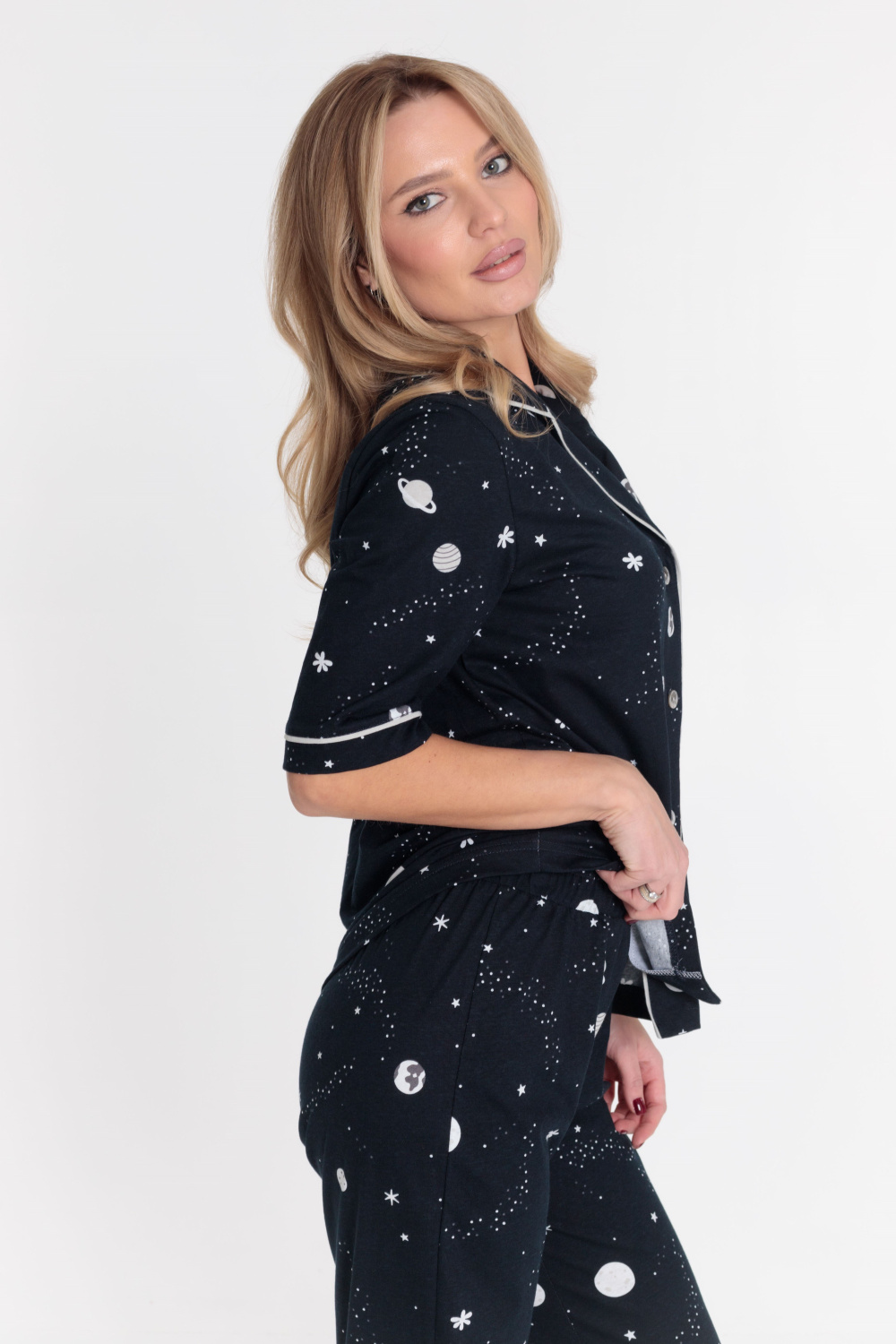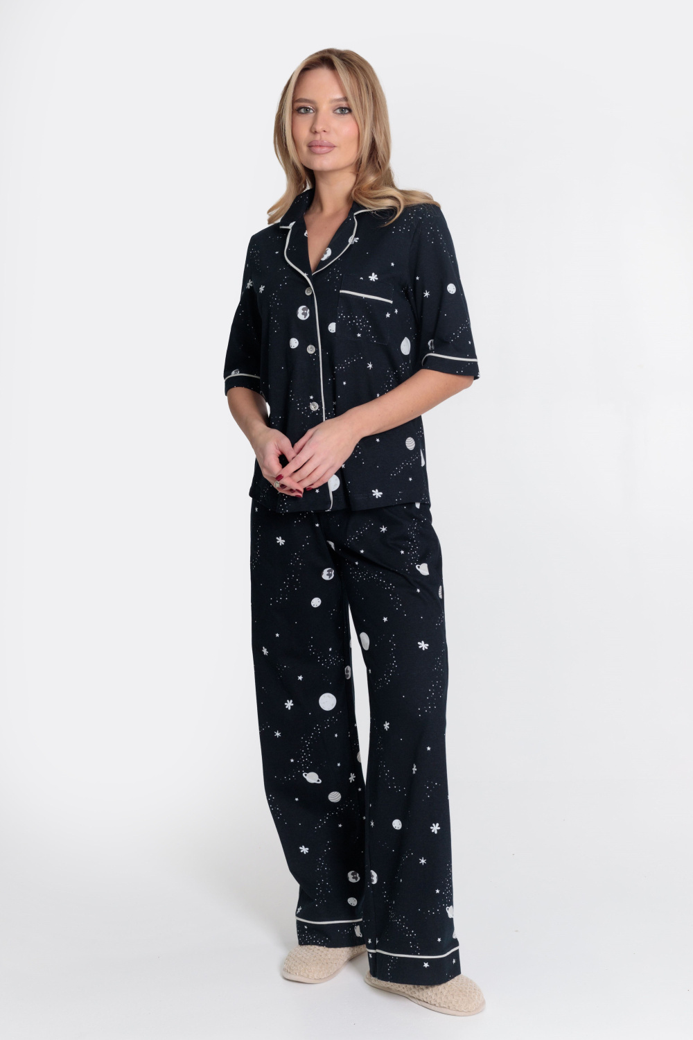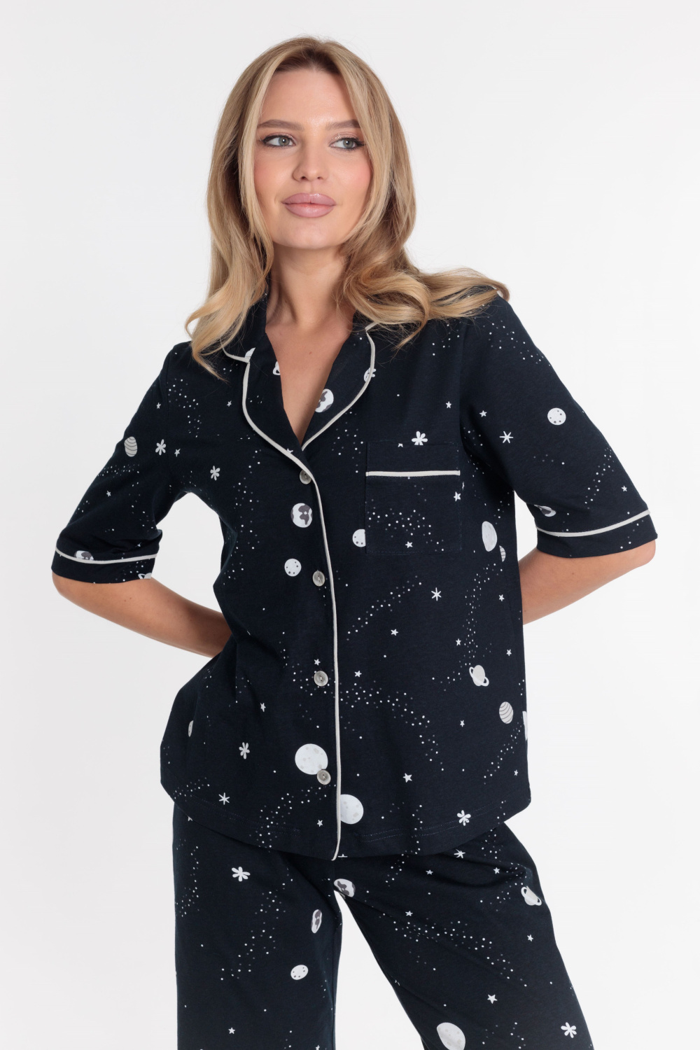 Женская пижама выполнена из кулирки, 100% хлопок. Рубашка с отложным воротником, коротким рукавом и карманом спереди. Рубашка застёгивается на пуговицы. Брюки свободные, с притачным поясом на резине. Рубашка и брюки украшены декоративным элементом - кантом.
