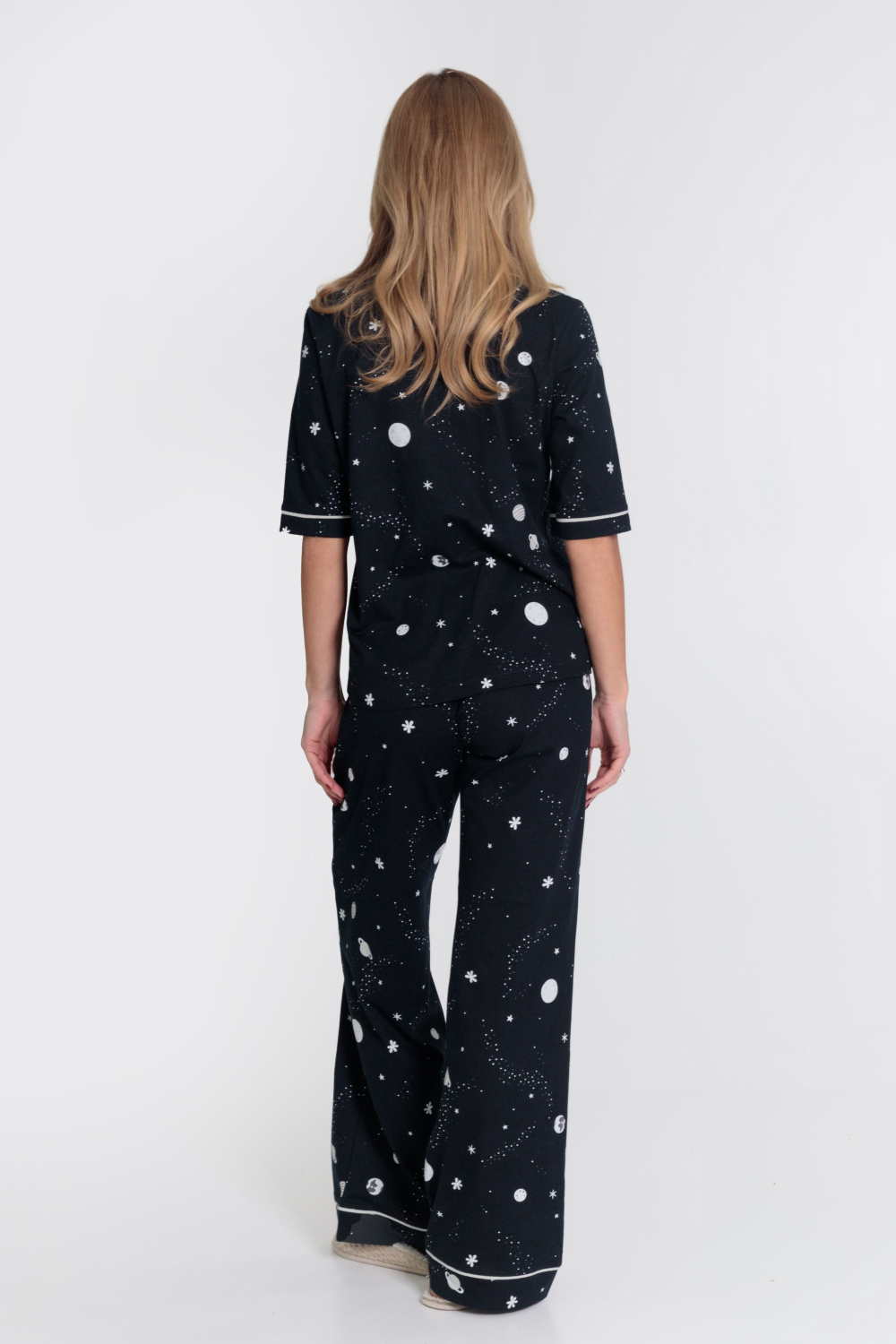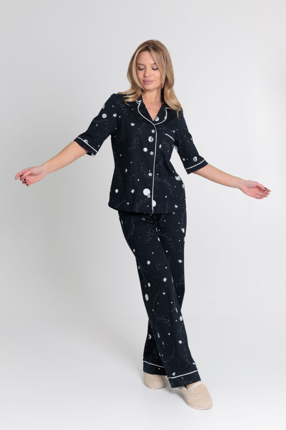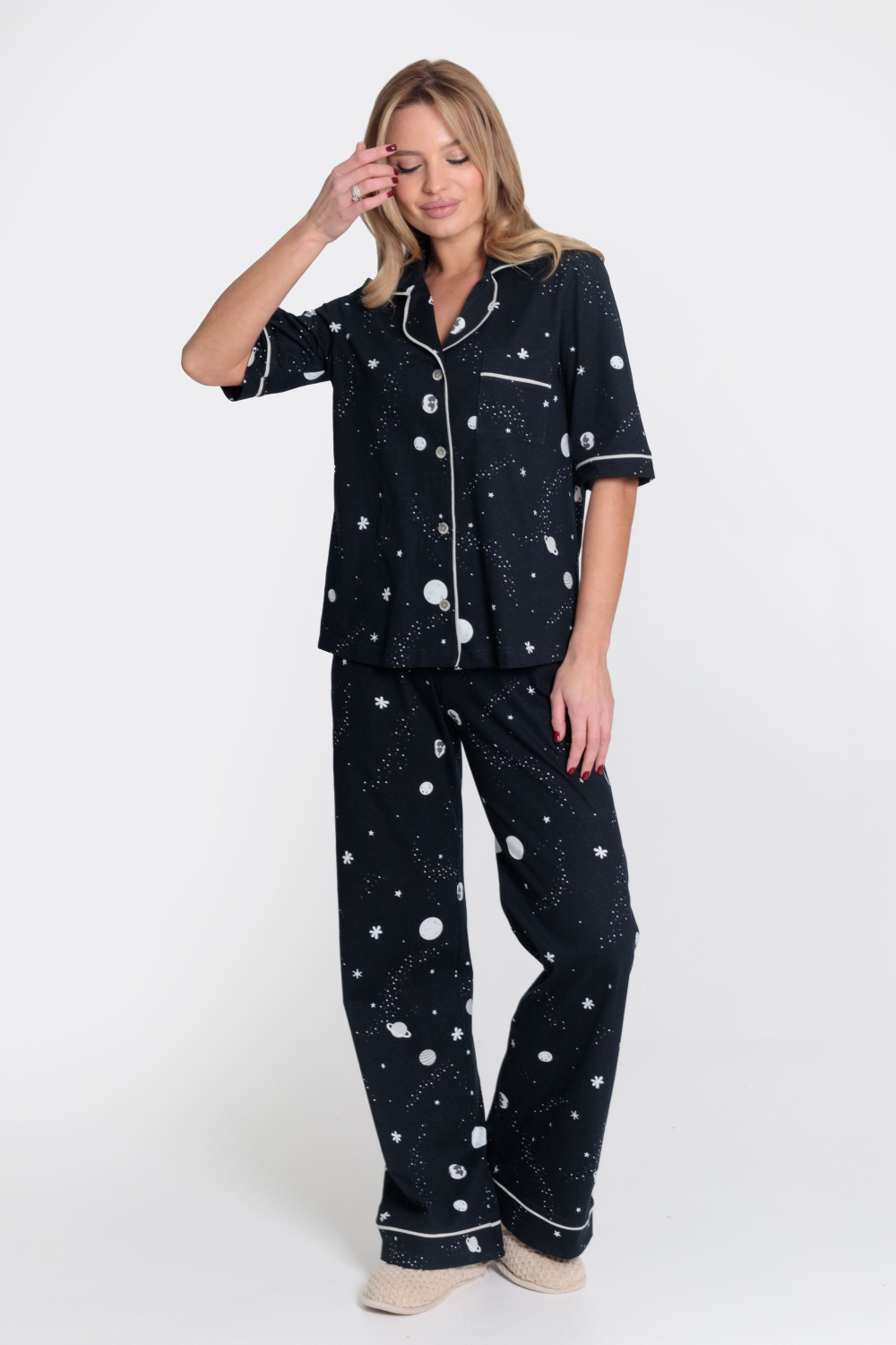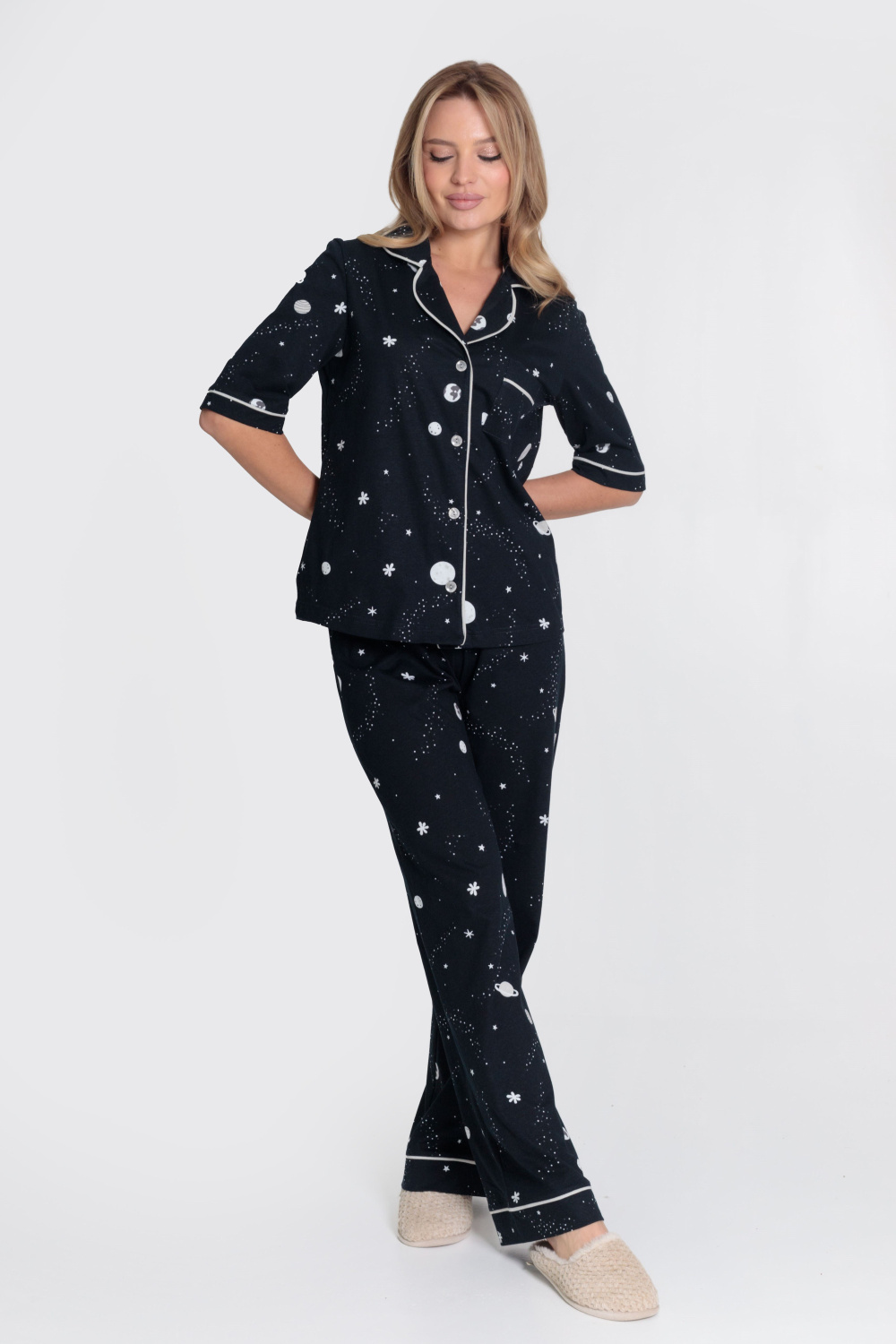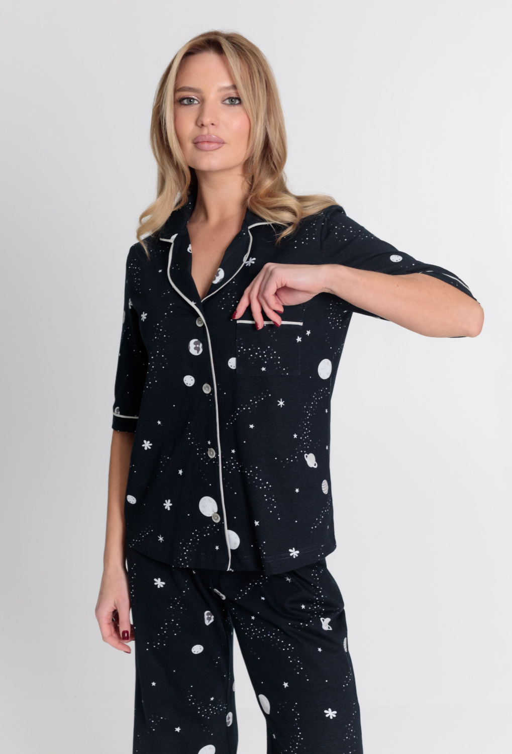 Женская пижама выполнена из кулирки, 100% хлопок. Рубашка с отложным воротником, коротким рукавом и карманом спереди. Рубашка застёгивается на пуговицы. Брюки свободные, с притачным поясом на резине. Рубашка и брюки украшены декоративным элементом - кантом.
