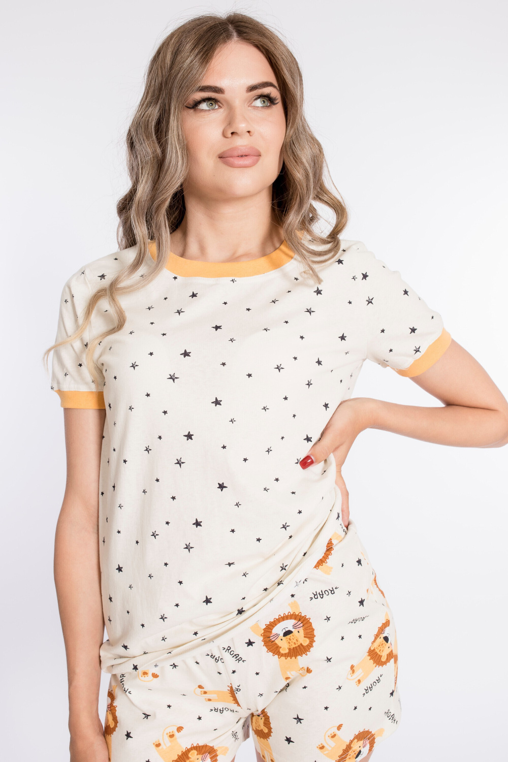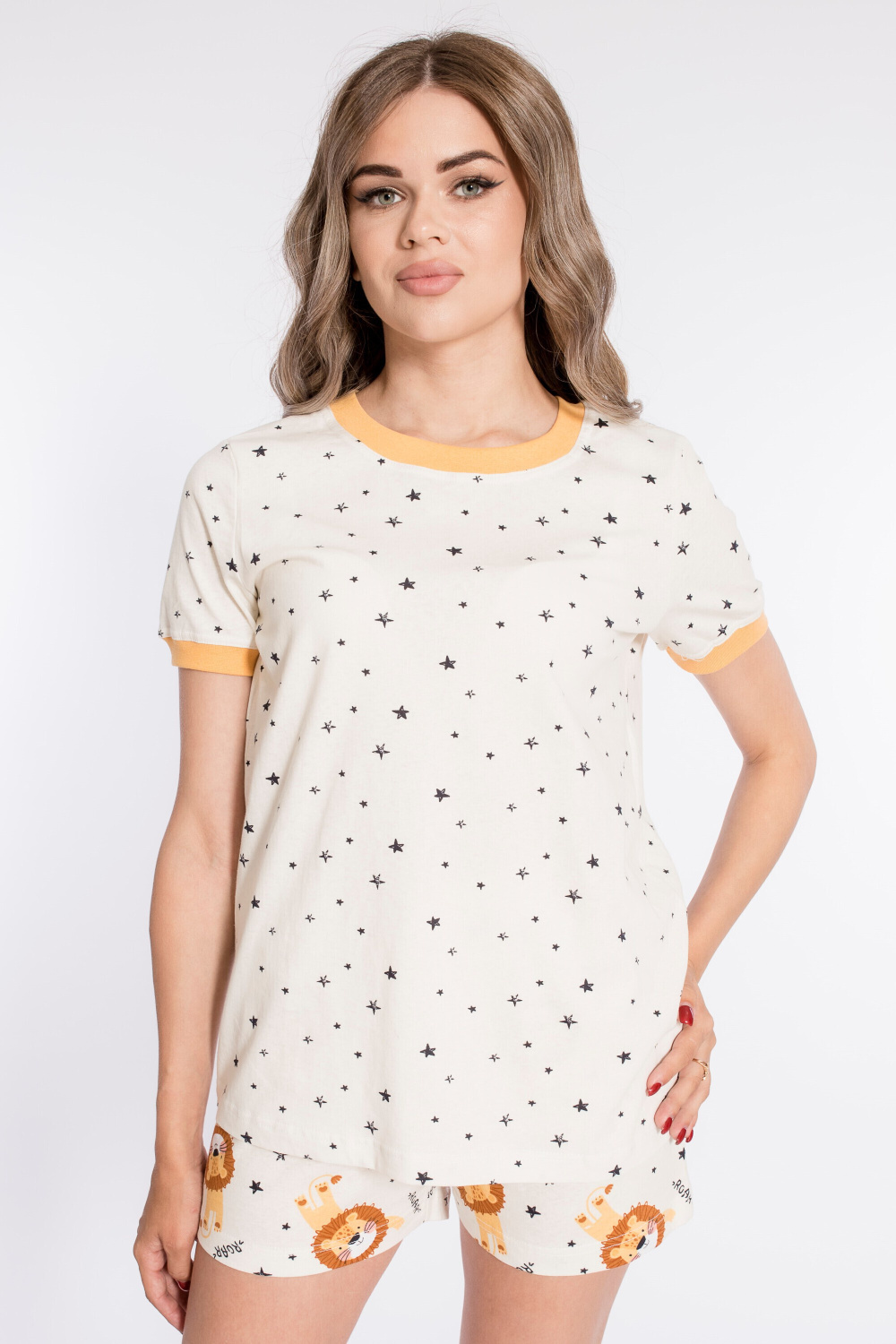 Пижама выполнена из кулирки с набивным рисунком. Футболка с коротким рукавом, с планкой из рибаны по горловине и низу рукавов. Шорты короткие, пояс на резине.