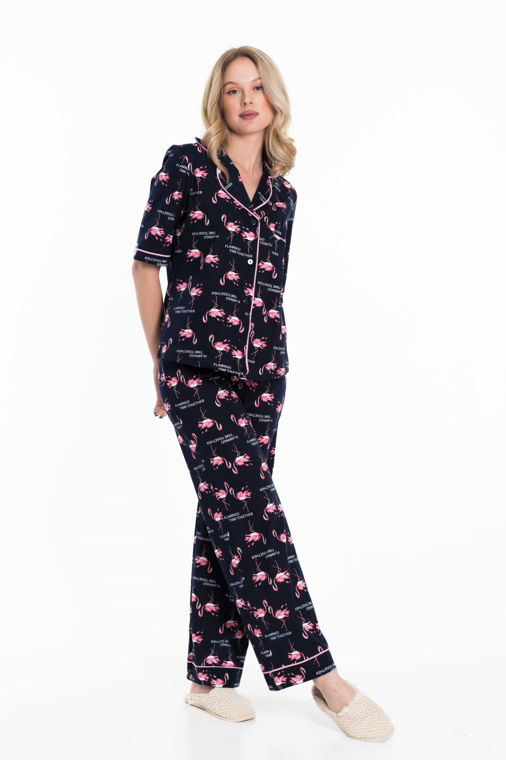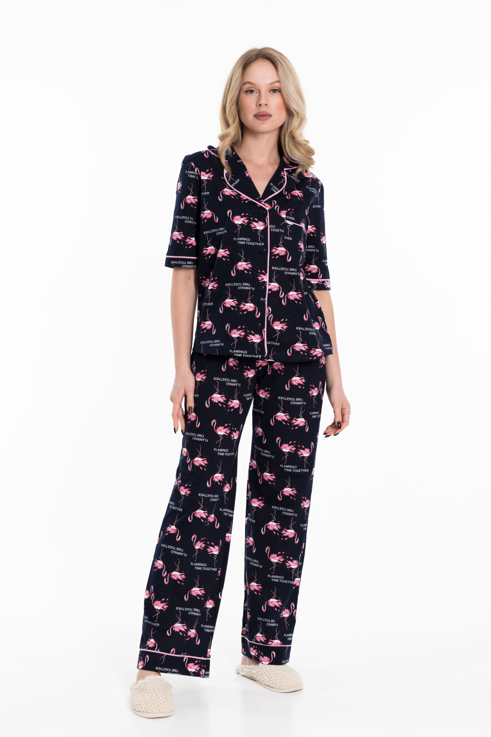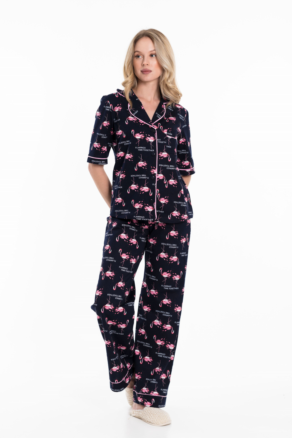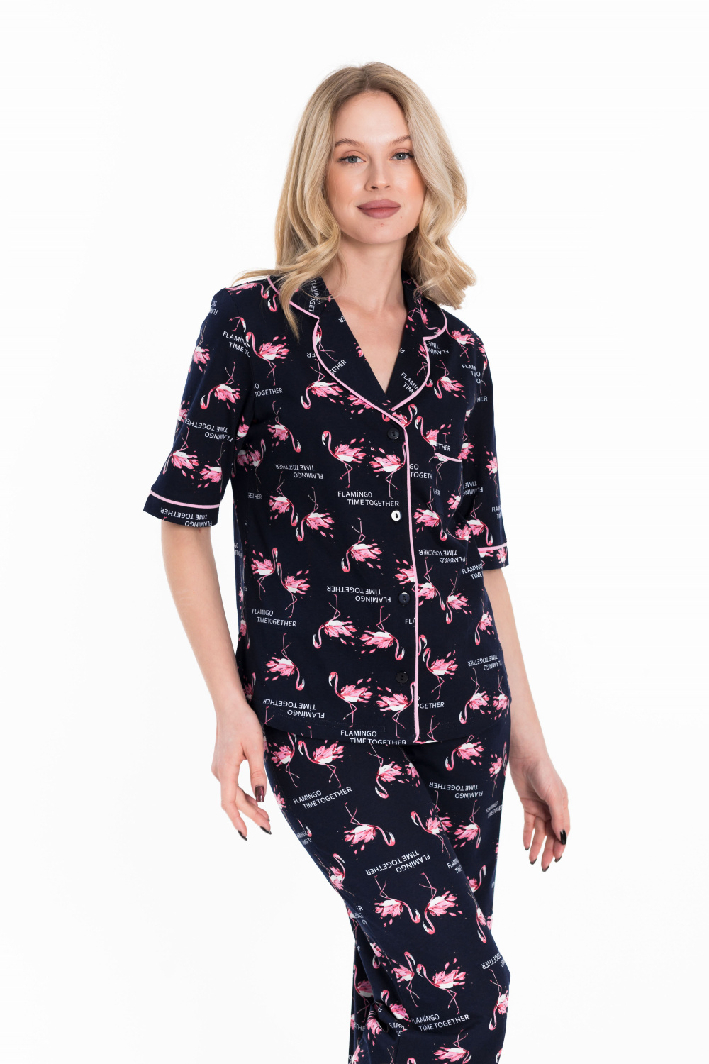 Женская пижама выполнена из кулирки, 100% хлопок. Рубашка с отложным воротником, коротким рукавом и карманом спереди. Рубашка застёгивается на пуговицы. Брюки свободные, с притачным поясом на резине. Рубашка и брюки украшены декоративным элементом - кантом.