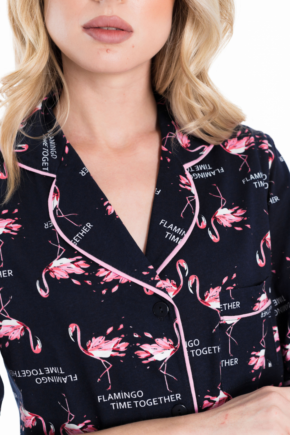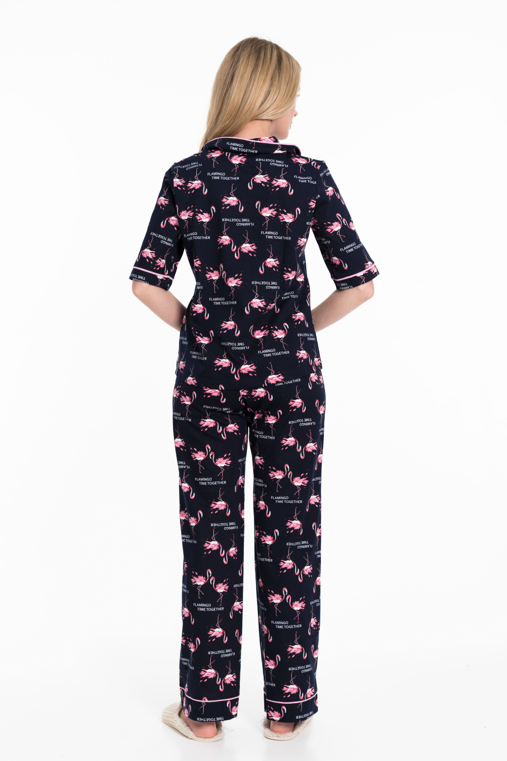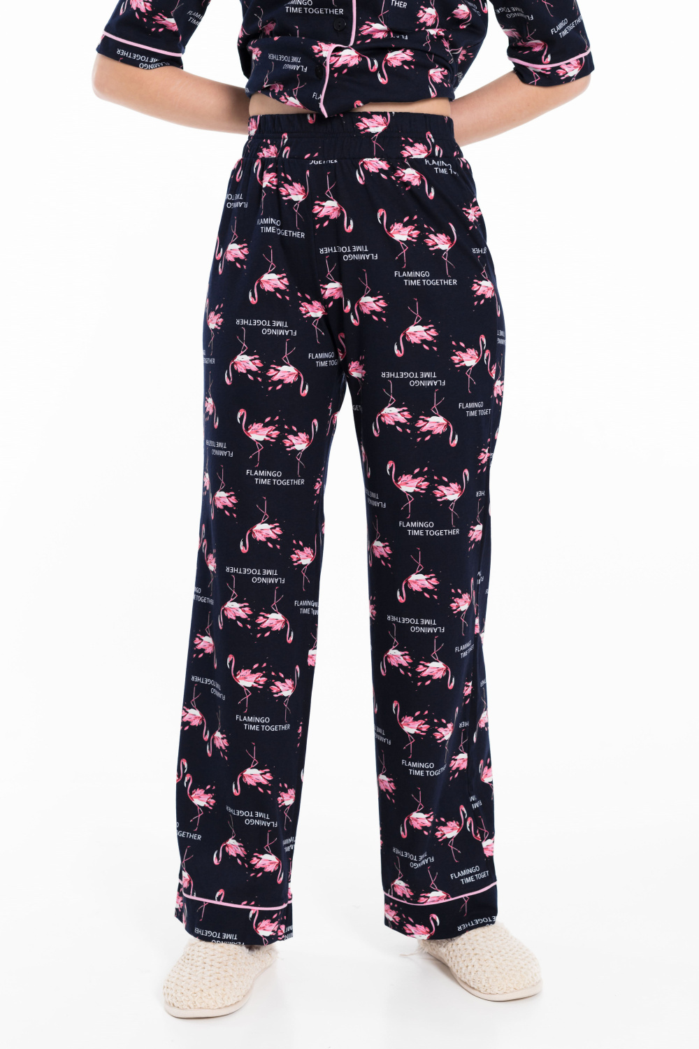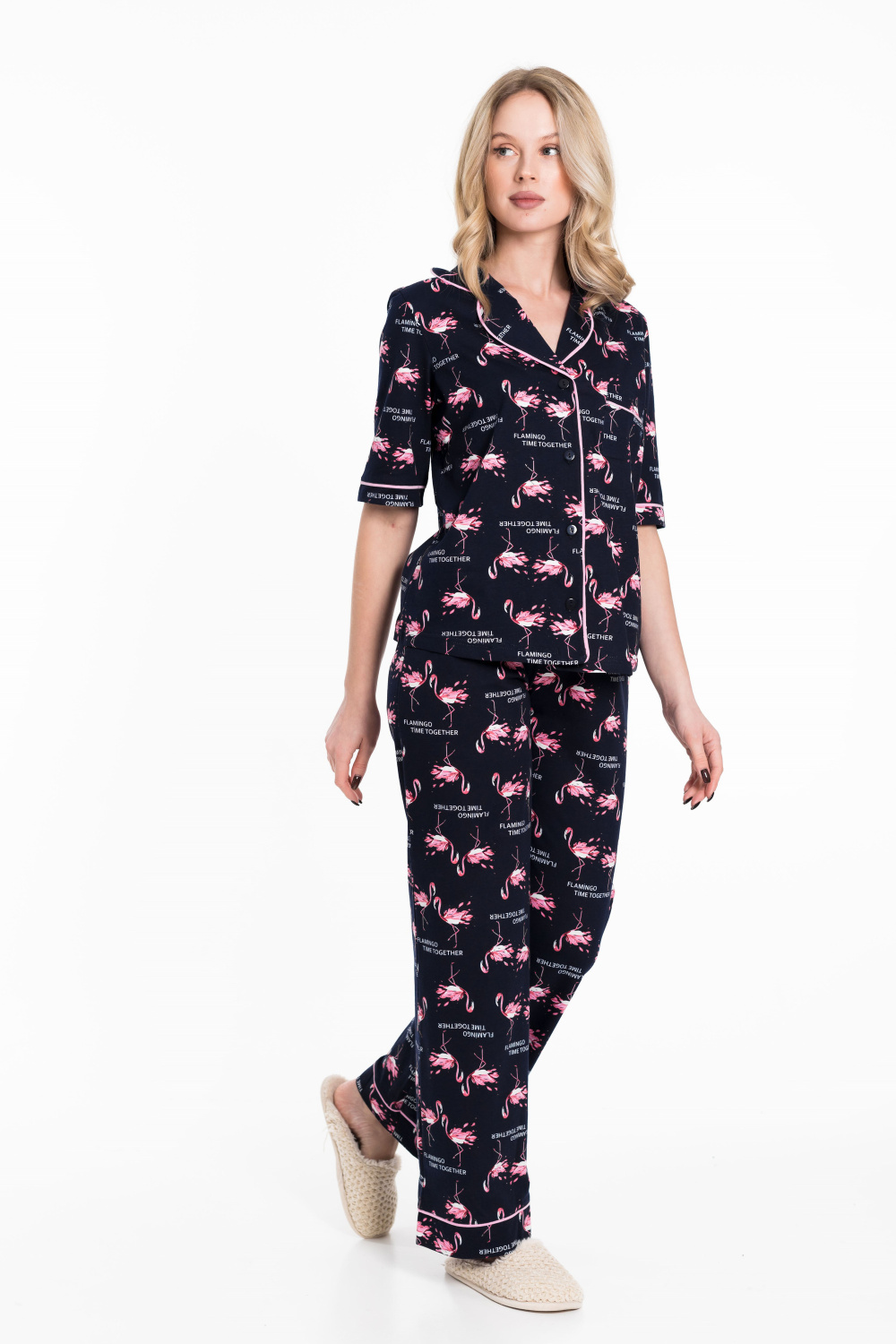 Женская пижама выполнена из кулирки, 100% хлопок. Рубашка с отложным воротником, коротким рукавом и карманом спереди. Рубашка застёгивается на пуговицы. Брюки свободные, с притачным поясом на резине. Рубашка и брюки украшены декоративным элементом - кантом.