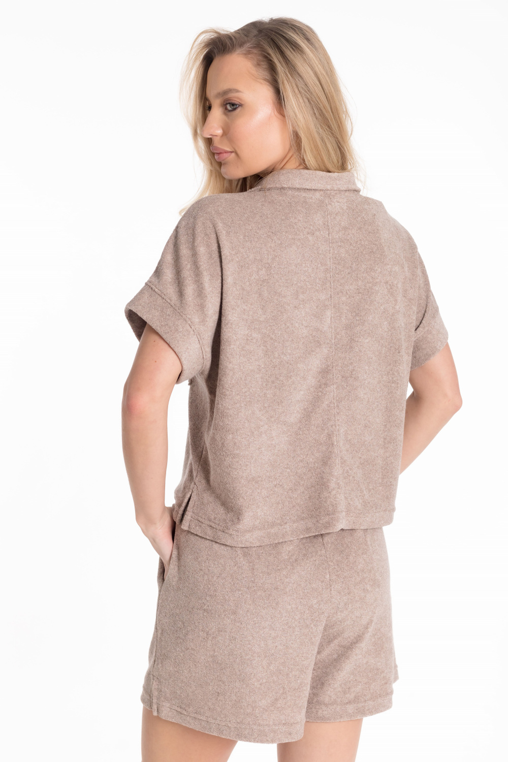 Женская пижама из однотонной махры — отличный выбор для повседневной носки. Рубашка свободного силуэта с цельнокроеным коротким рукавом и застёжкой на пуговицах обеспечивает свободу движений. Отложной воротник, боковые разрезы и накладной карман на полочке придают изделию оригинальность. Шорты с боковыми карманами и поясом на резинке обеспечивают комфортную посадку и не сковывают движения. Разрезы по бокам внизу также обеспечивают комфорт при носке. Изготовленная из натуральной ткани, пижама обеспечит комфорт в течение всего дня.