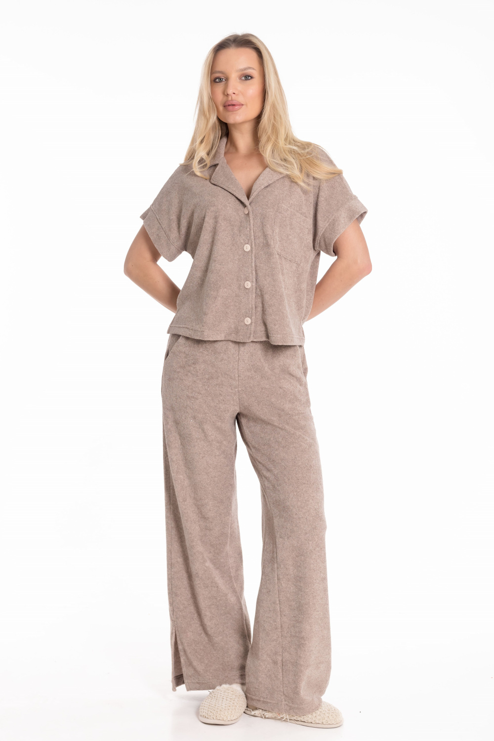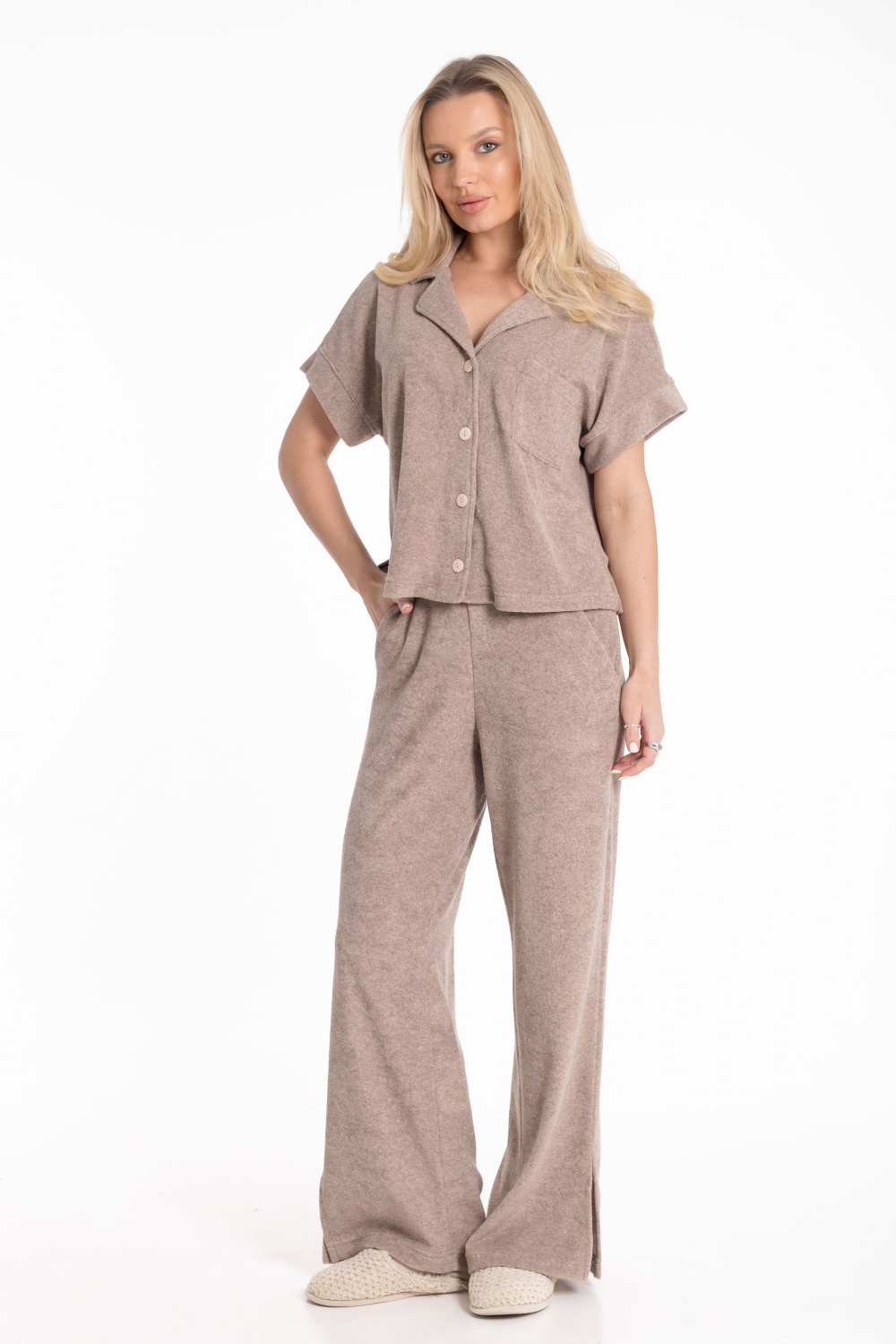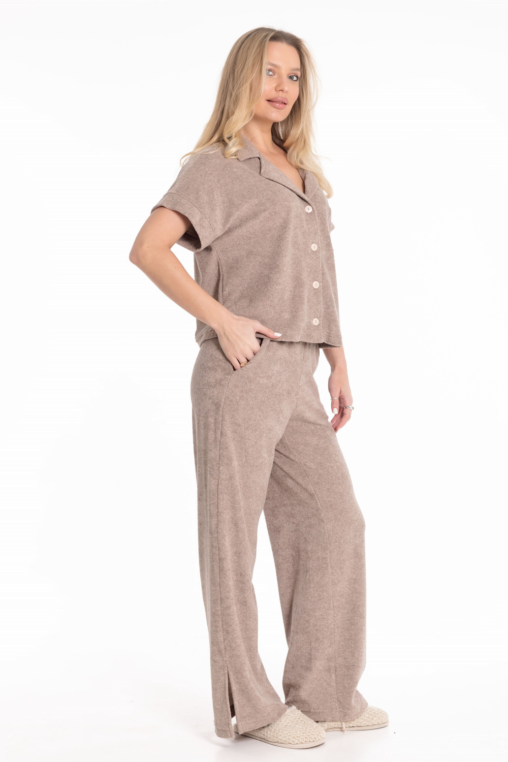 Женская пижама из однотонной махры — отличный выбор для повседневной носки. Рубашка свободного силуэта с цельнокроеным коротким рукавом и застёжкой на пуговицах обеспечивает свободу движений. Отложной воротник, боковые разрезы и накладной карман на полочке придают изделию оригинальность. Брюки с боковыми карманами и поясом на резинке обеспечивают комфортную посадку. Разрезы по бокам внизу штанин не сковывают движения. Изготовленная из натуральной ткани пижама обеспечит комфорт в течение всего дня.