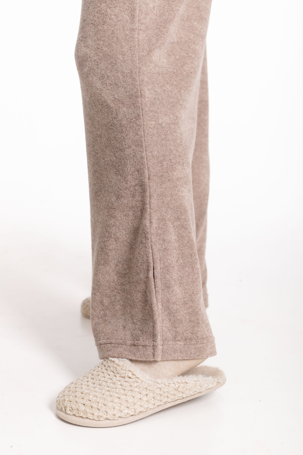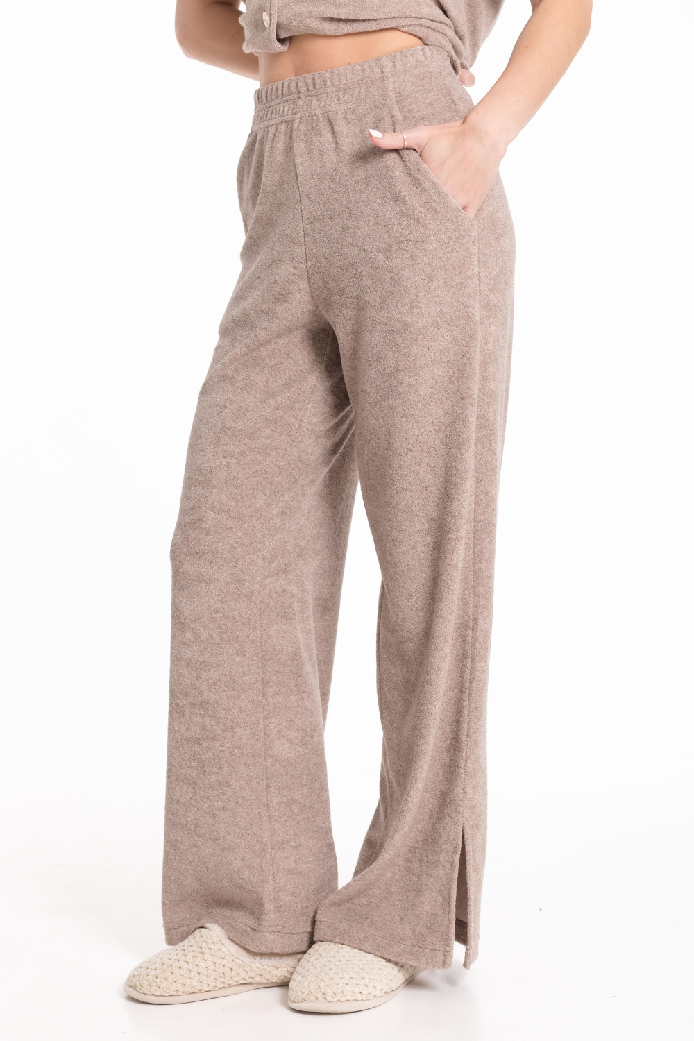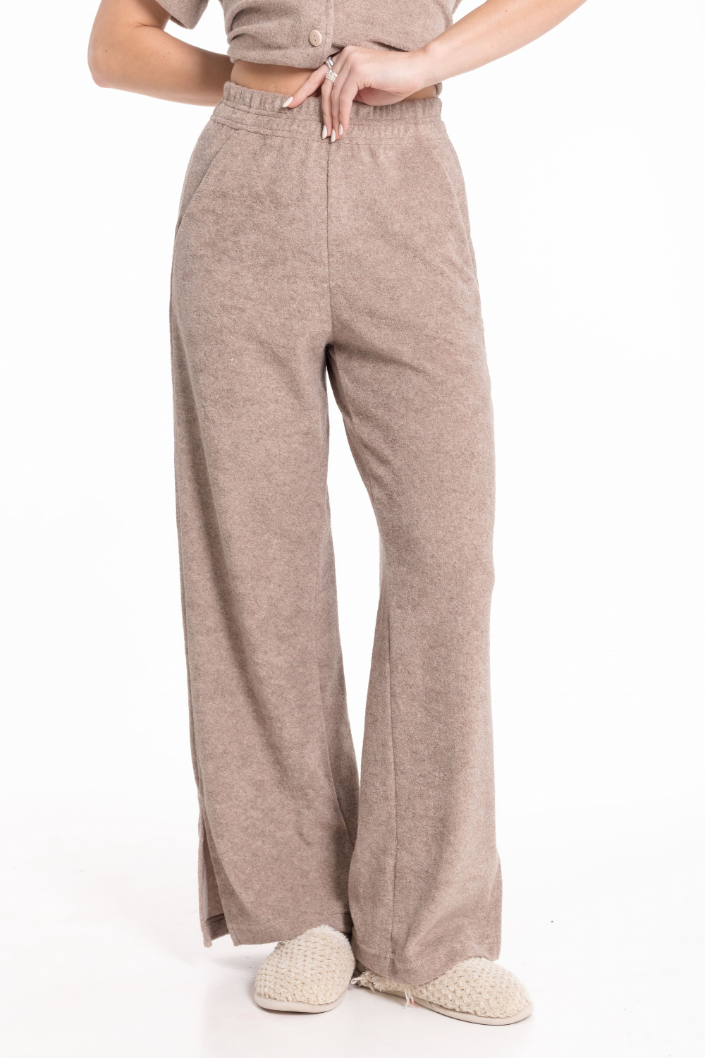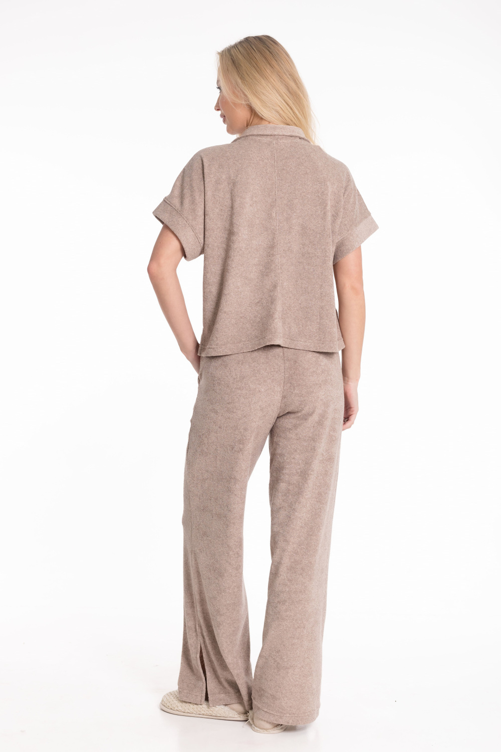 Женская пижама из однотонной махры — отличный выбор для повседневной носки. Рубашка свободного силуэта с цельнокроеным коротким рукавом и застёжкой на пуговицах обеспечивает свободу движений. Отложной воротник, боковые разрезы и накладной карман на полочке придают изделию оригинальность. Брюки с боковыми карманами и поясом на резинке обеспечивают комфортную посадку. Разрезы по бокам внизу штанин не сковывают движения. Изготовленная из натуральной ткани пижама обеспечит комфорт в течение всего дня.