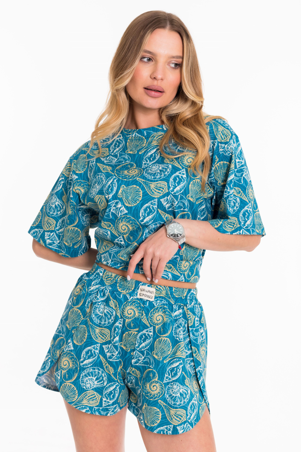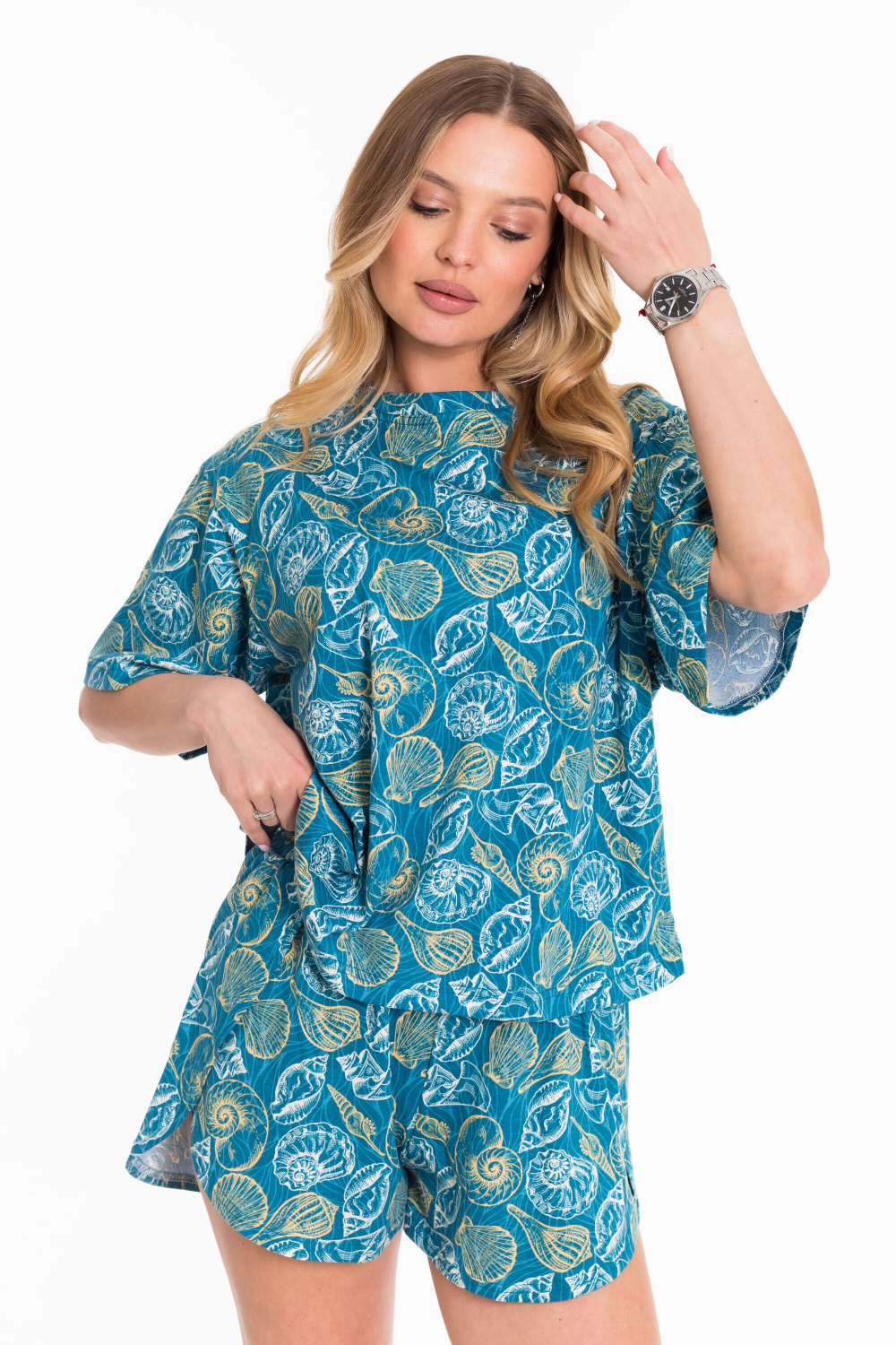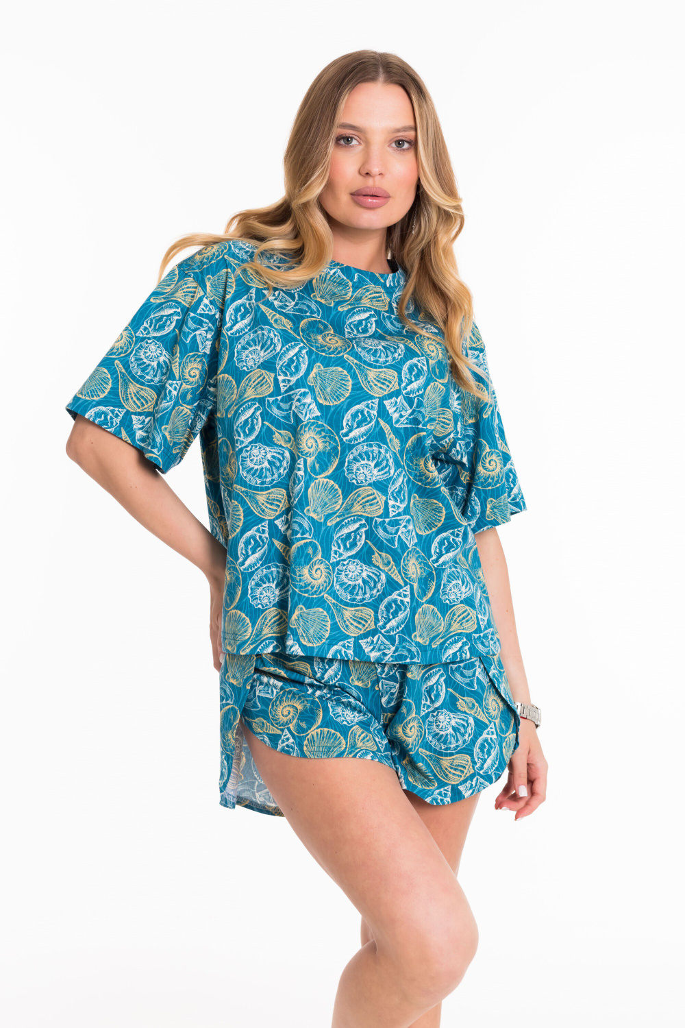 Пижама выполнена из хлопкового полотна. Футболка укороченная, слегка свободная, с коротким рукавом и круглым вырезом горловины, обработанным планкой. Шорты свободного силуэта с поясом на резине, на запах в боковой части.