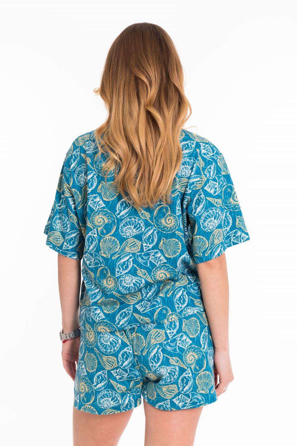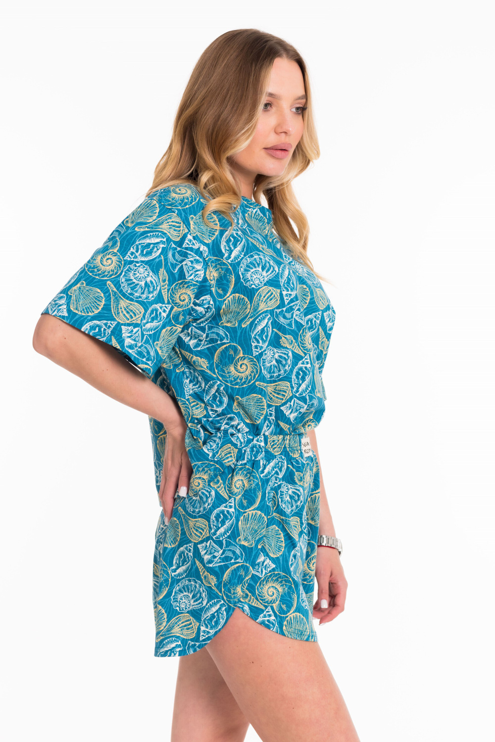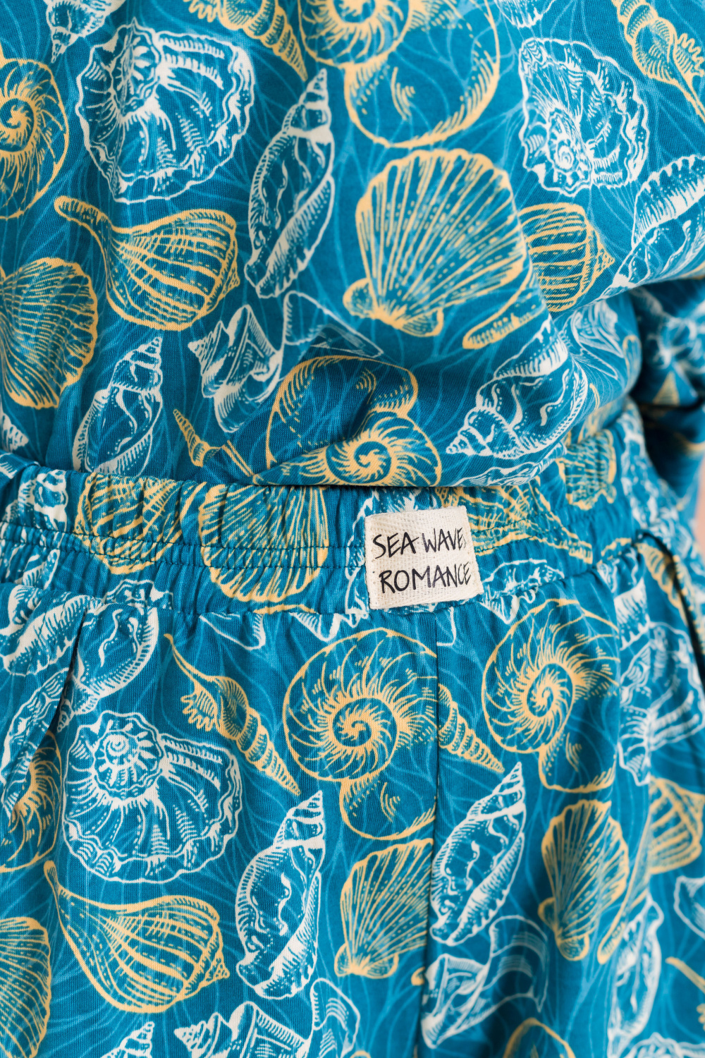 Пижама выполнена из хлопкового полотна. Футболка укороченная, слегка свободная, с коротким рукавом и круглым вырезом горловины, обработанным планкой. Шорты свободного силуэта с поясом на резине, на запах в боковой части.