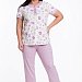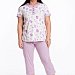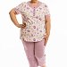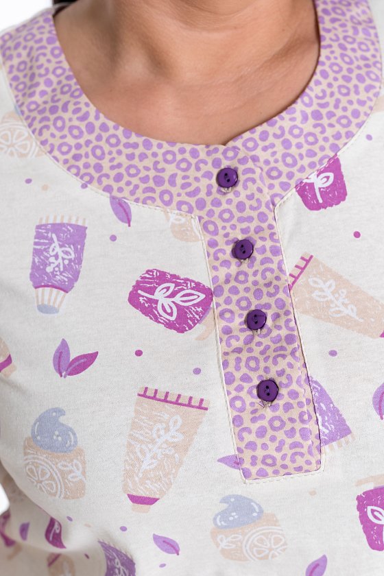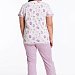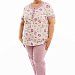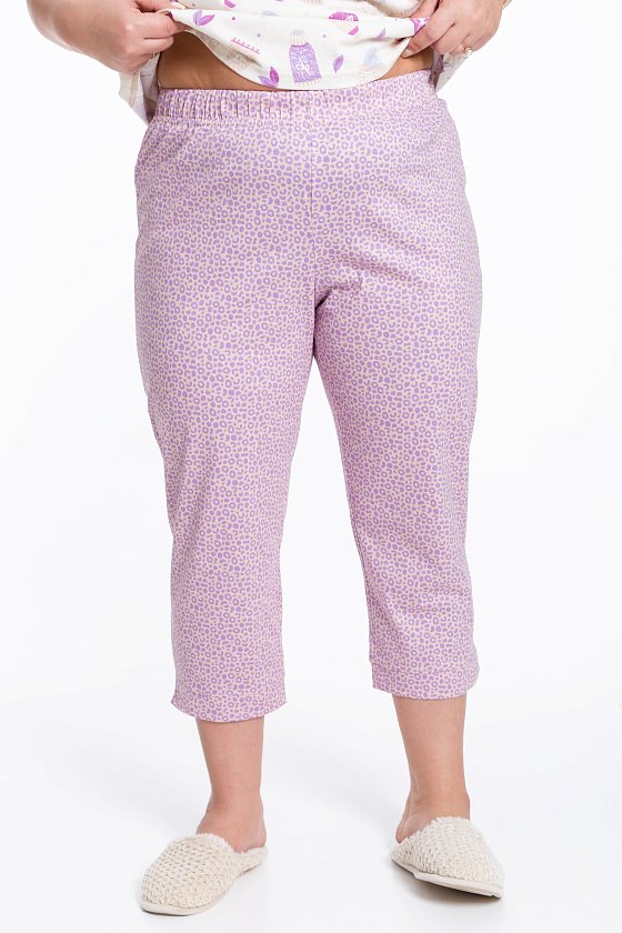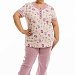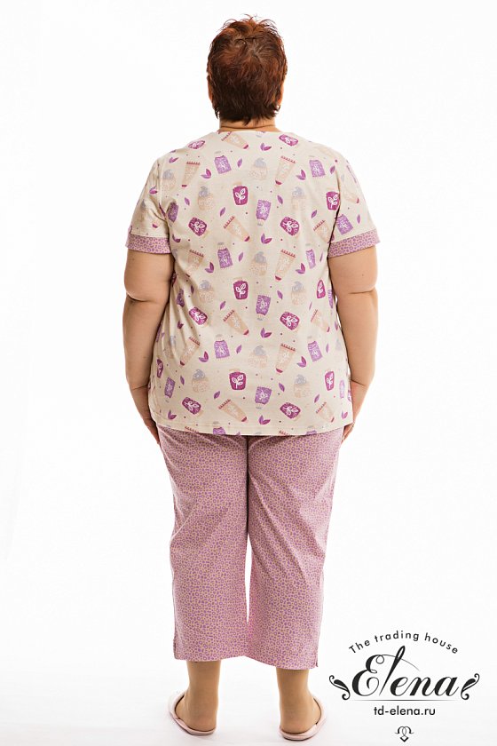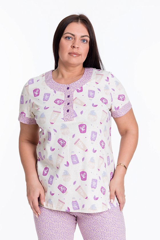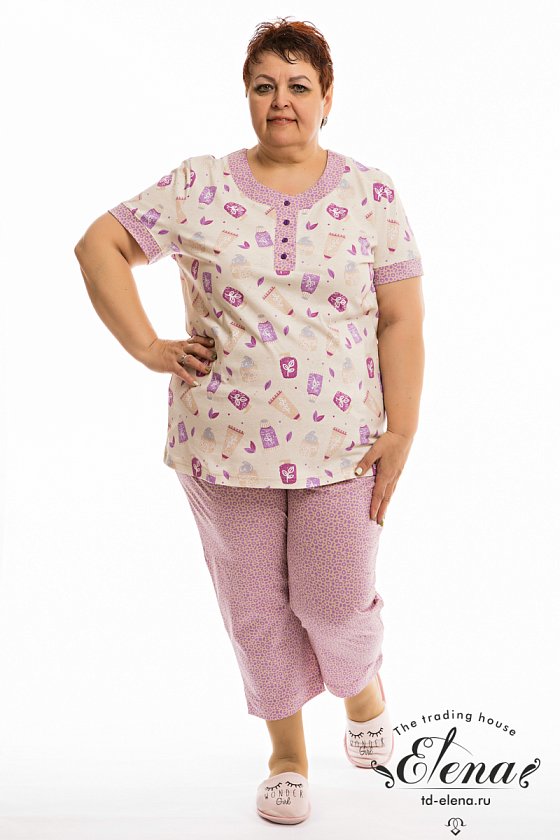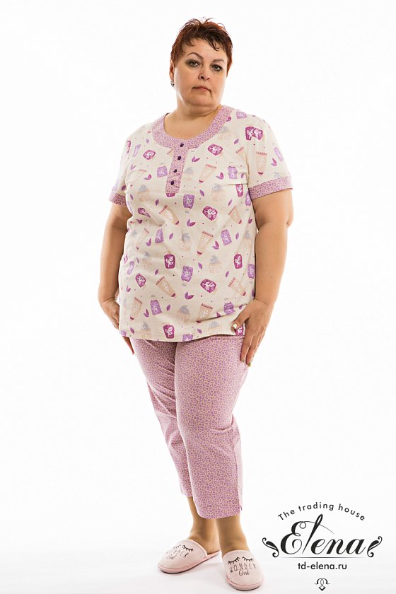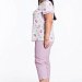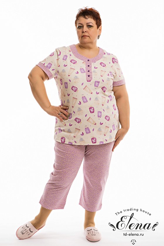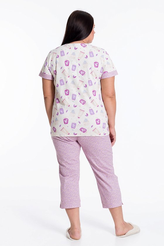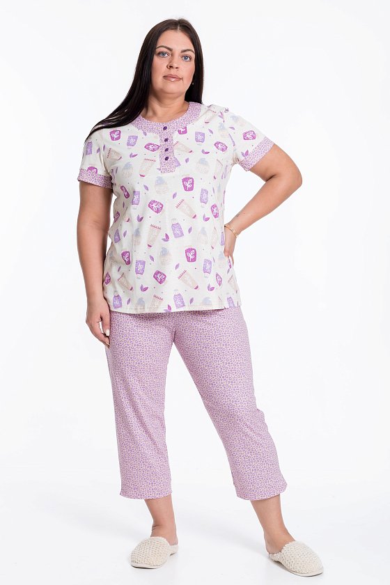 Пижама из кулирки, 100% хлопок, состоит из футболки с коротким рукавом на манжете и капри. Спереди фигурная планка с застёжкой на пуговицы. Капри с поясом на резине, внизу по бокам небольшие разрезы.