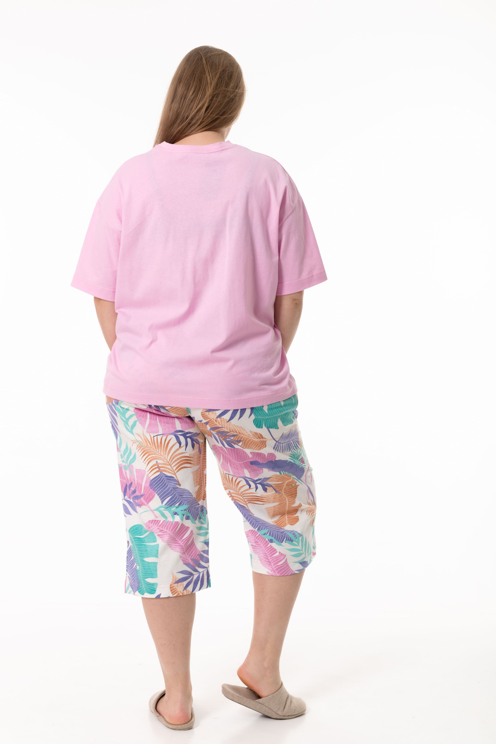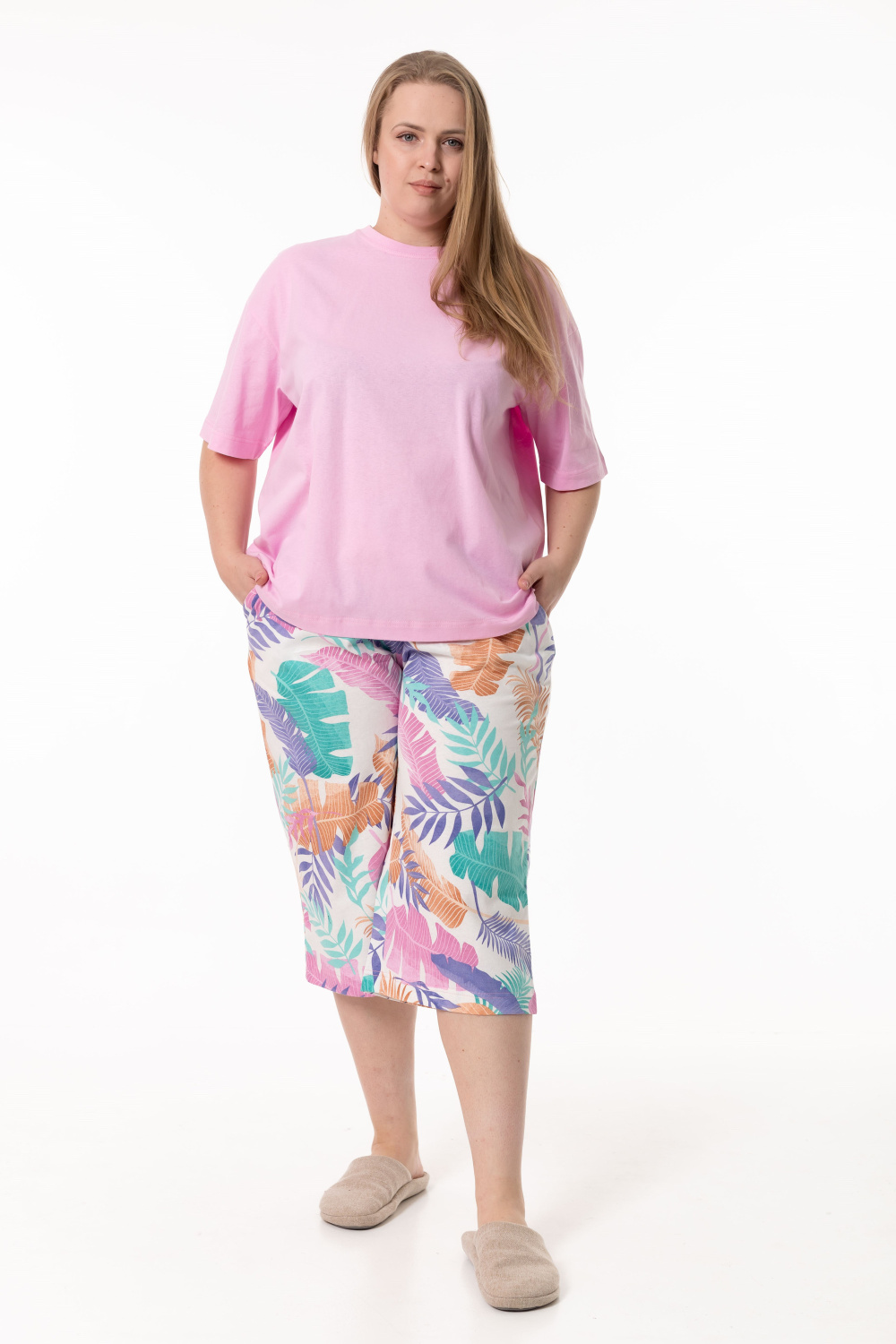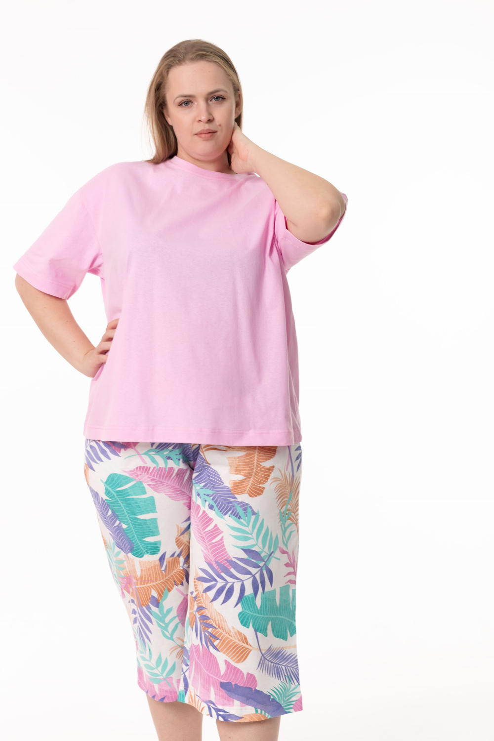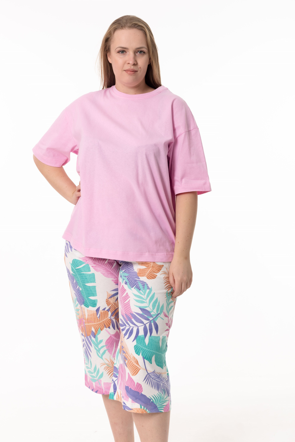 Пижама выполненная из кулирки и состоящая из футболки и капри — комфортный и свободный комплект для сна и домашнего отдыха. Футболка из однотонной кулирки легкого оверсайз кроя со спущенным рукавом длиной до локтя. Капри из набивной кулирки с цельнокроенным широким поясом, боковыми карманами и расклешенным силуэтом книзу обеспечивают удобство и комфорт.