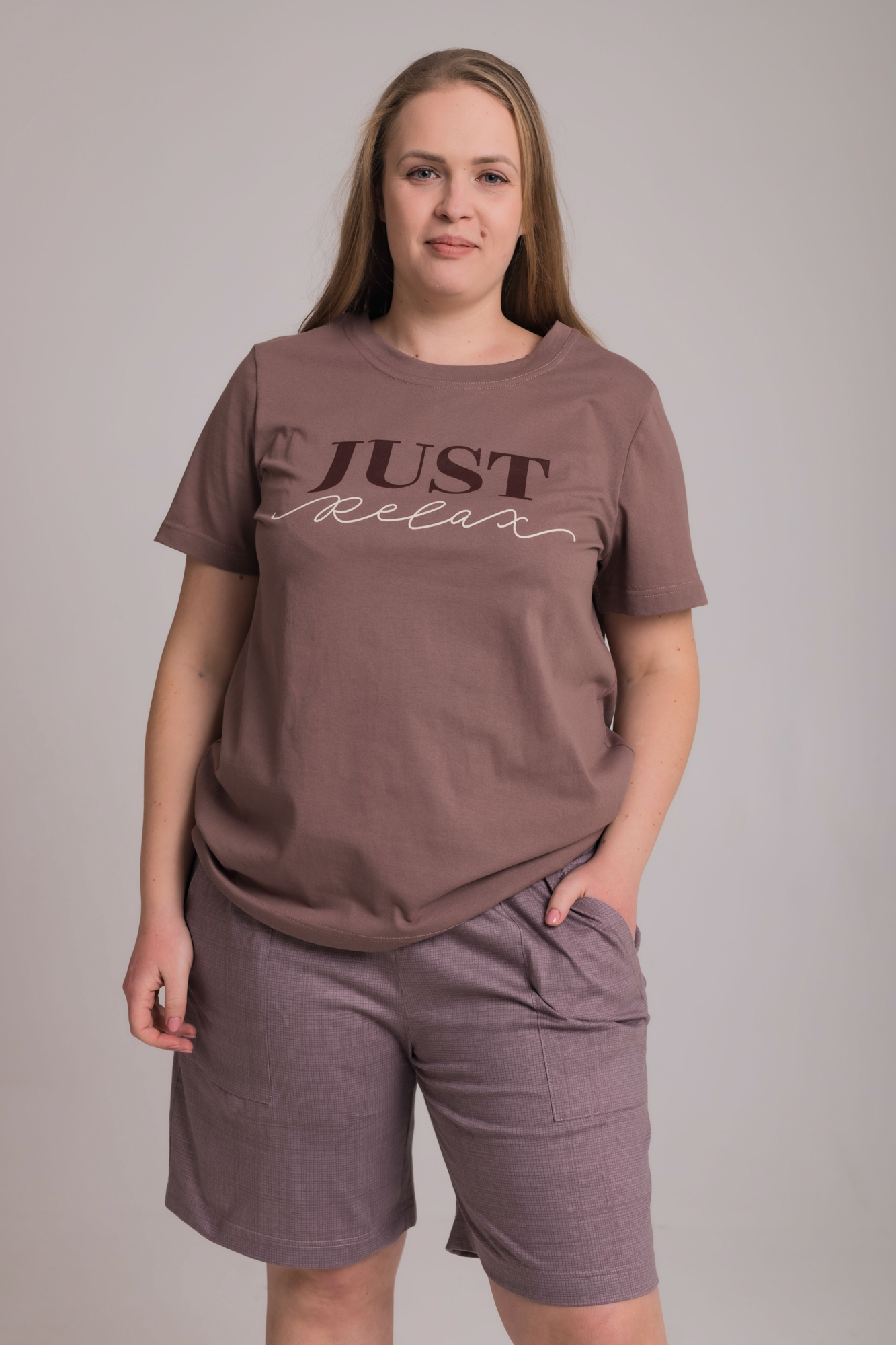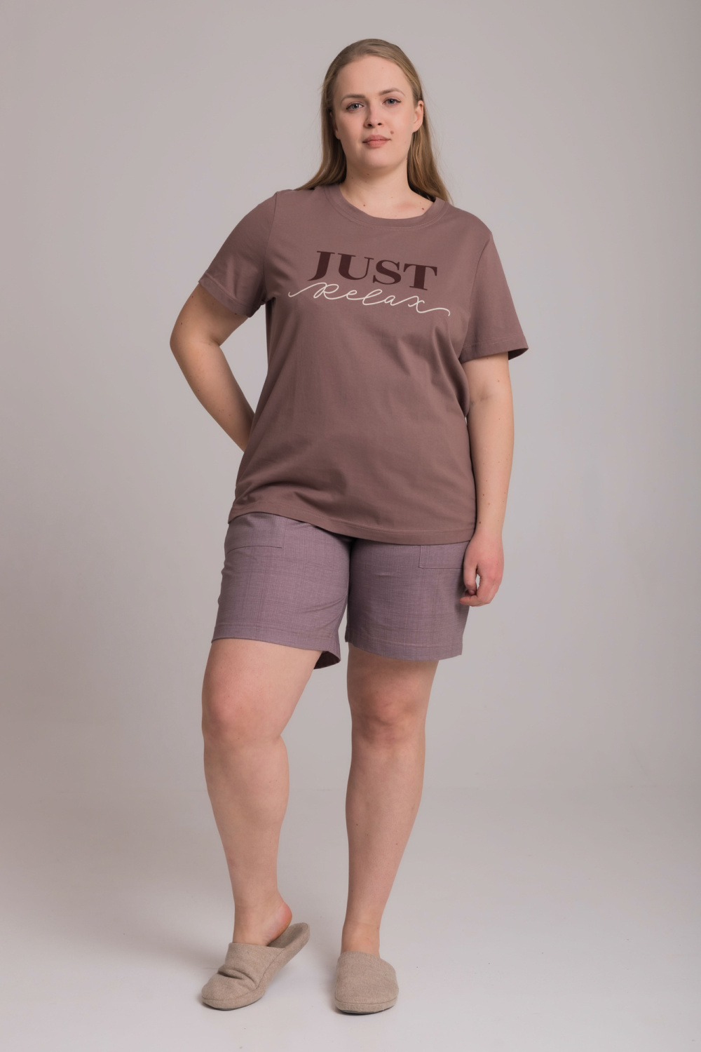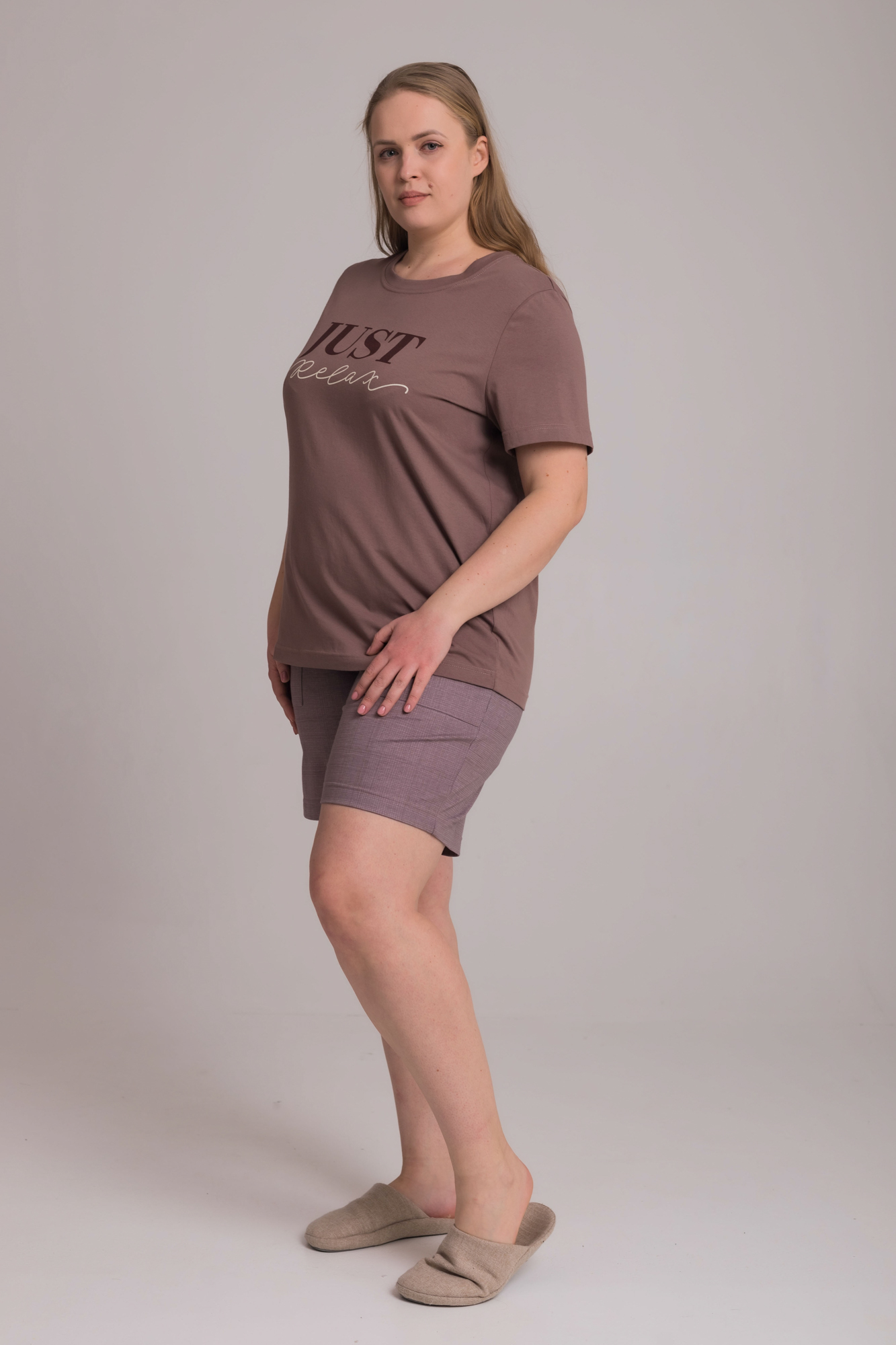 Женская пижама включает в себя футболку и шорты, выполненные из хлопкового полотна. Футболка прямого кроя с принтом, коротким рукавом и круглым вырезом горловины обеспечивает комфорт и свободу движений. Шорты с поясом на широкой резинке, обеспечивают идеальную посадку и удобство. Такой дизайн позволяет свободно двигаться и чувствовать себя комфортно даже во время сна.