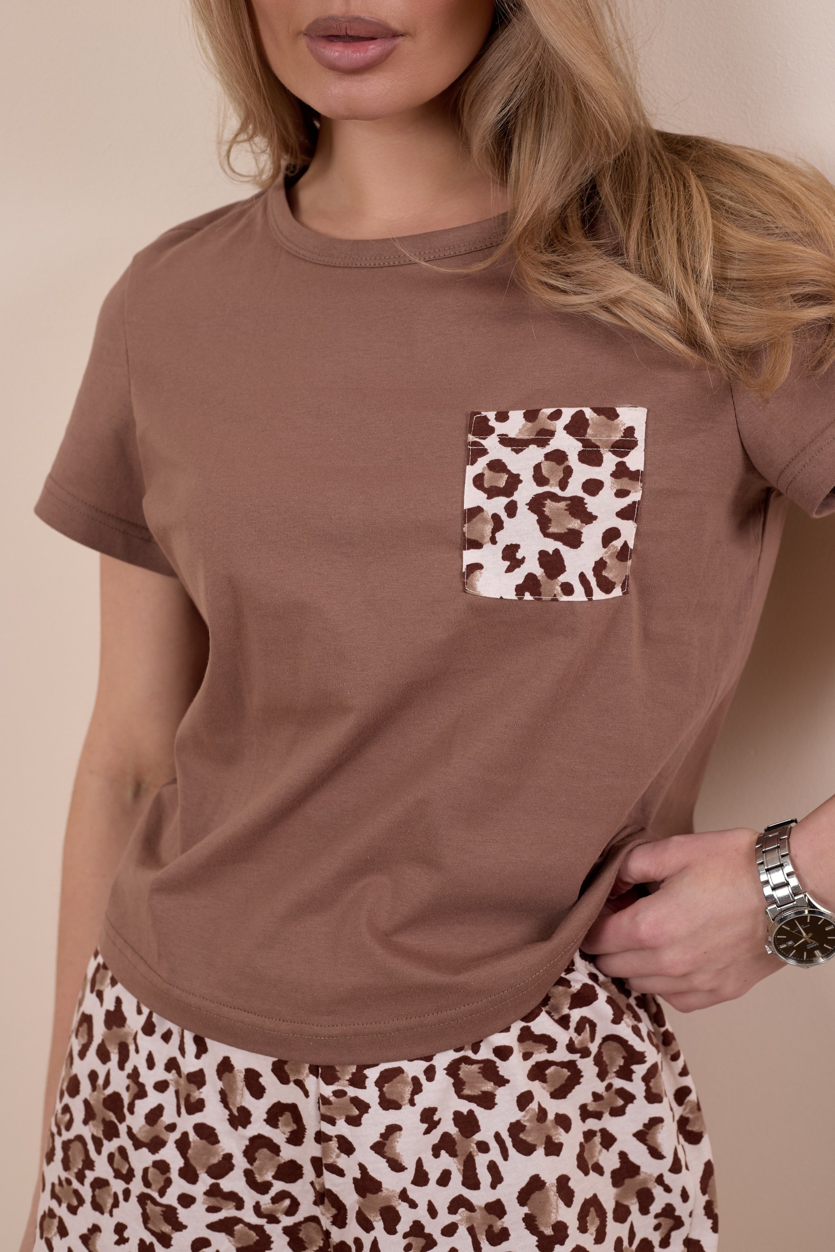 Пижама состоит из футболки и шорт. Футболка однотонная с коротким втачным рукавом. Горловина обработана бейкой. На футболке размещен карман из отделочного полотна. Шорты с цельнокроенным поясом на резине, без карманов. Шорты с высокой посадкой, выполнены из отделочного полотна.