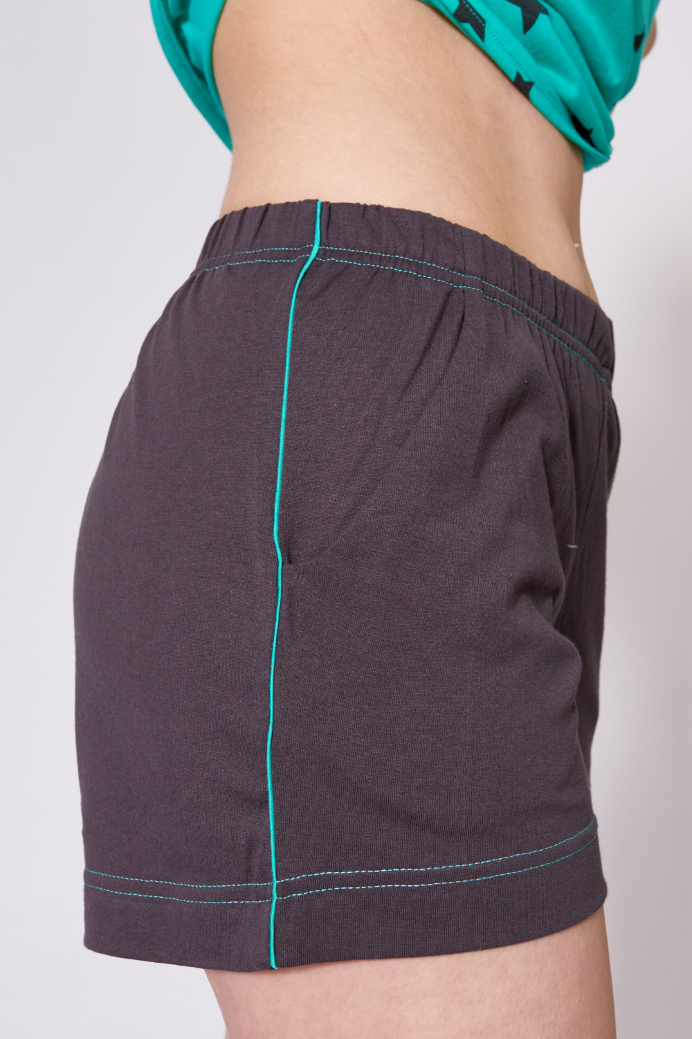 Комплект выполнен из кулирки, 100% хлопок. Футболка из полотна с набивным рисунком, шорты однотонные. Срезы пройм и ростка футболки обработаны бейкой, шов планки по горловине выделен кантом контрастного цвета. Шорты с поясом на резине и карманами по бокам.