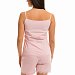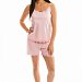 Комплект выполнен из кулирки, состоит из шорт и топа на тонких бретелях. Шорты с боковыми карманами и поясом на резине, украшенным атласной лентой. Отделкой является нежное кружево, расположенное на горловине топа и по низу шорт.