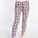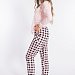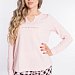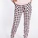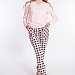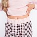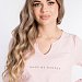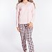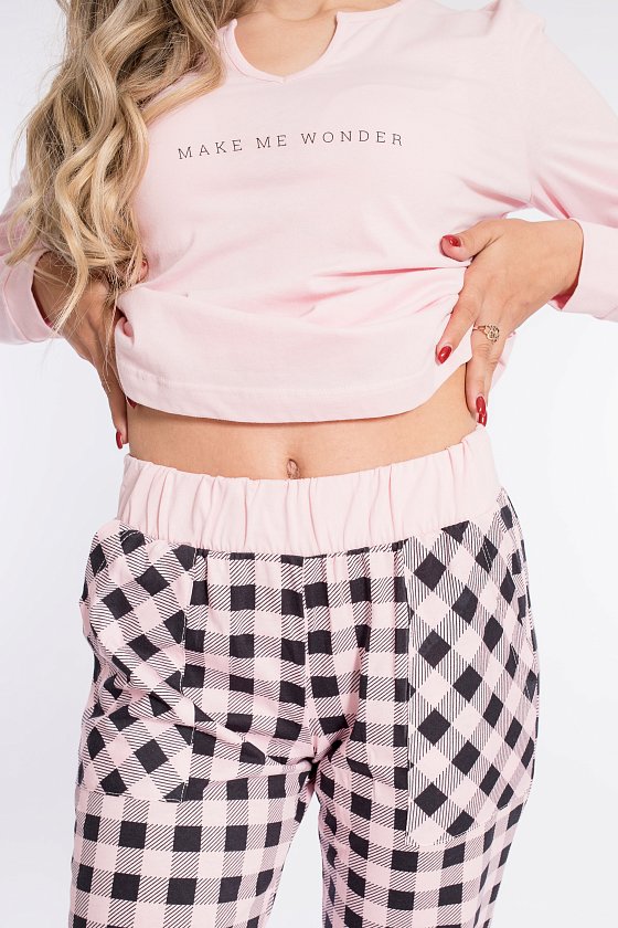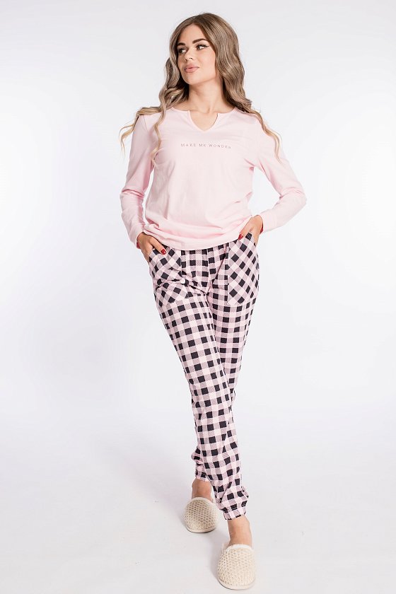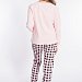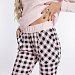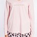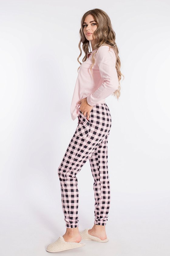 Женский комплект выполнен из кулирки. Брюки с набивным рисунком и накладными карманами по бокам. Пояс и низ брюк на резинке. Футболка однотонная, с принтом спереди и длинным рукавом на манжете. Вырез горловины фигурный.