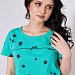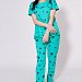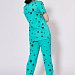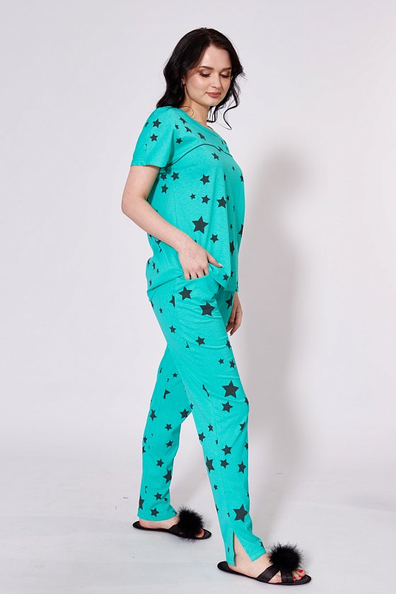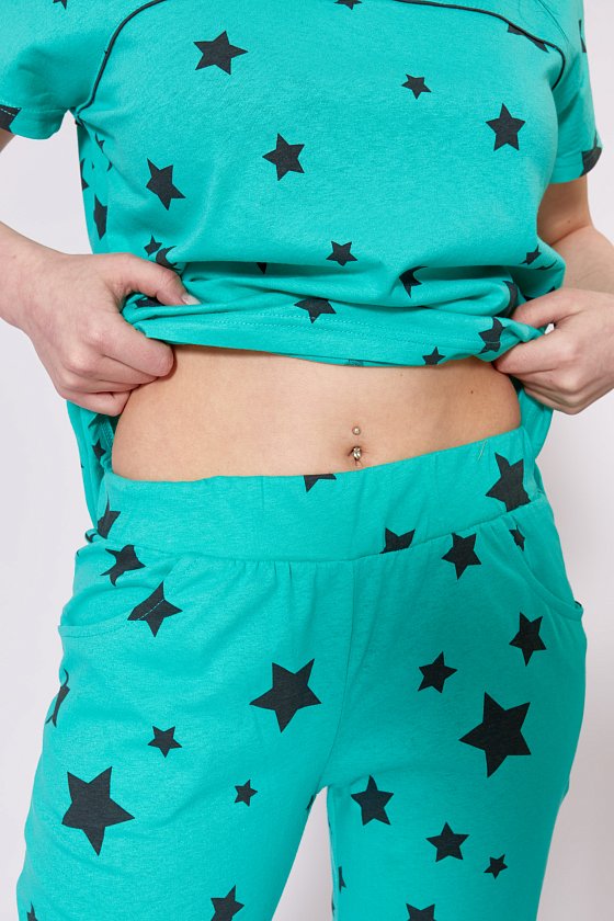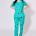 Комплект из кулирки с набивным рисунком, 100% хлопок. Футболка с округлым вырезом горловины и коротким рукавом. Низ футболки ранзоуровневый, с декоративными разрезами по бокам. Брюки с поясом на резинке и карманами по бокам, внизу декоративные разрезы.
