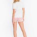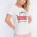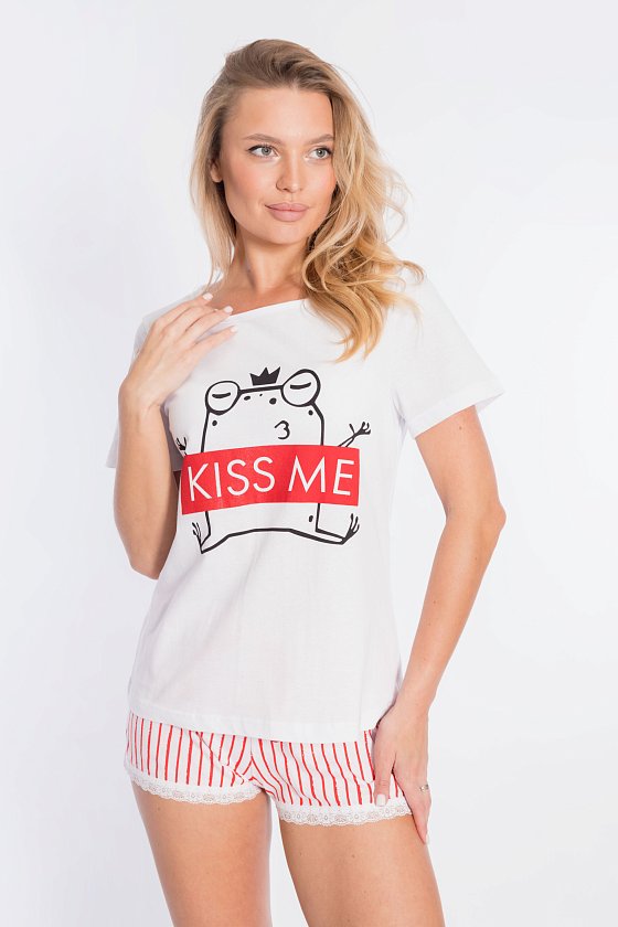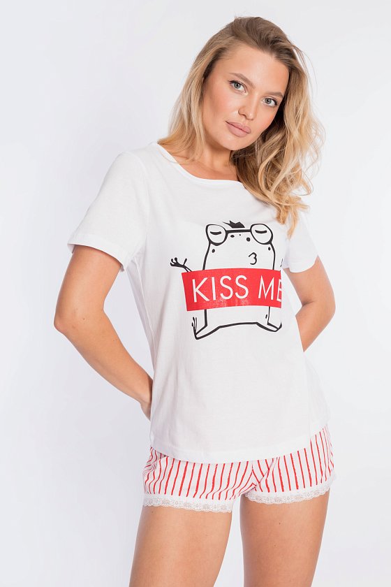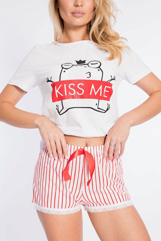 Комплект состоит из шорт и футболки, выполненных из хлопкового полотна. Футболка однотонная, с коротким рукавом и принтом спереди. Шорты из кулирки с рисунком в полоску, пояс на резинке, в качестве декора атласная лента. По низу шорты с отделкой кружевом.