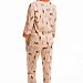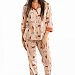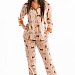 Комплект выполнен из кулирки с набивным рисунком с отделкой из однотонного полотна. Рубашка с отложным воротником и бортами, с рукавом длиной 3/4 и разрезами в боковых швах. Воротник, борта и манжеты рукавов из отделочного полотна. Спереди застёжка на пуговицы. Брюки с боковыми карманами, притачным поясом и отделочными манжетами.