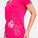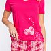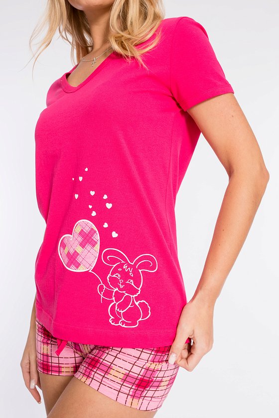Комплект выполнен из х/б полотна. Футболка однотонная, с принтом спереди. V-образный вырез горловины и низ рукавов футболки обработаны бейкой. Шорты выполнены из полотна с набивным рисунком, на поясе настрочен бантик.