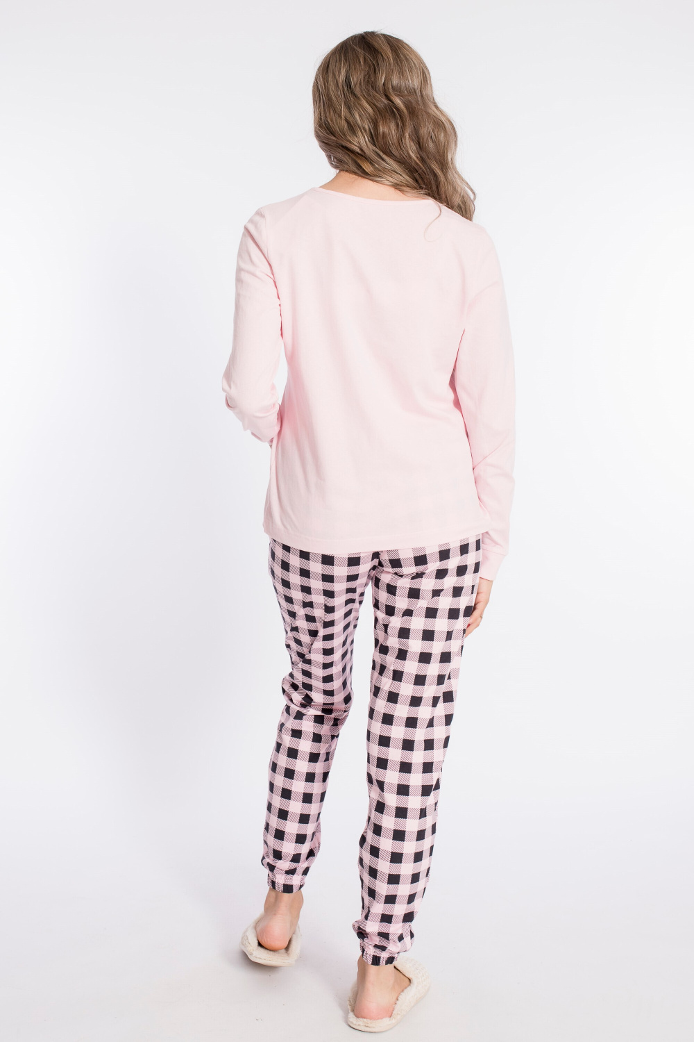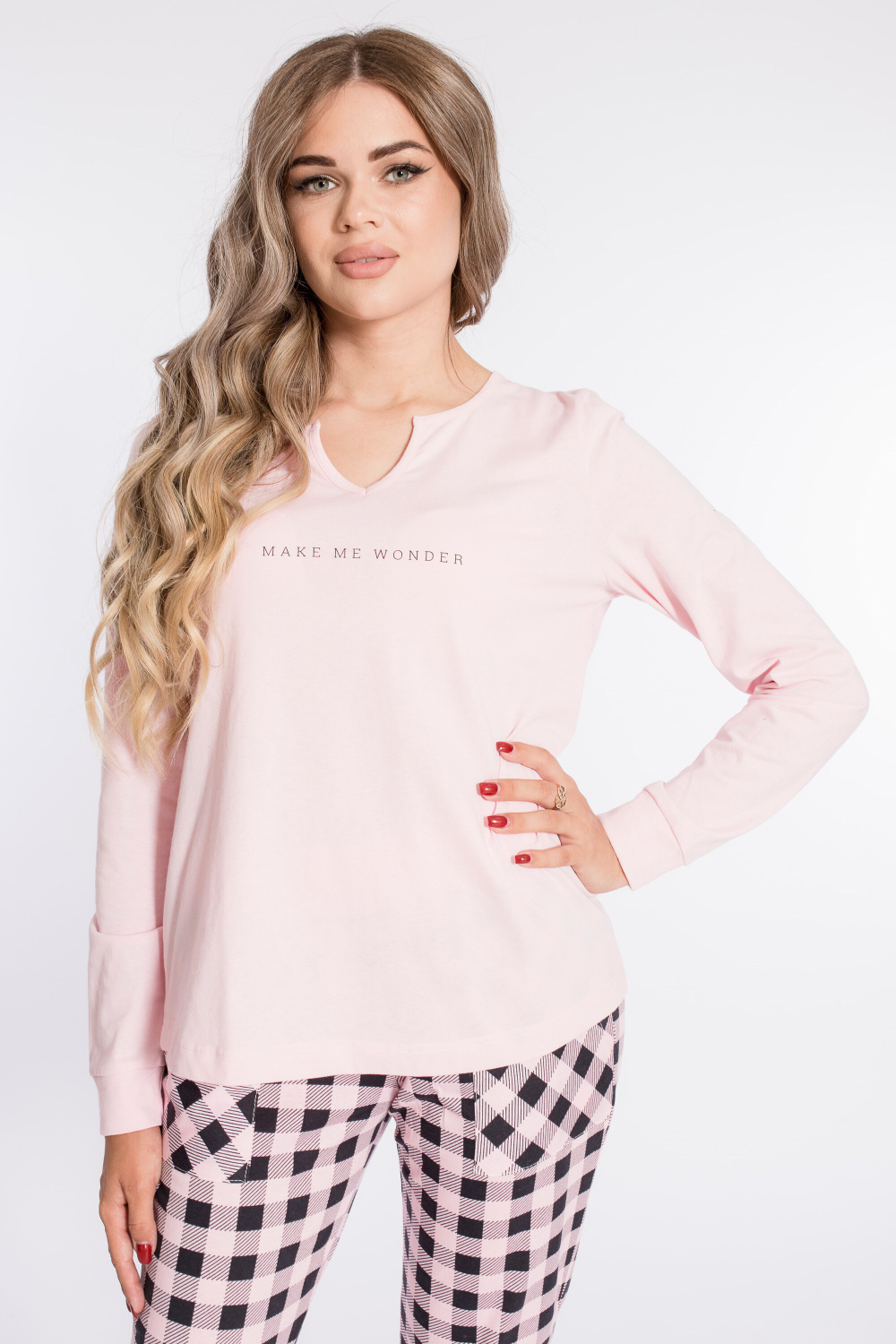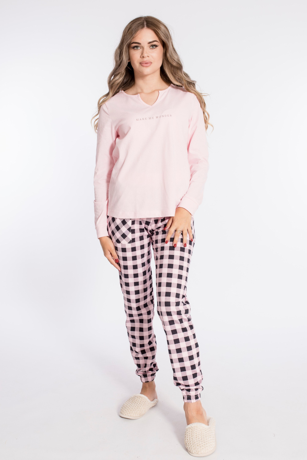Женский комплект выполнен из кулирки. Брюки с набивным рисунком и накладными карманами по бокам. Пояс и низ брюк на резинке. Футболка однотонная, с принтом спереди и длинным рукавом на манжете. Вырез горловины фигурный.