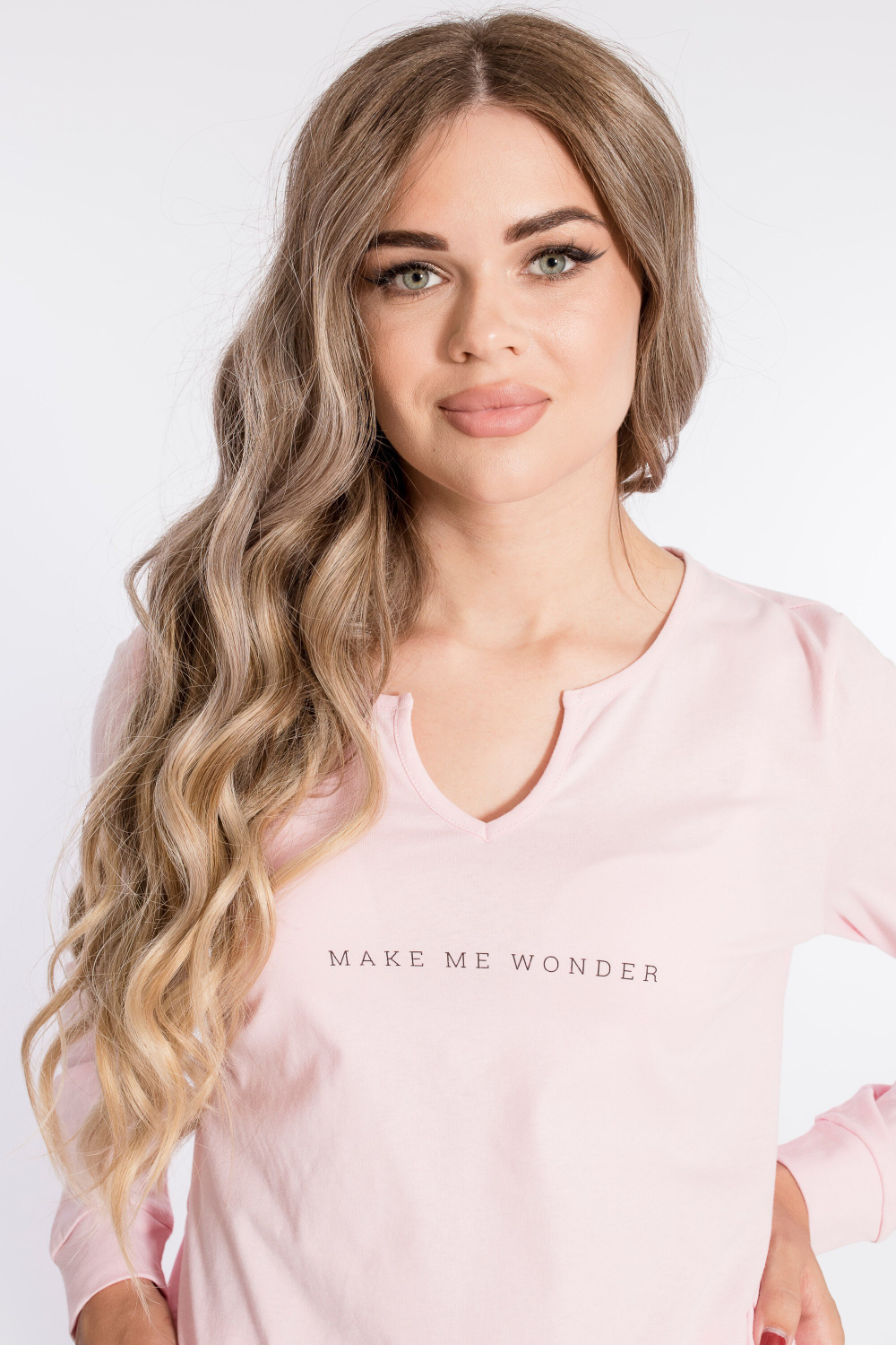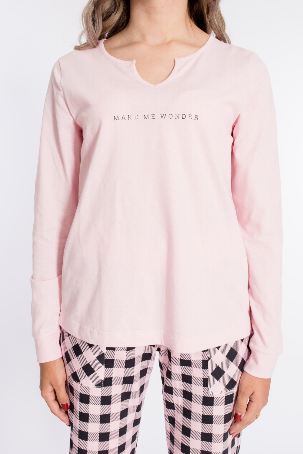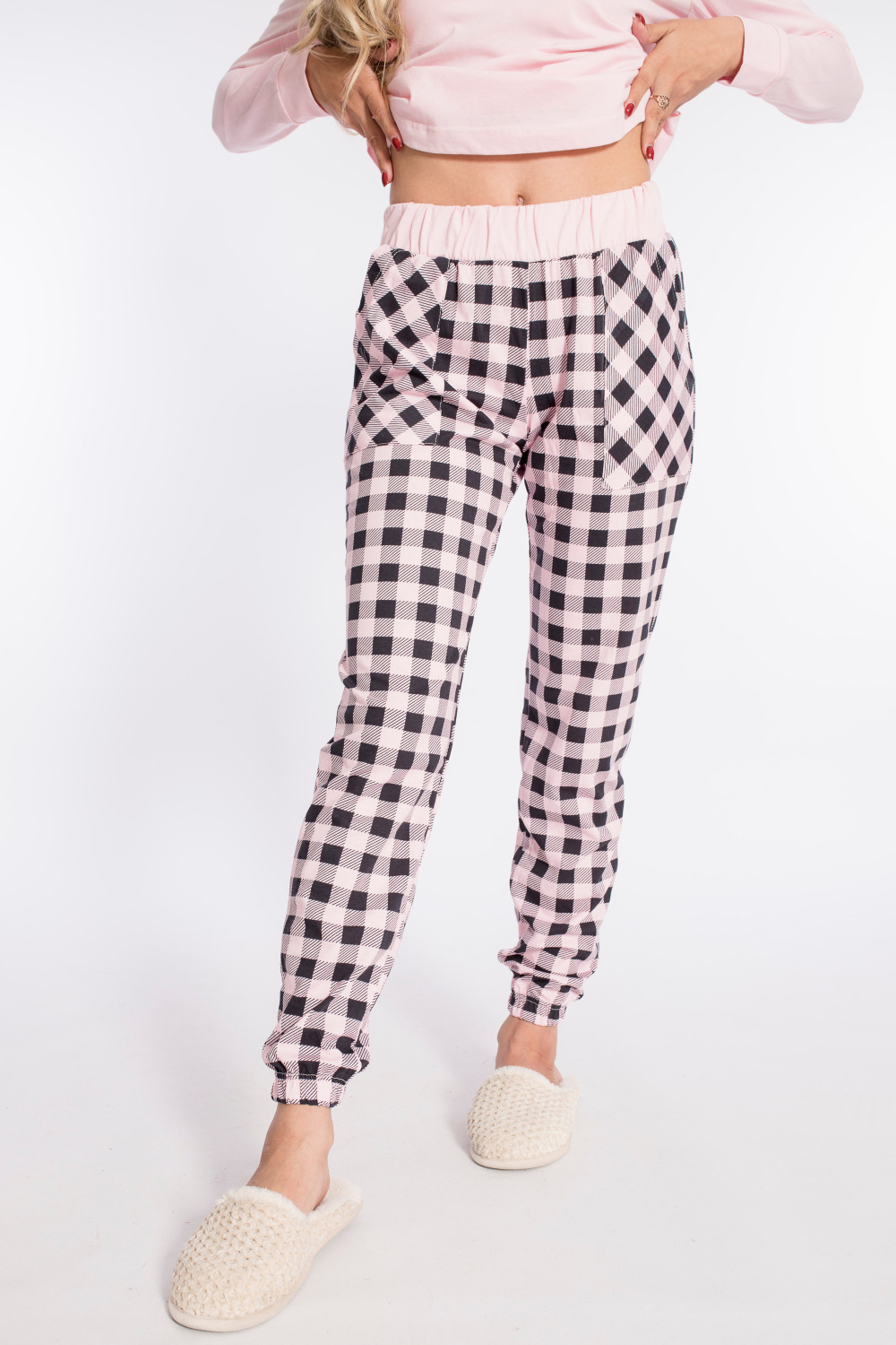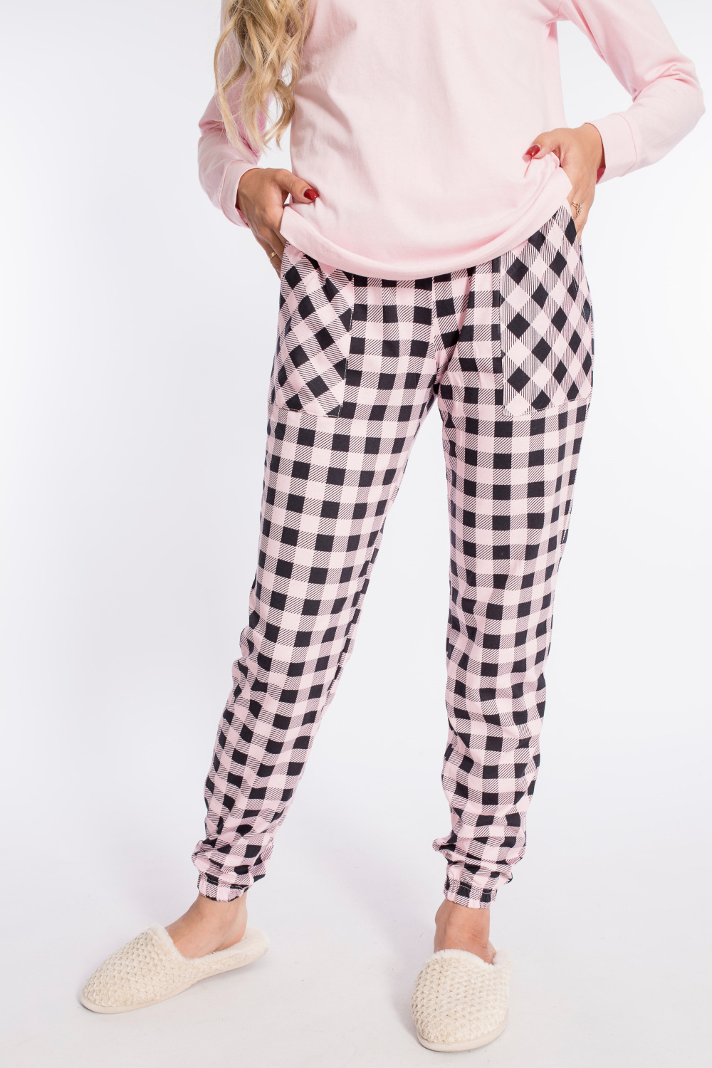 Женский комплект выполнен из кулирки. Брюки с набивным рисунком и накладными карманами по бокам. Пояс и низ брюк на резинке. Футболка однотонная, с принтом спереди и длинным рукавом на манжете. Вырез горловины фигурный.