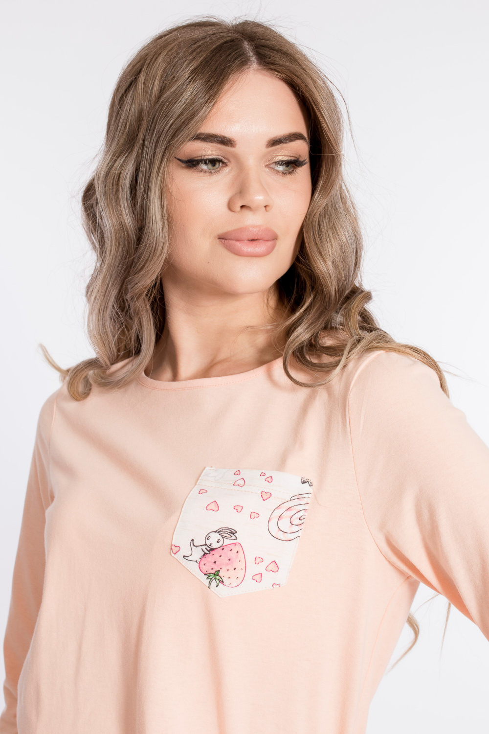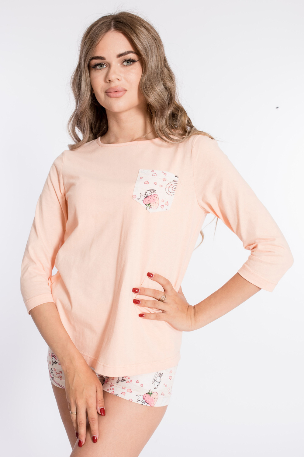 Комплект из кулирки, 100% хлопок, состоит из футболки с рукавом длиной 3/4 и шорт. Футболка с втачным рукавом, горловиной "лодочка" и карманом спереди. Шорты короткие, с боковыми карманами и поясом на резине.