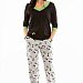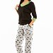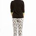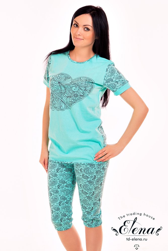Комплект состоит из брюк и футболки с рукавом 3/4. Брюки из кулирки, с боковыми карманами и поясом на резинке. Посередине пояса декоративный бант в цвет футболки и канта карманов. Футболка с термопринтом и V-образным вырезом, по краю которого пришито кружево, также отделка кружевом по низу рукавов.