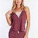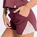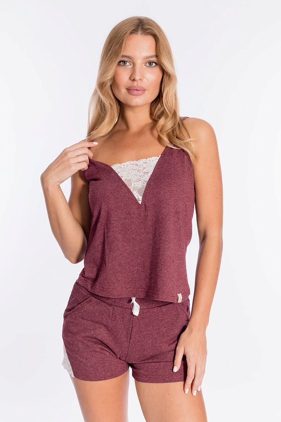 Комплект из меланжированной кулирки, 100% хлопок, состоит из шорт и топа. Шорты с притачным поясом и боковыми карманами. Отделкой служат треугольники из кружева на топе и шортах.