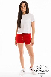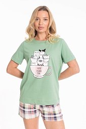 Комплект из меланжированной кулирки, 100% хлопок, состоит из шорт и топа. Шорты с притачным поясом и боковыми карманами. Отделкой служат треугольники из кружева на топе и шортах.
