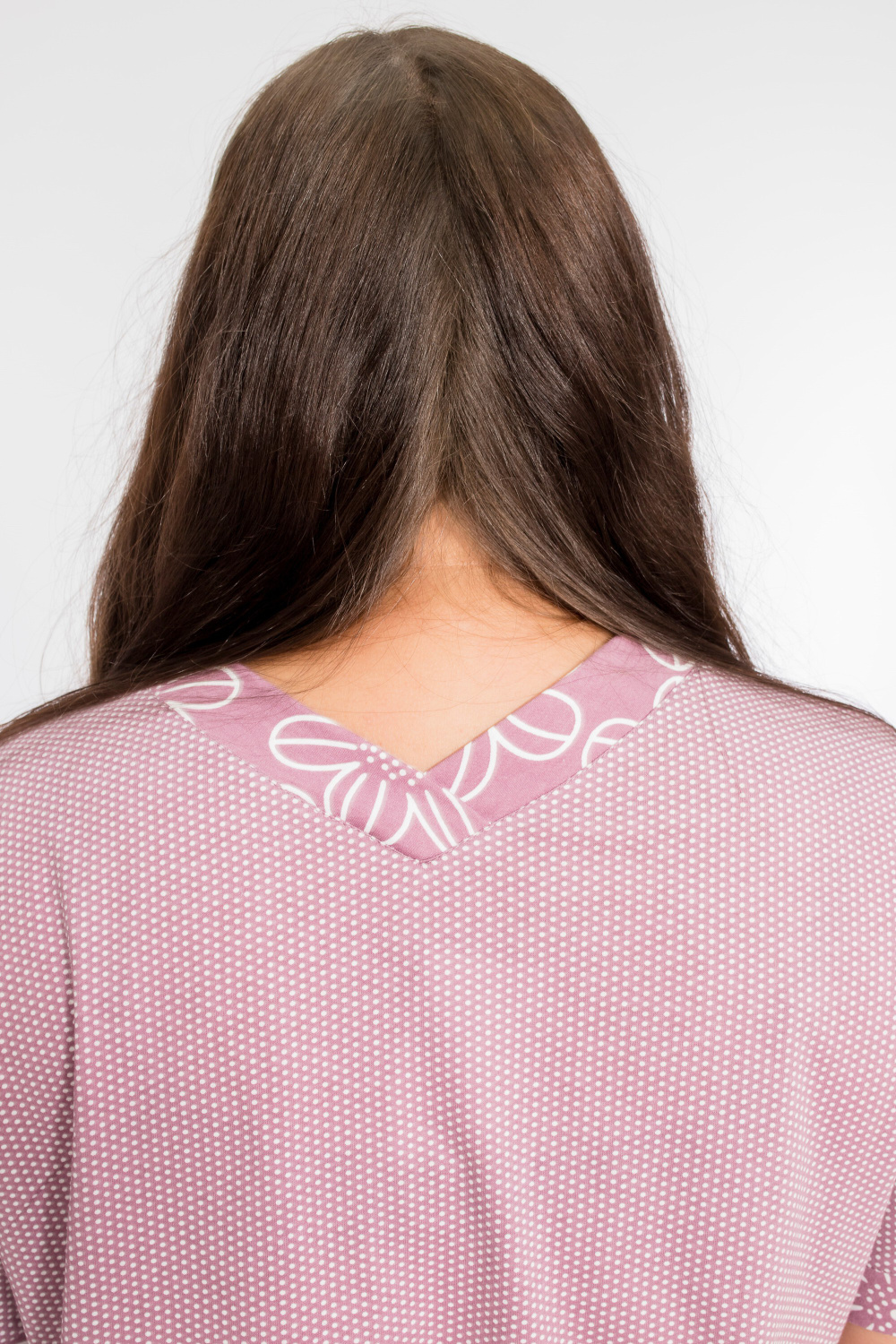 Пижама выполнена из кулирки, 100% хлопок. Футболка с принтом и коротким рукавом на манжете. Горловина с V-образным вырезом на полочке и спинке. Бриджи с поясом на резинке, с карманами по бокам.