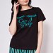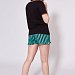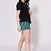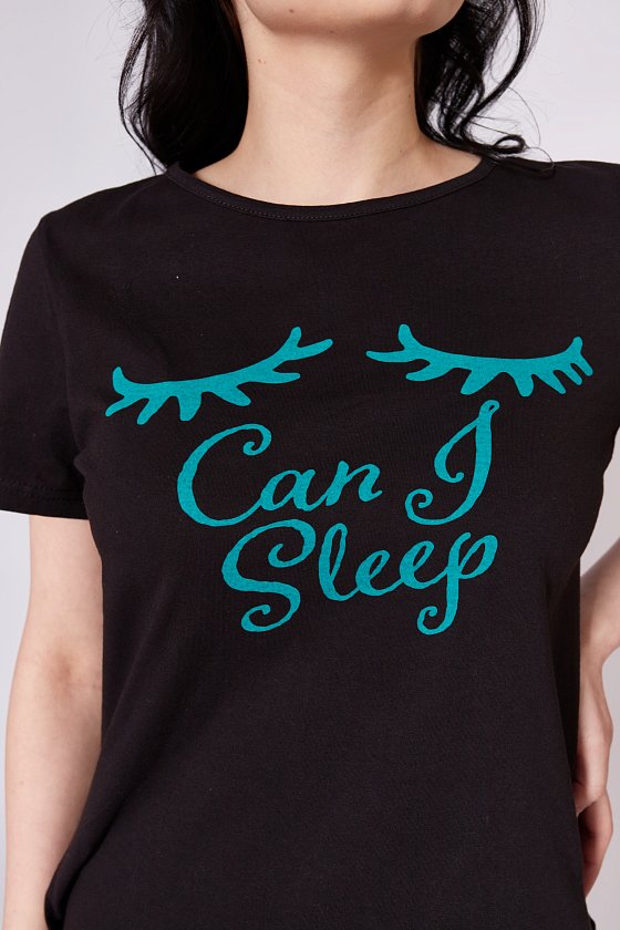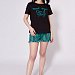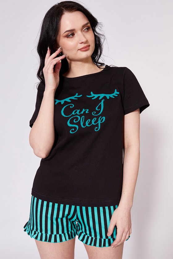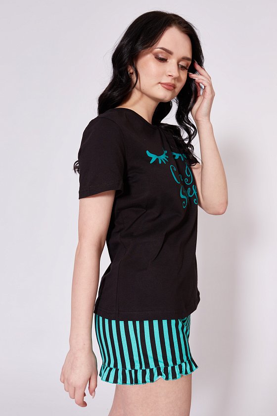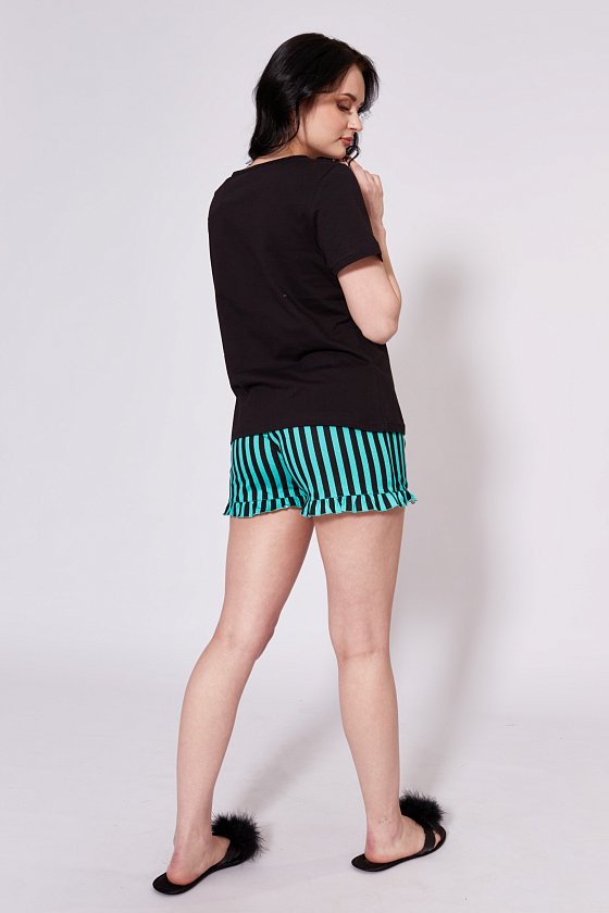 Комплект выполнен из кулирки, состоит из шорт и футболки. Шорты в вертикальную полоску, по низу с оборкой. Пояс на резинке. Футболка однотонная, с коротким рукавом и принтом спереди.