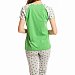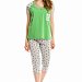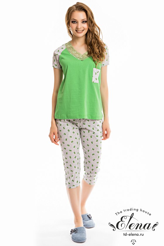 Комплект выполнен из кулирки, состоит из капри и футболки. Рукава футболки покроя реглан, горловина V-образная, оформлена эластичным кружевом. На груди расположен небольшой карман. Капри с карманами по бокам.