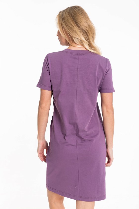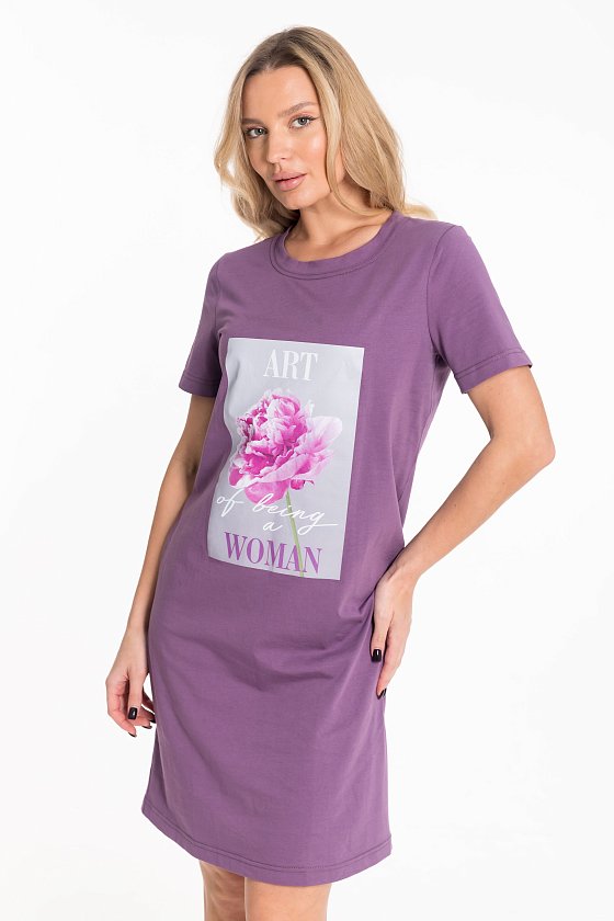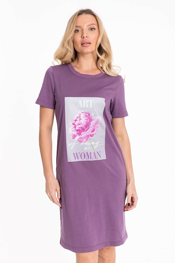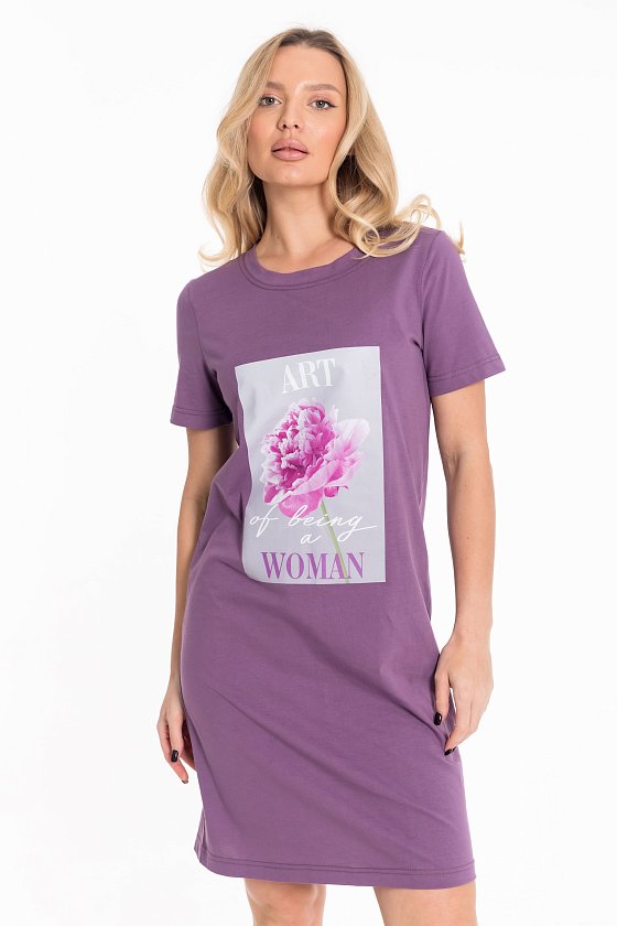 Платье выполнено из хлопкового полотна. Модель прямого кроя с короткими рукавами и круглым вырезом горловины, оформленным планкой. Спереди украшено стильным принтом, что придаёт образу яркость и индивидуальность.