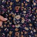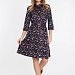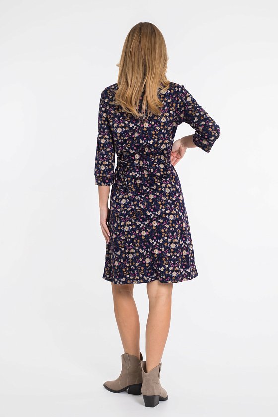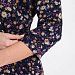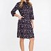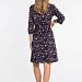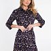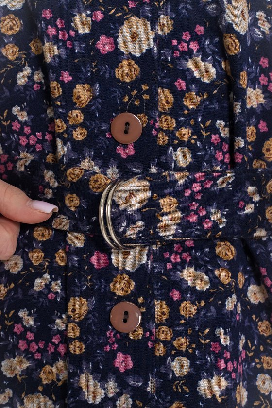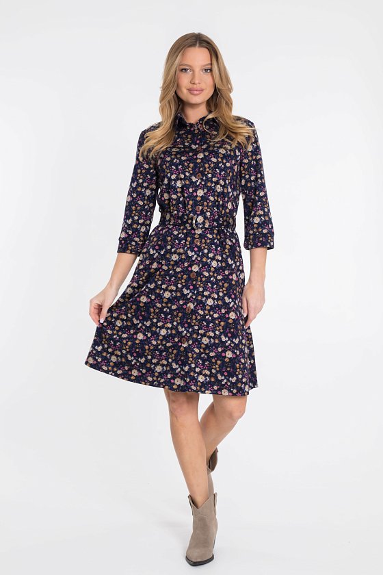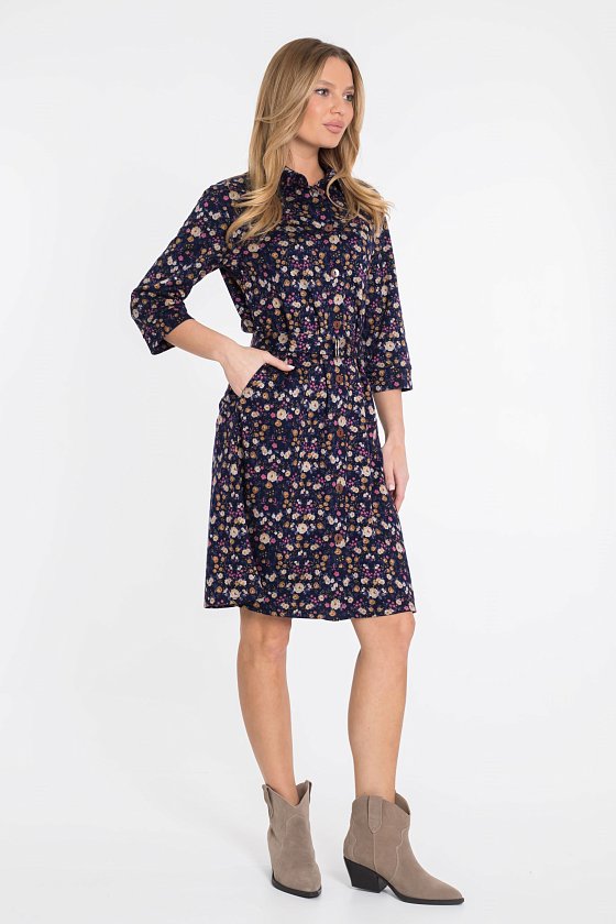 Платье выполнено из академика с набивным рисунком. Рукава длиной 3/4 и застёжка на пуговицы по всей длине изделия. Спереди и в боковых швах платья расположены карманы, линия талии подчеркивается поясом.