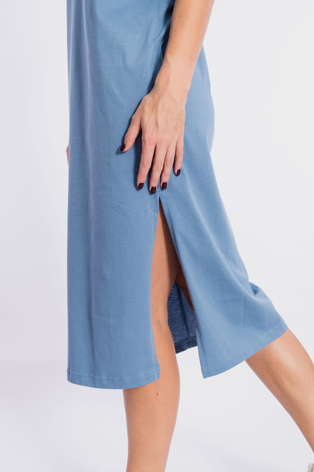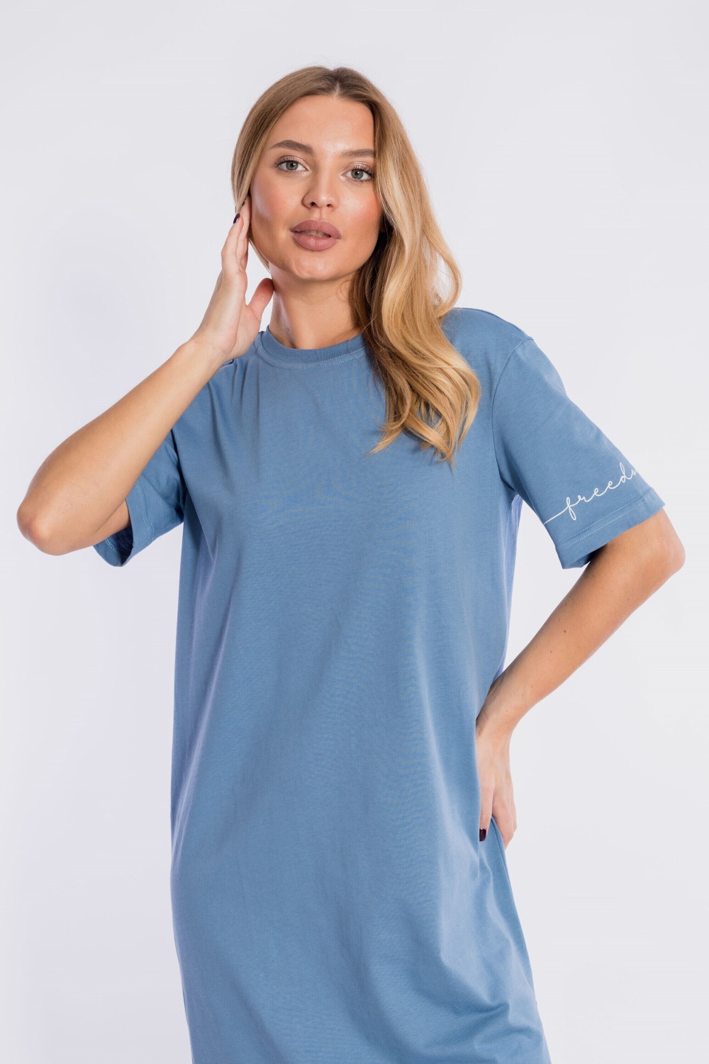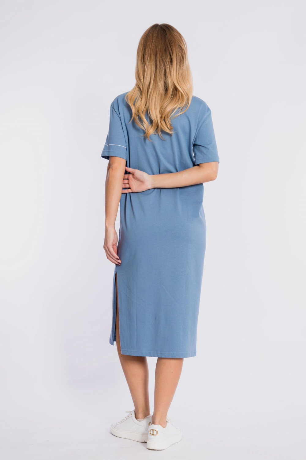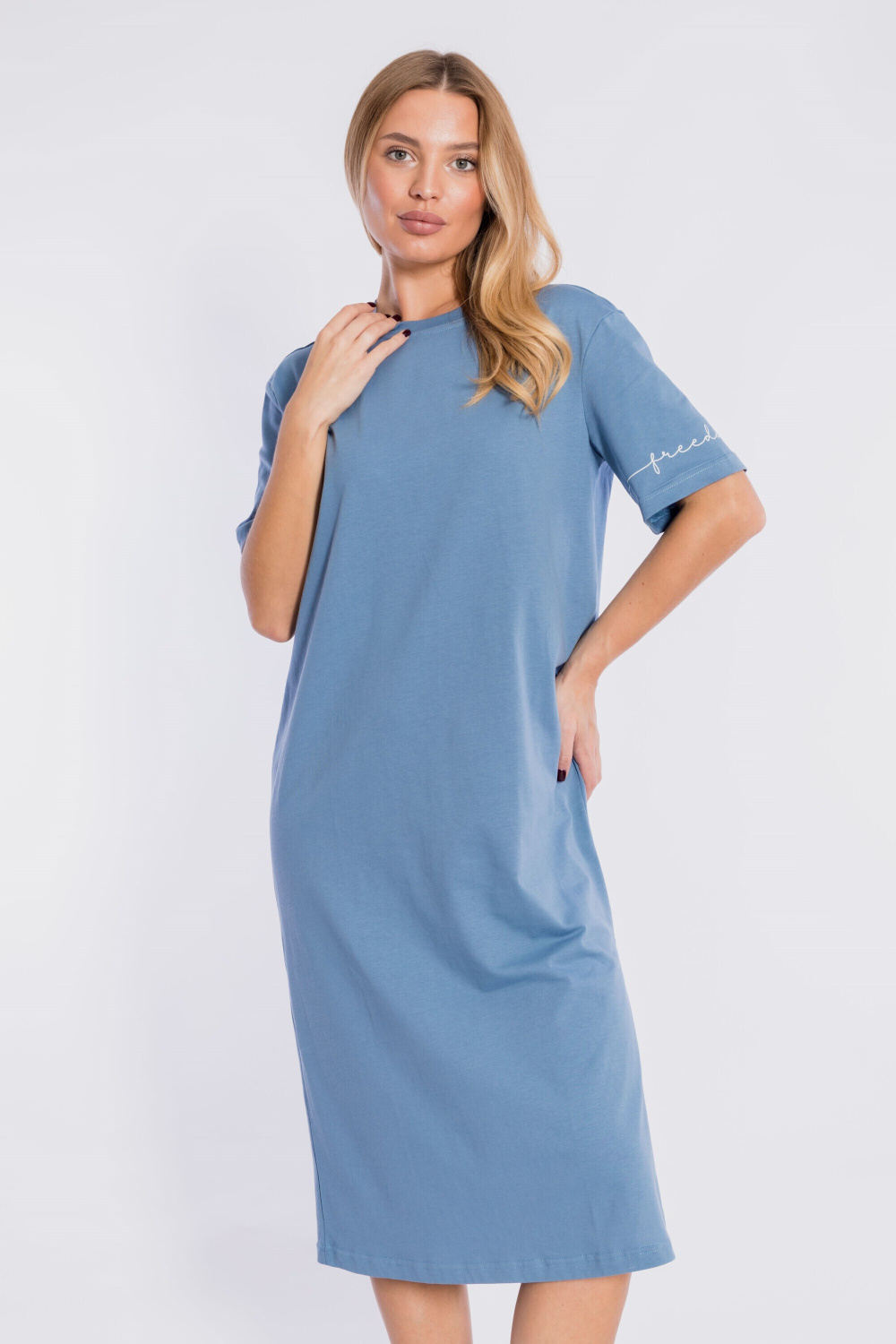Платье выполнено из хлопкового полотна. Платье свободного силуэта со спущенной линией плеча. Круглый вырез горловины оформлен планкой. Рукава длиной до локтя, на левом рукаве нанесён принт. Внизу изделия, в левом боковом шве расположен разрез.