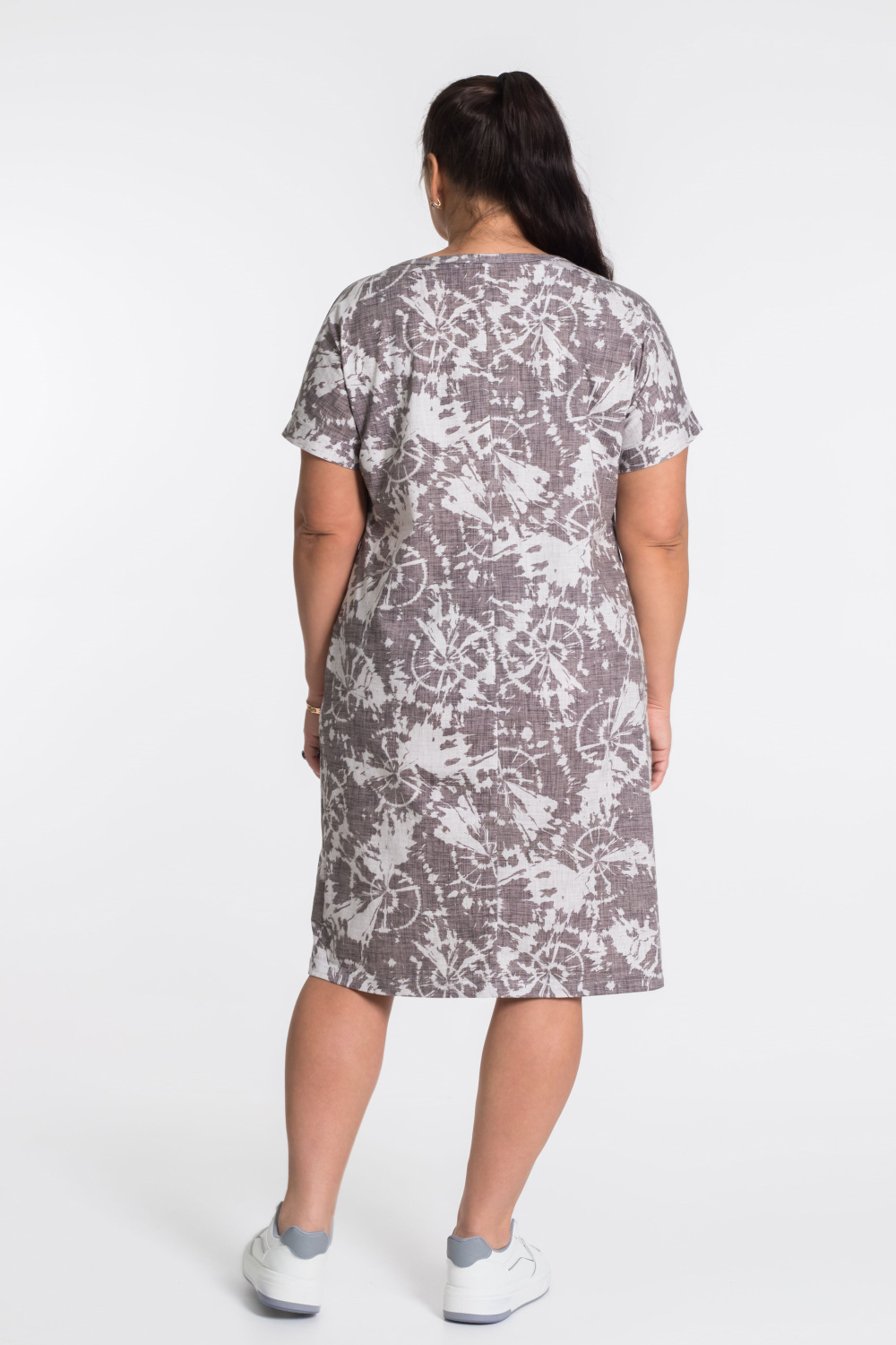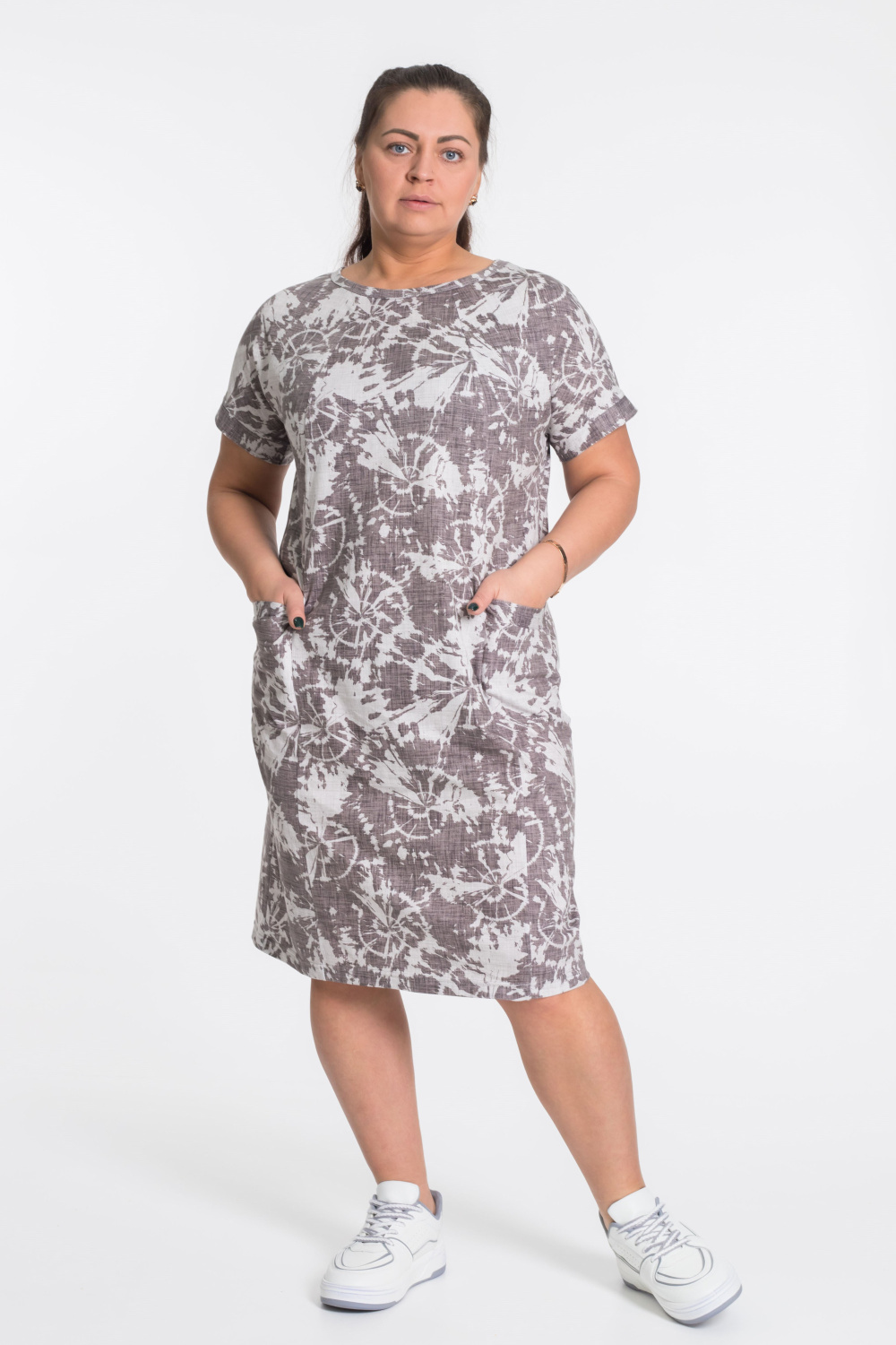 Платье из кулирки. Цельнокроеный рукав обработан притачной планкой.Спереди, на боковых деталях расположены внутренние карманы. Платье полуприлегающего силуэта. Шов на спинке подчеркивает талию.