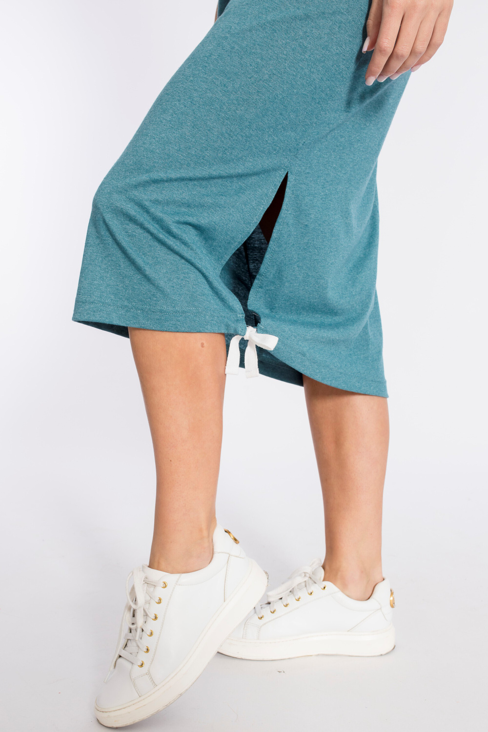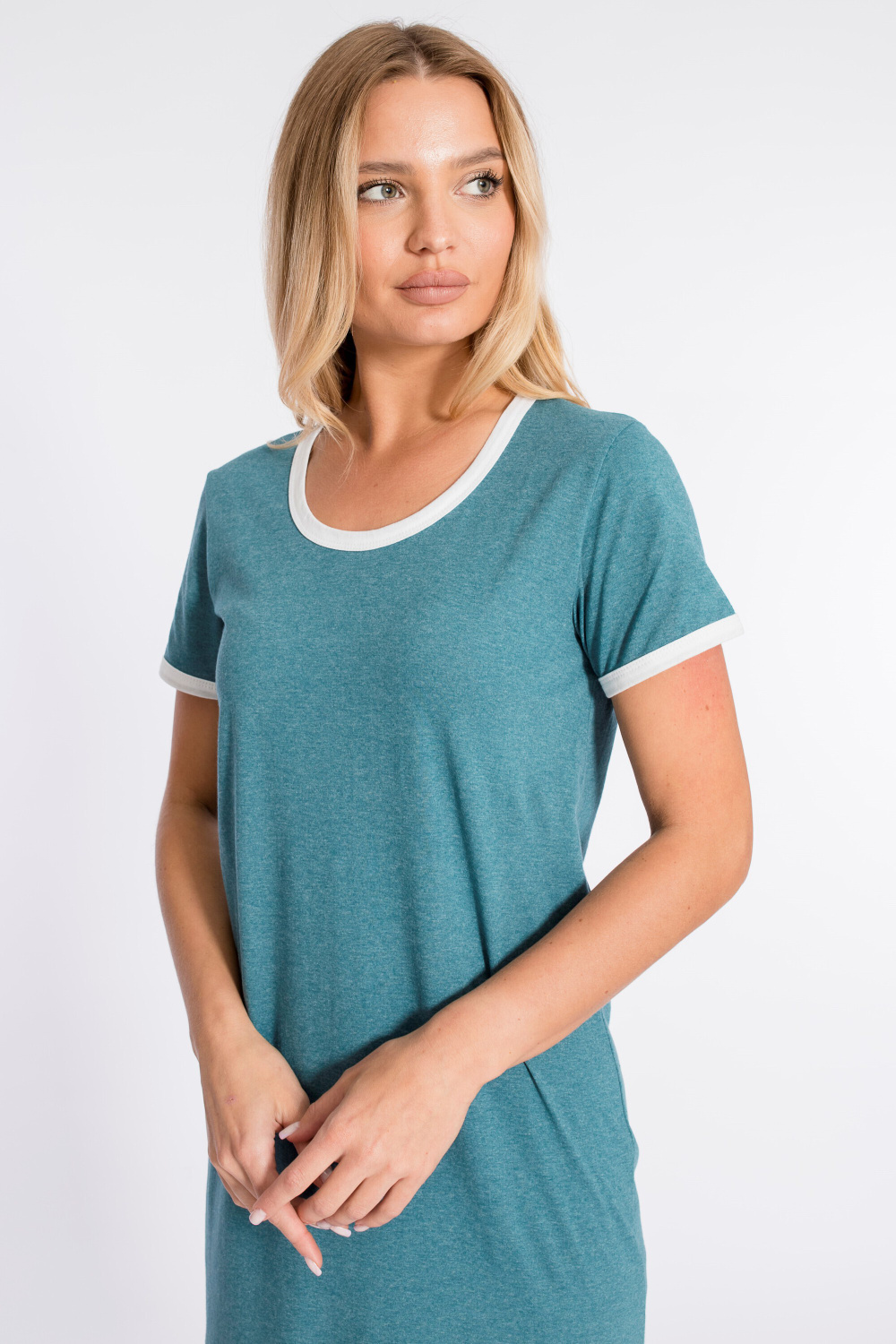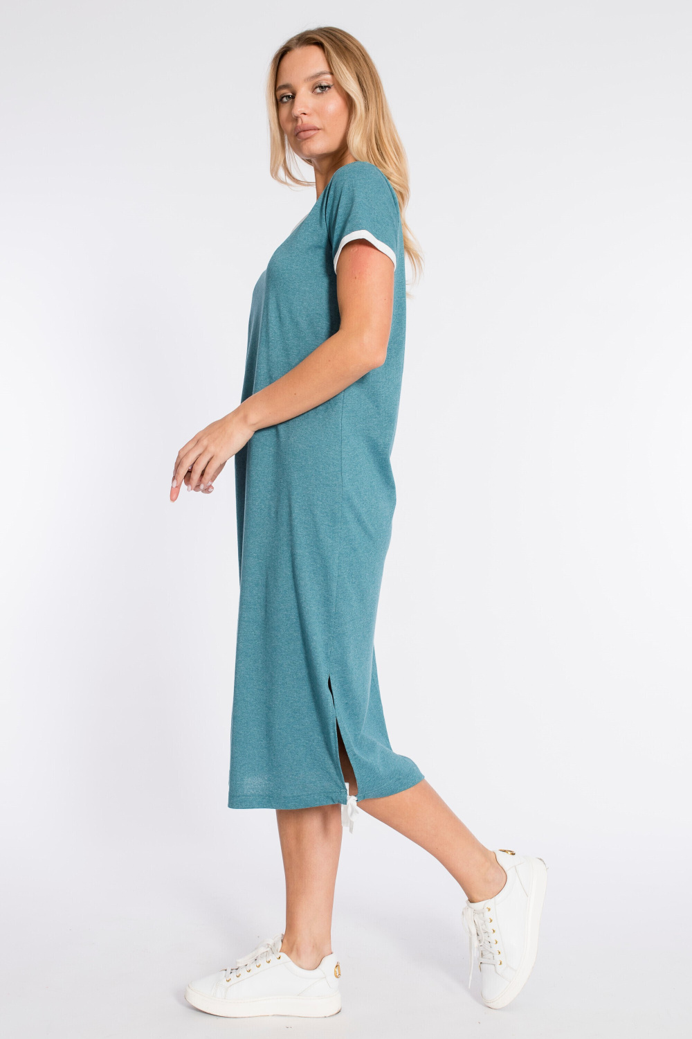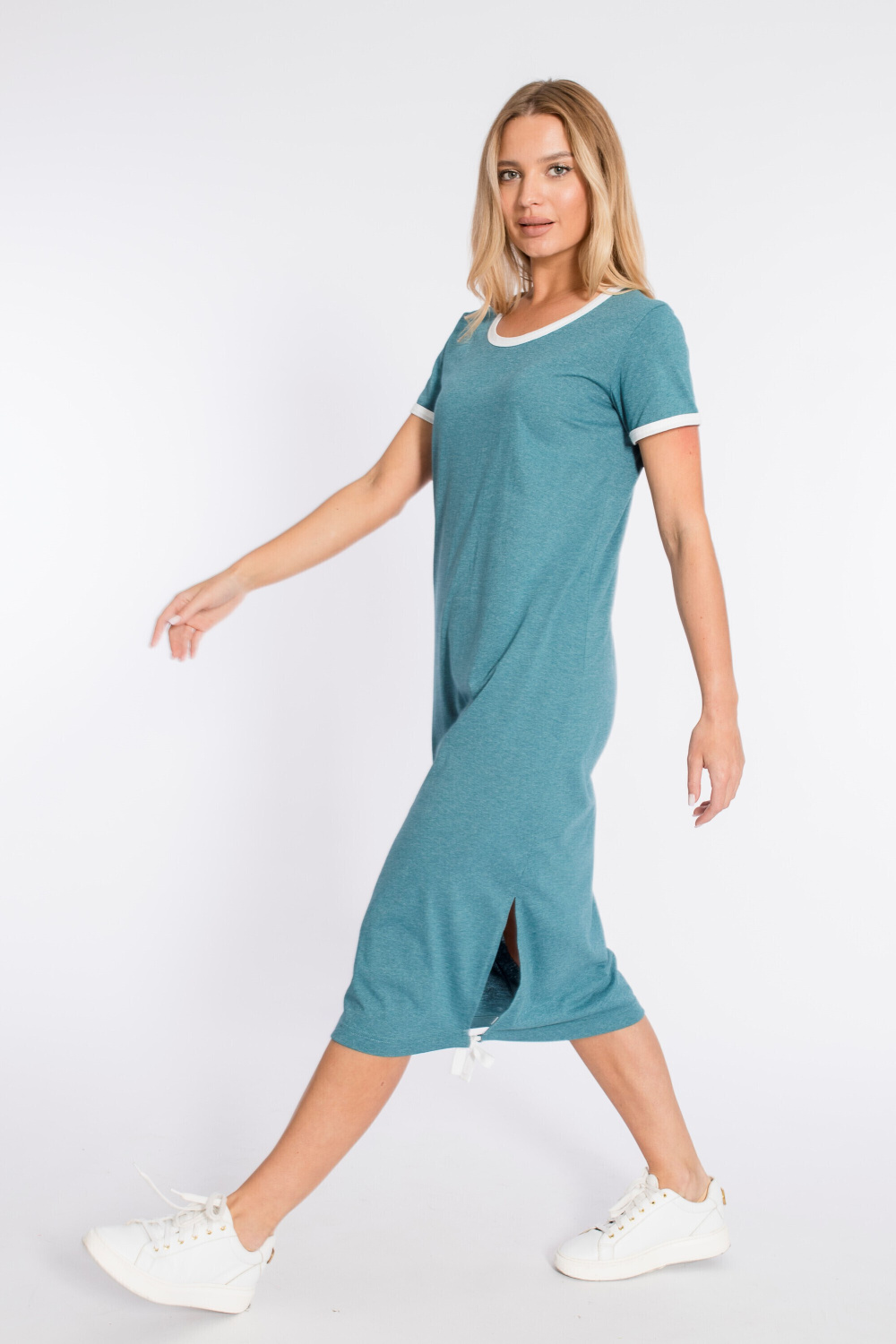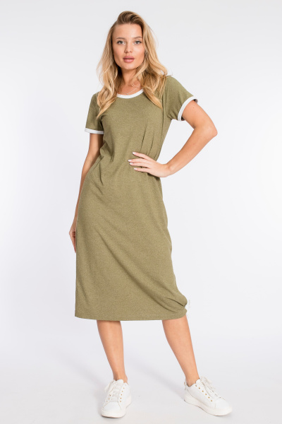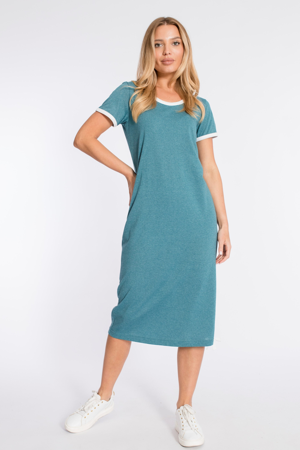 Платье прямого силуэта с разрезом внизу выполнено из хлопкового полотна. Короткие рукава и вырез горловины обработаны бейкой контрастного цвета.