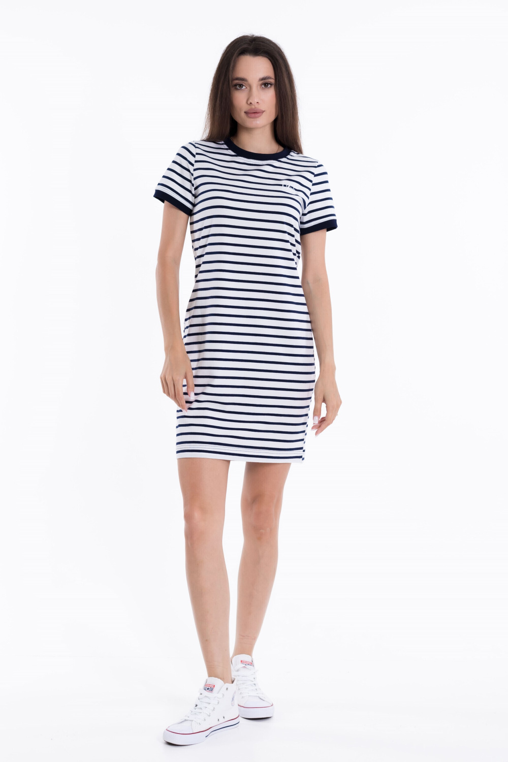 Летнее платье облегающего силуэта. Круглый вырез горловины и низ рукавов оформлены планками. Спереди термопечать.