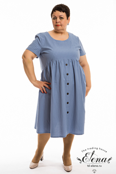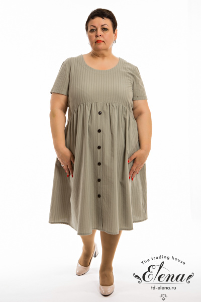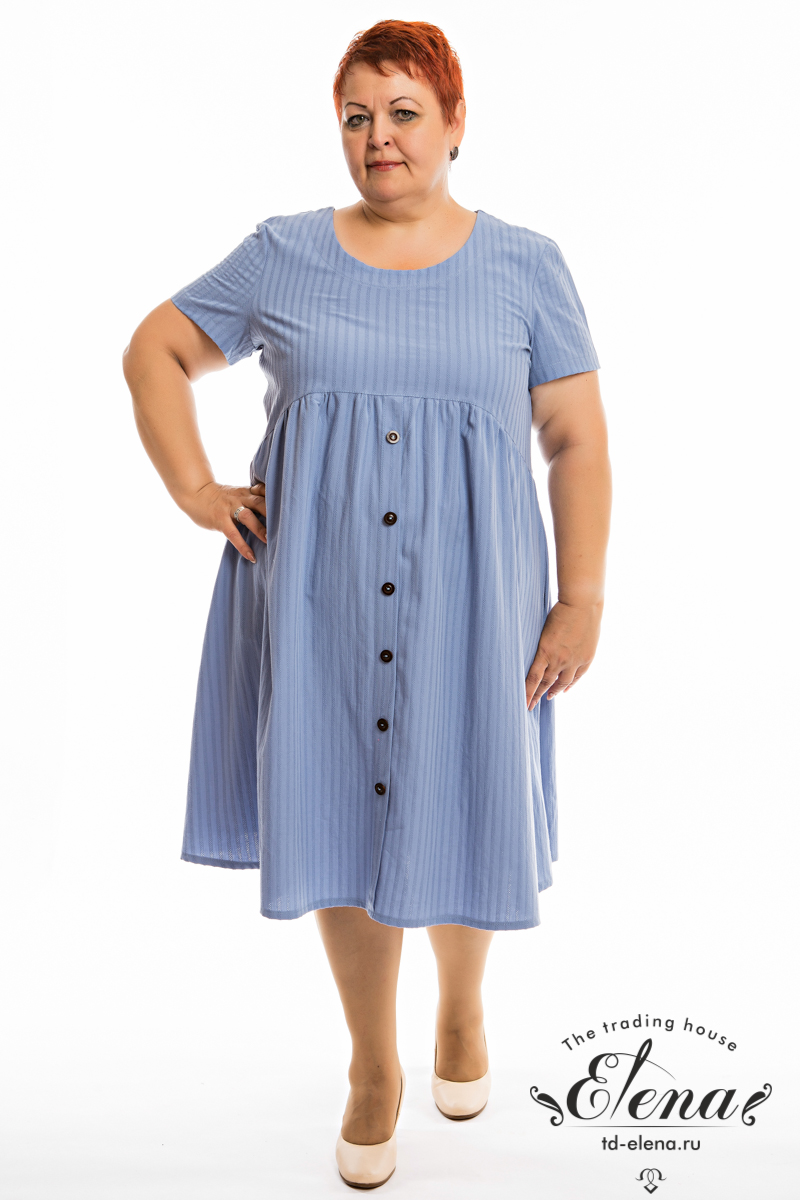 Платье из однотонного хлопка жаккард. С коротким втачным рукавом и овальным вырезом горловины. Спереди и на спинке фигурная линия отреза юбки. Юбка со сборкой, спереди застрочена складка, имитирующая застёжку на пуговицы. В боковых швах расположены карманы.