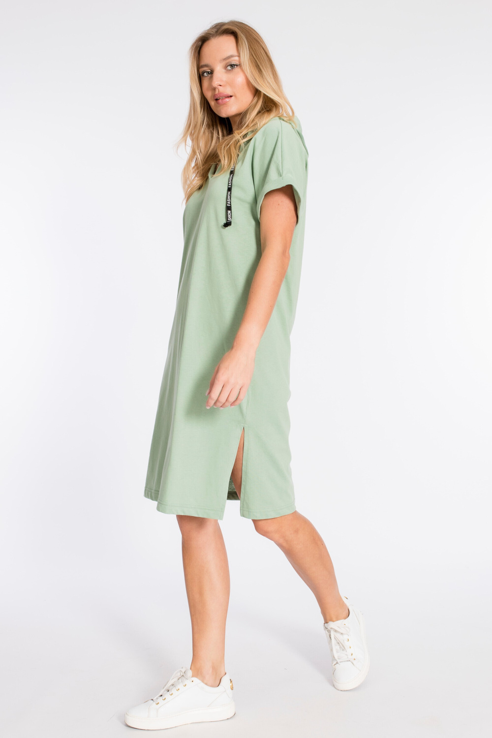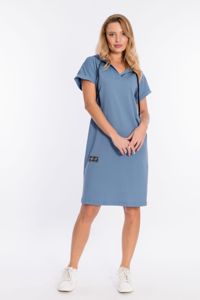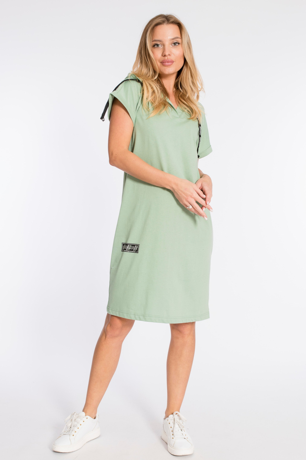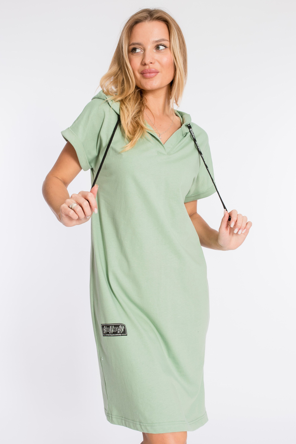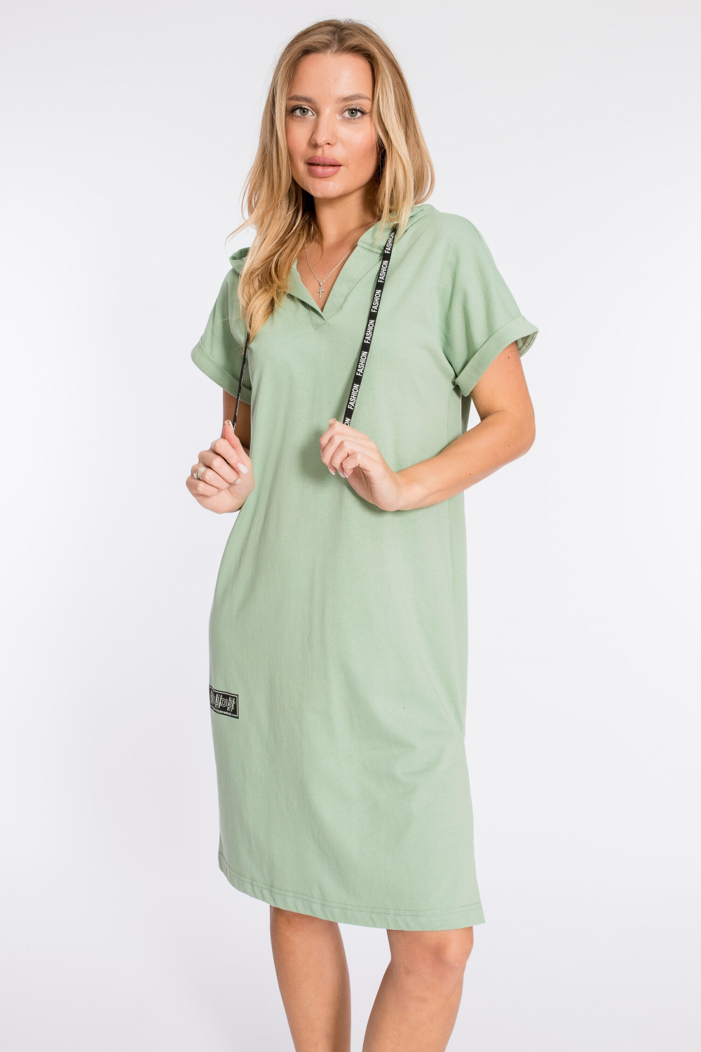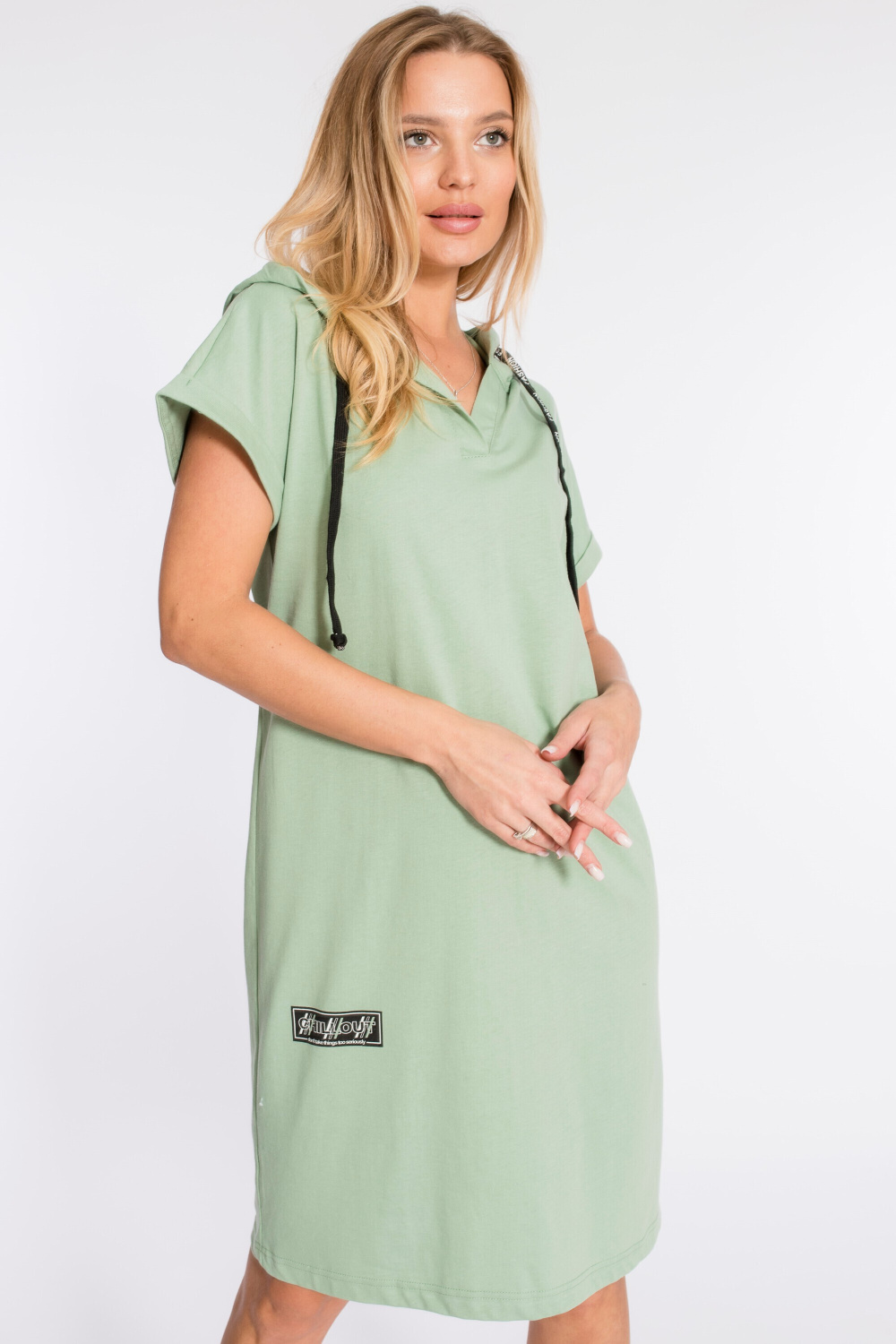 Платье выполнено из плотной однотонной кулирки. Ширина капюшона регулируется при помощи шнура. Линия плеча спущена, рукава короткие, манжета с отворотом. С левой стороны, снизу, расположен небольшой разрез, с правой -  нанесён принт.