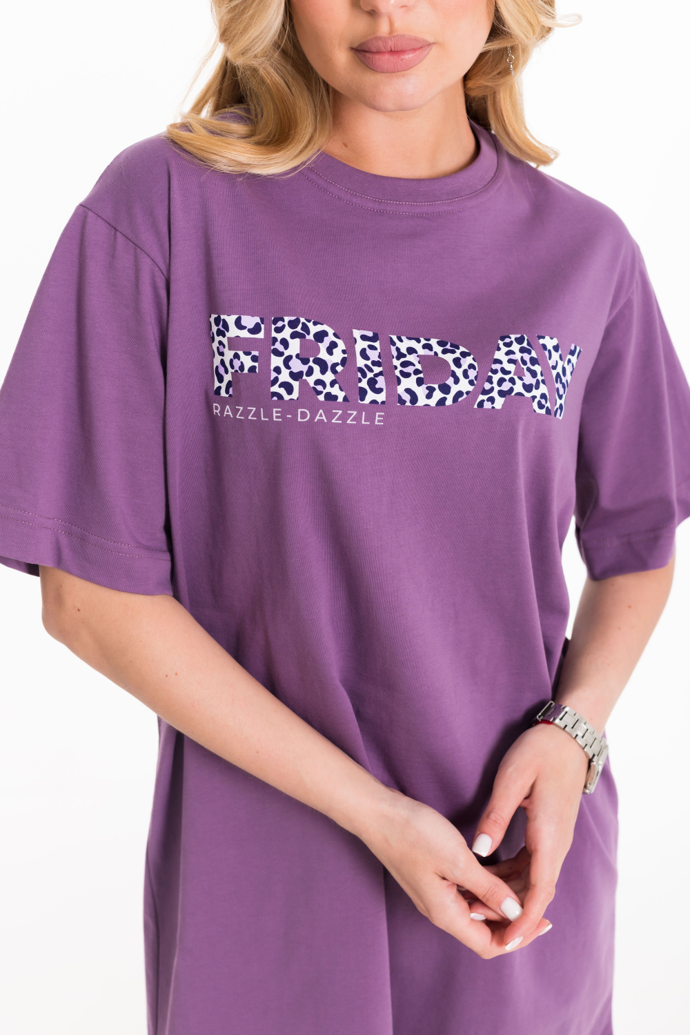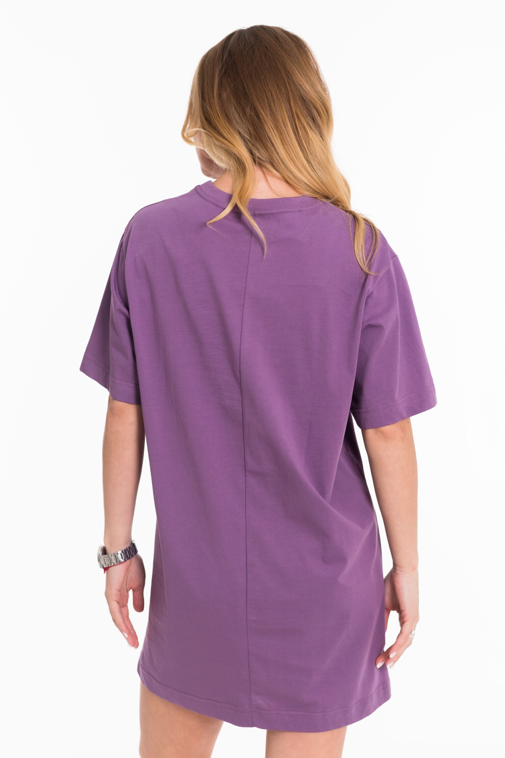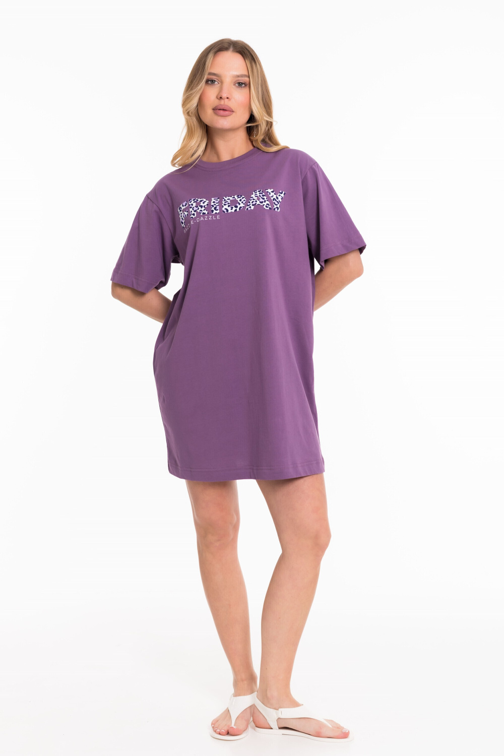 Платье свободного силуэта выполнено из однотонной кулирки. С коротким рукавом и принтом спереди. Круглый вырез горловины оформлен планкой.