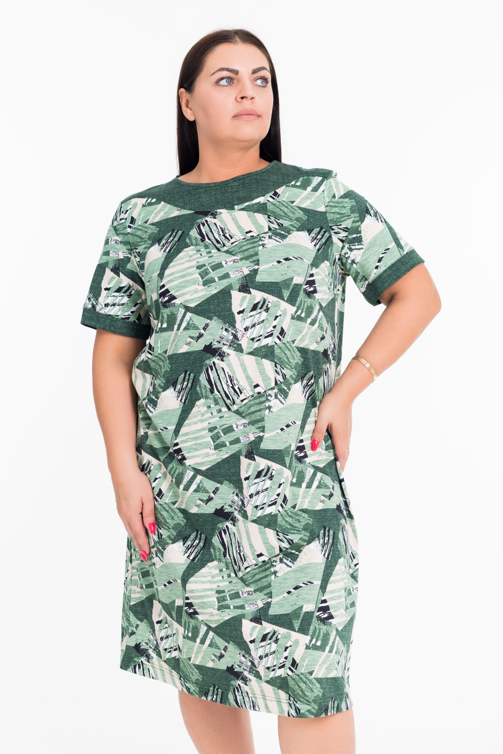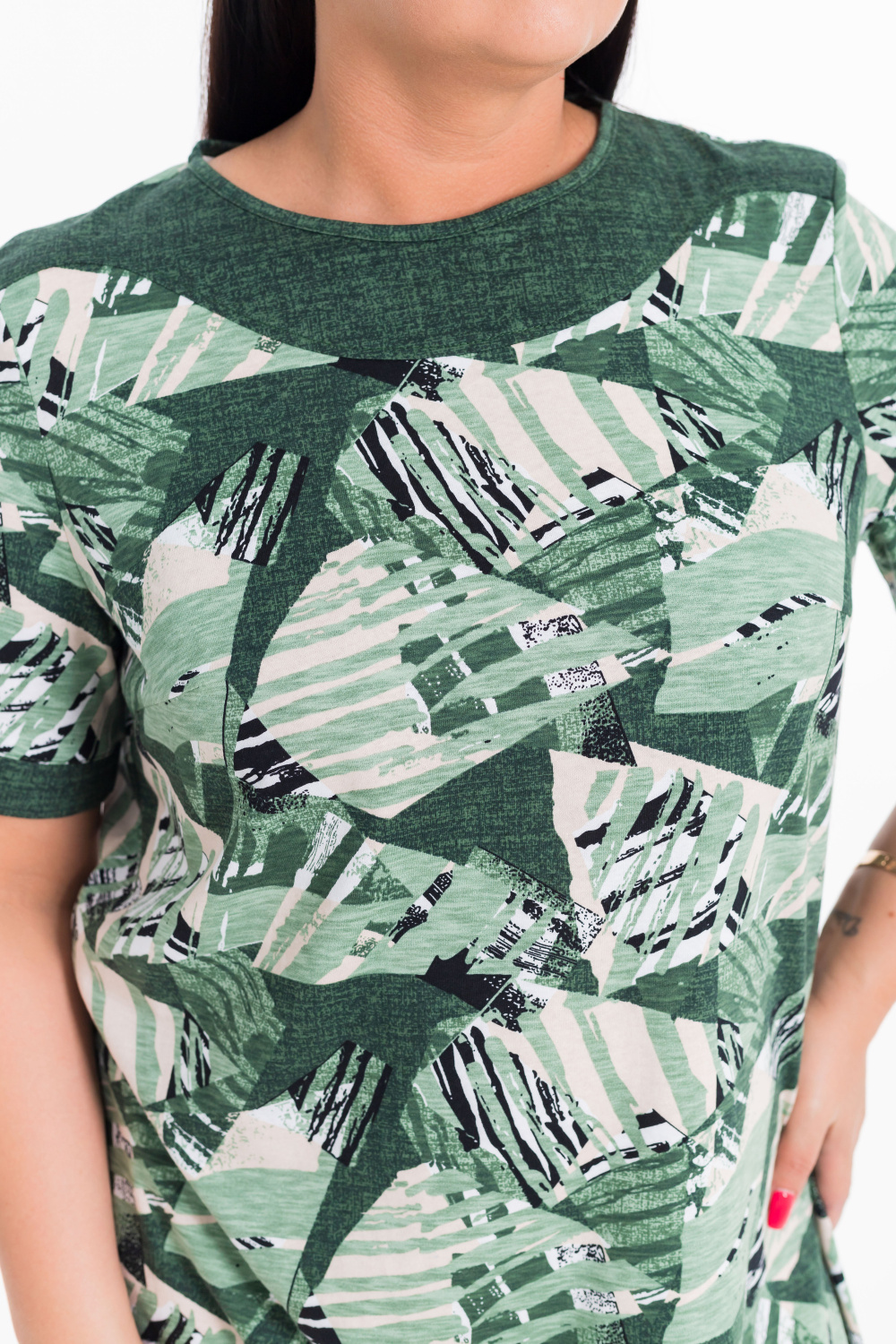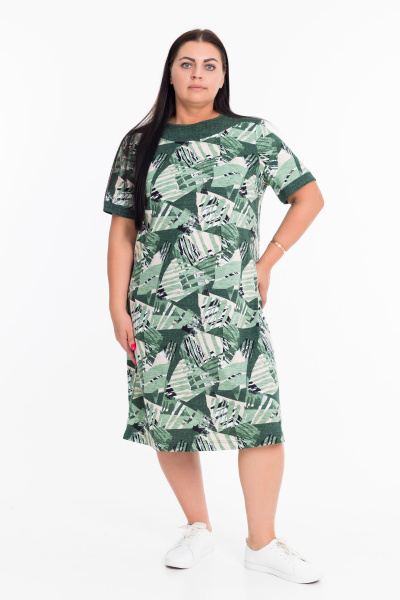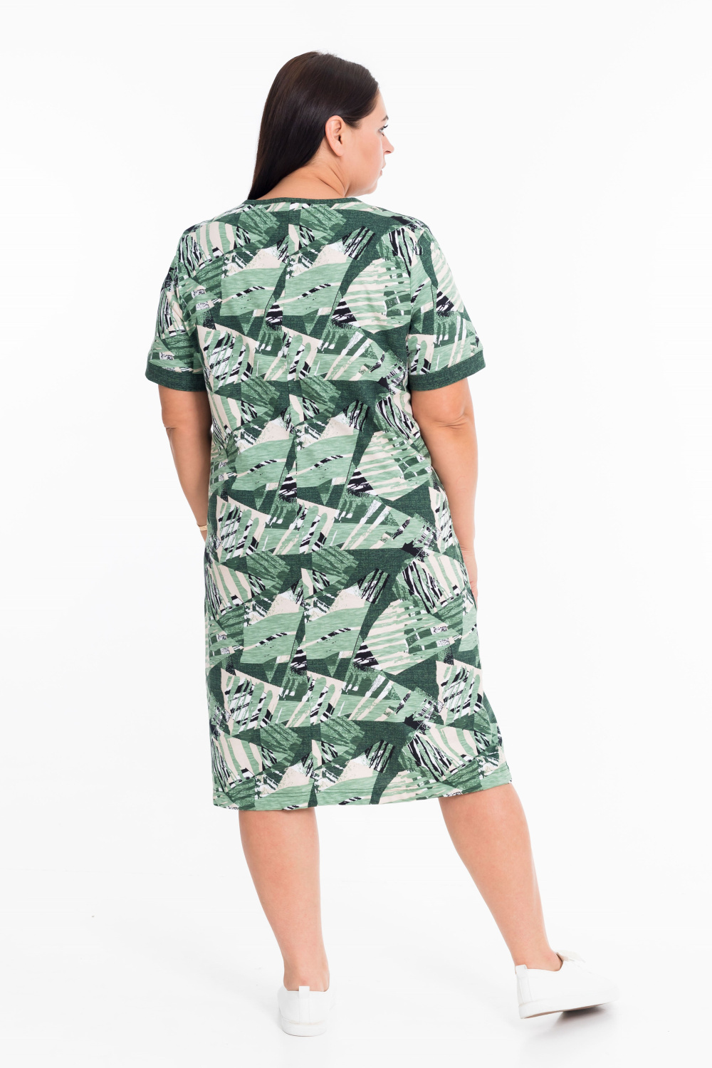 Платье выполнено из кулирки с набивным рисунком с отделкой однотонными планками по круглому вырезу горловины и низу рукавов.