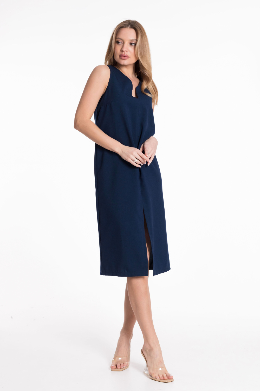 Платье из полотна "искусственный лен" прямого силуэта, в переднем шве разрез.