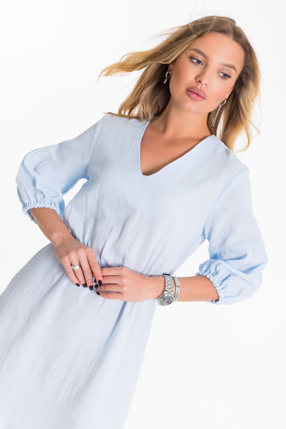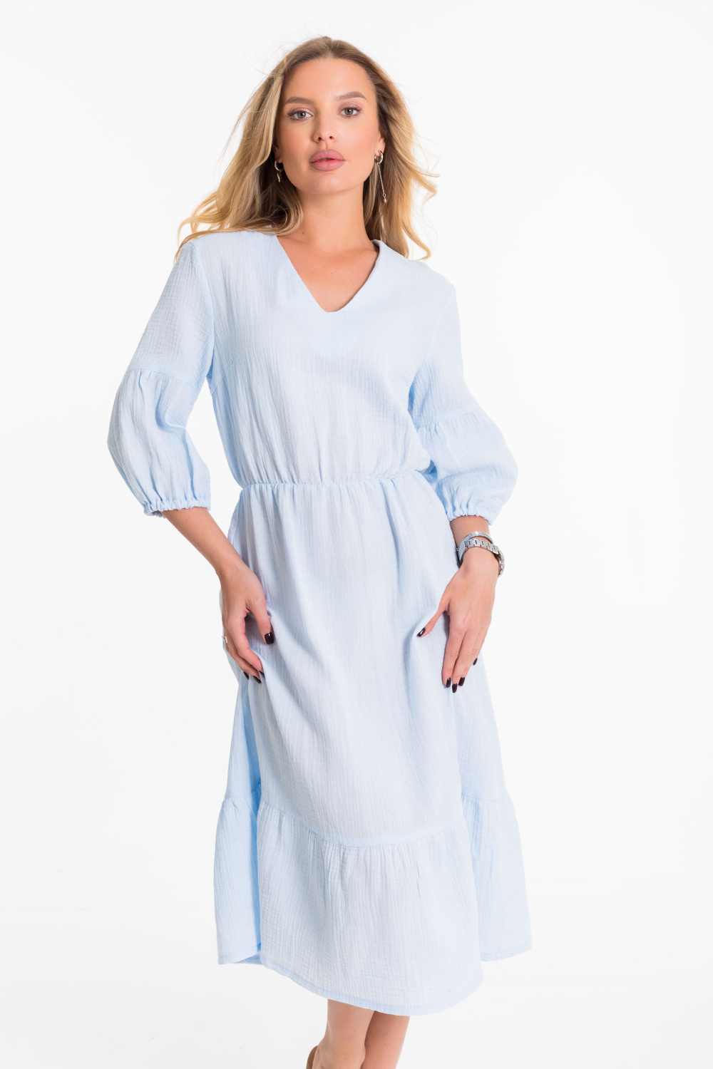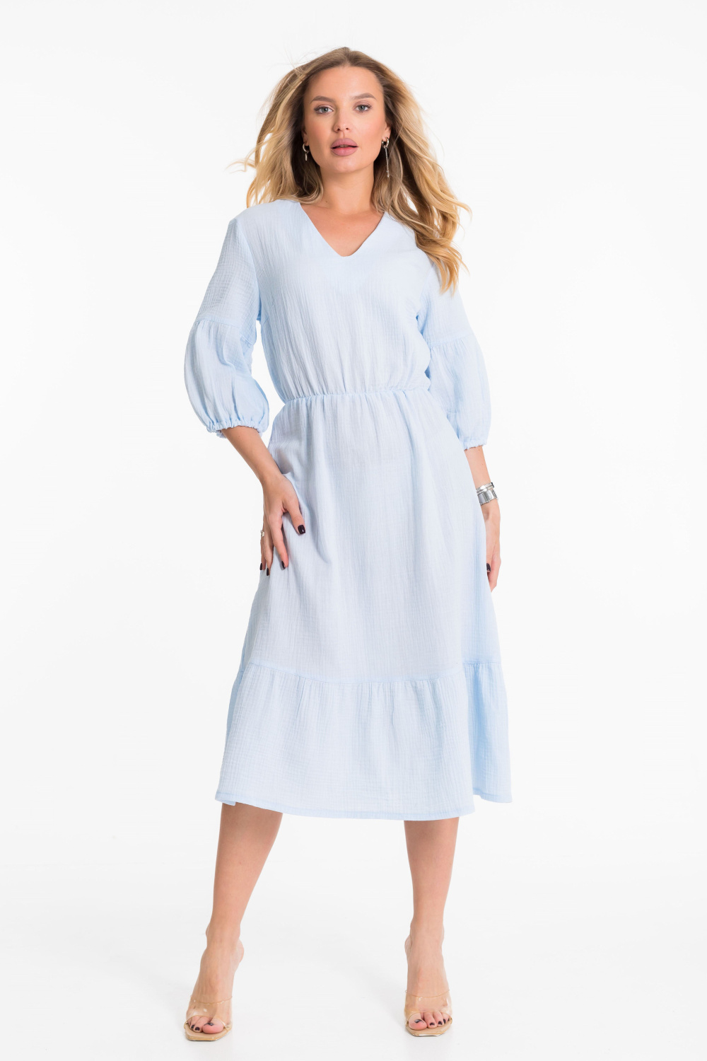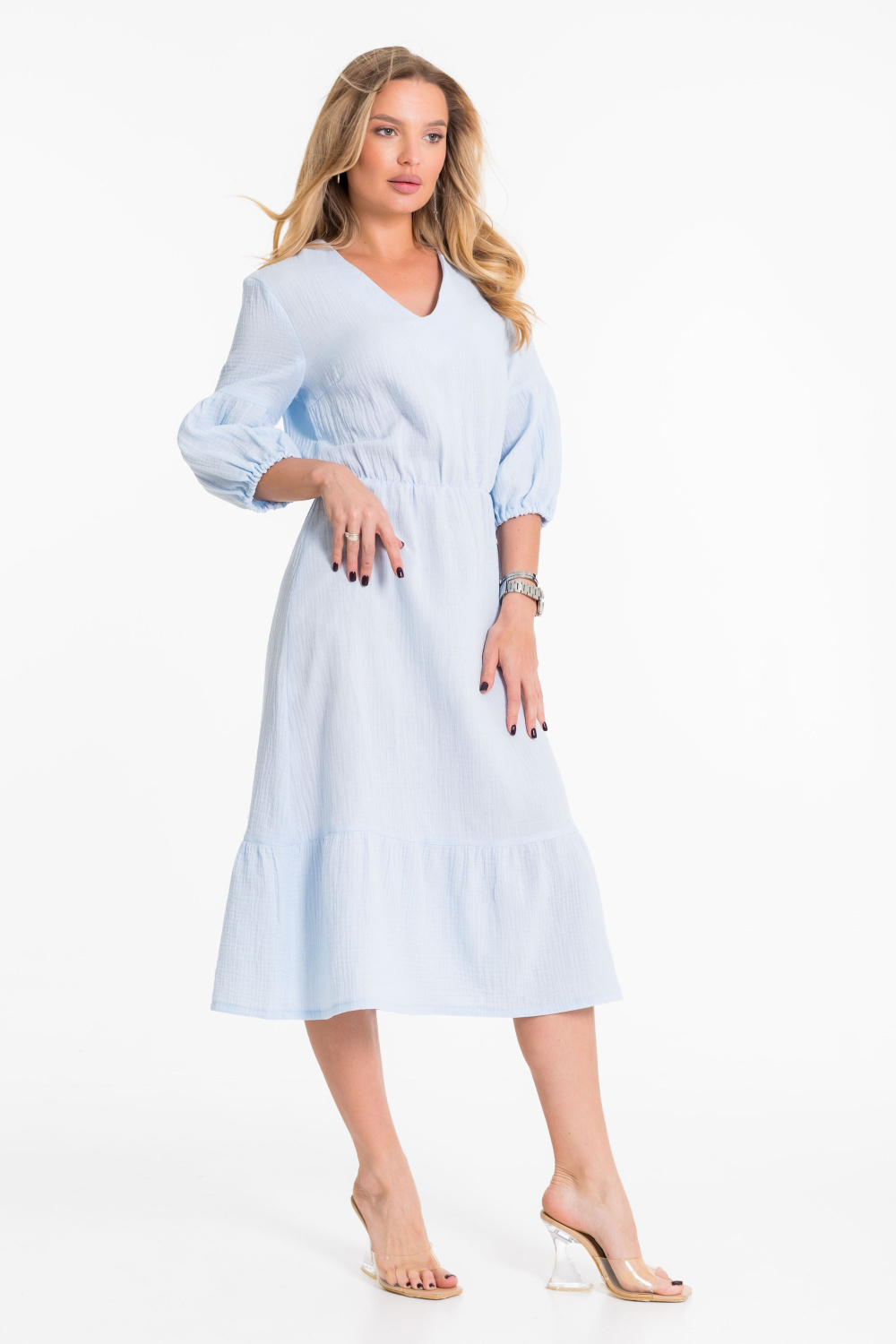 Платье выполнено из однотонного муслина голубого цвета. Рукав втачной с отрезной нижней частью в виде фонарика. Горловина с V-образным вырезом, юбка визу с широкой оборкой.
