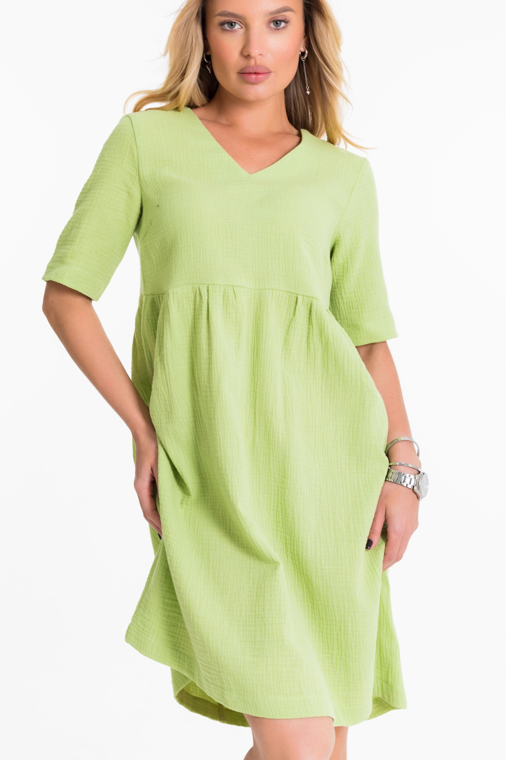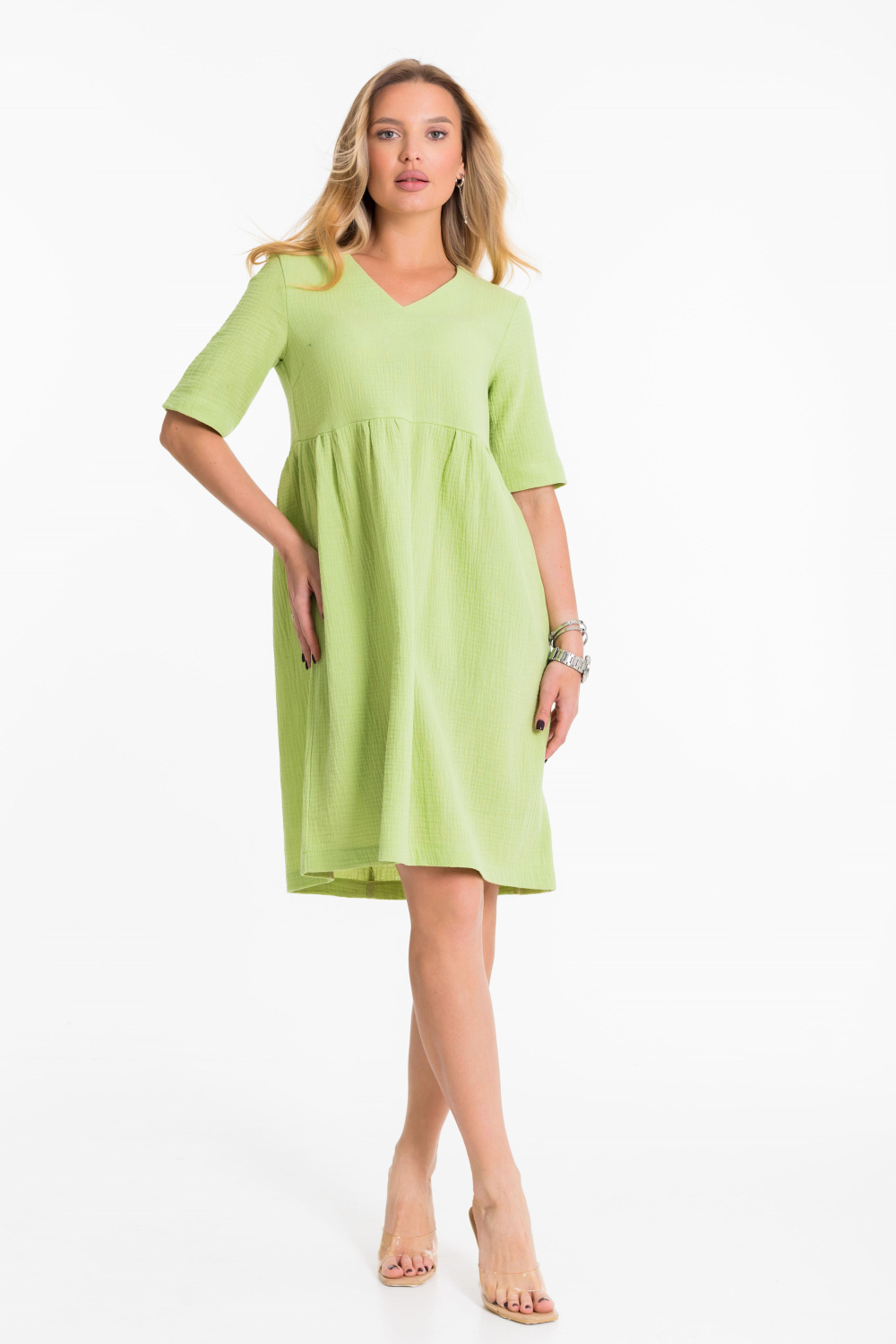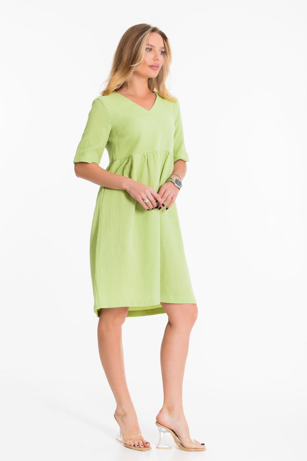 Платье выполнено из однотонного муслина. С отрезной завышенной линией талии, юбка со сборками. Рукав втачной до локтя. Горловина с V-образным вырезом. Длина платья чуть выше колена.
