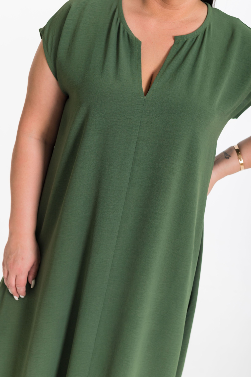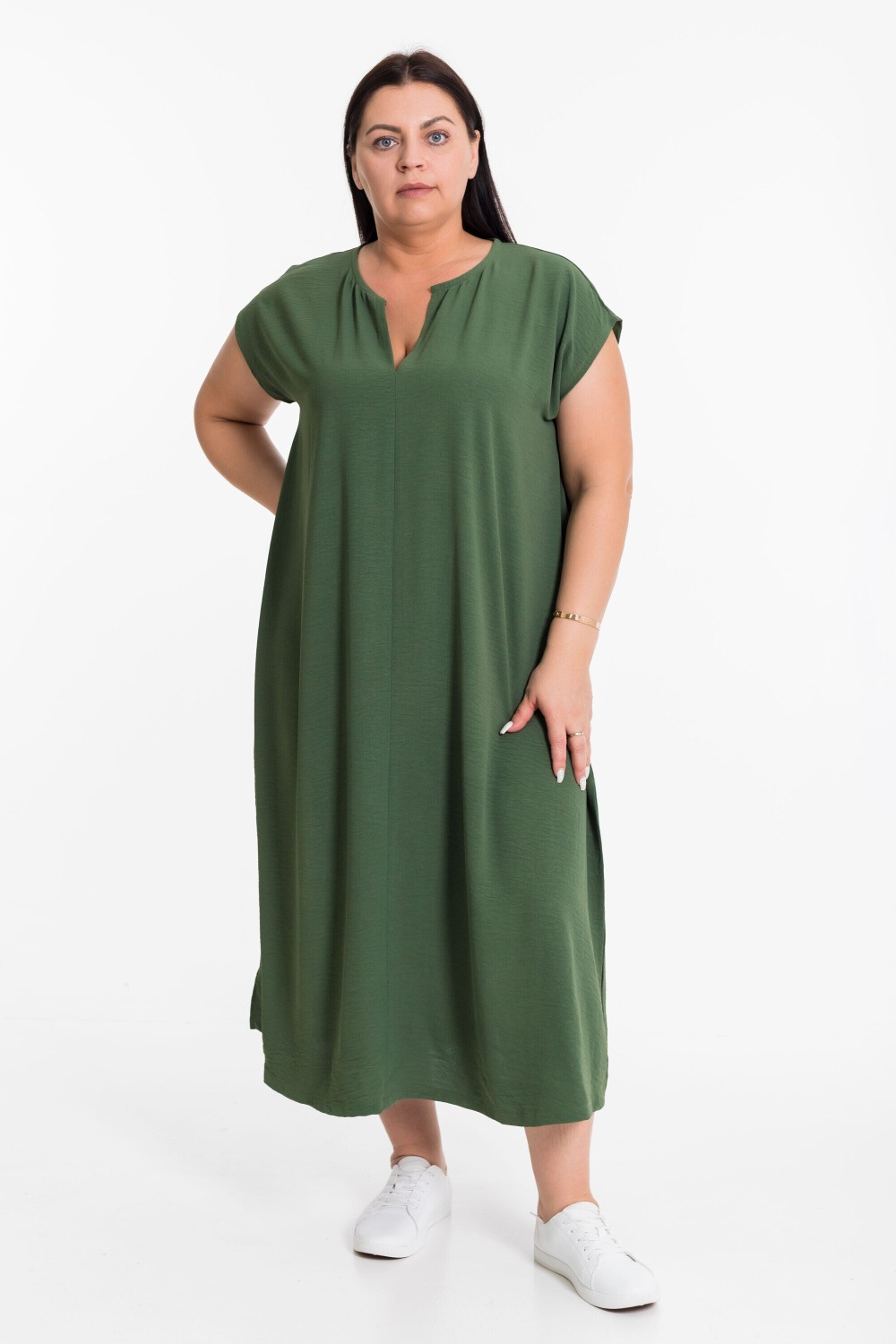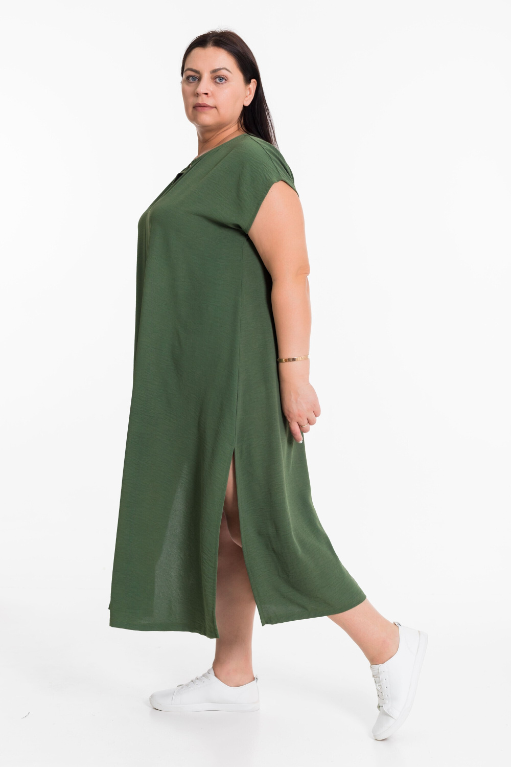 Платье выполнено из полотна "манго". Платье свободного силуэта, удлинённое, со спущенной линией плеча и декоративными разрезами по бокам снизу.
