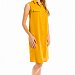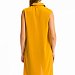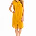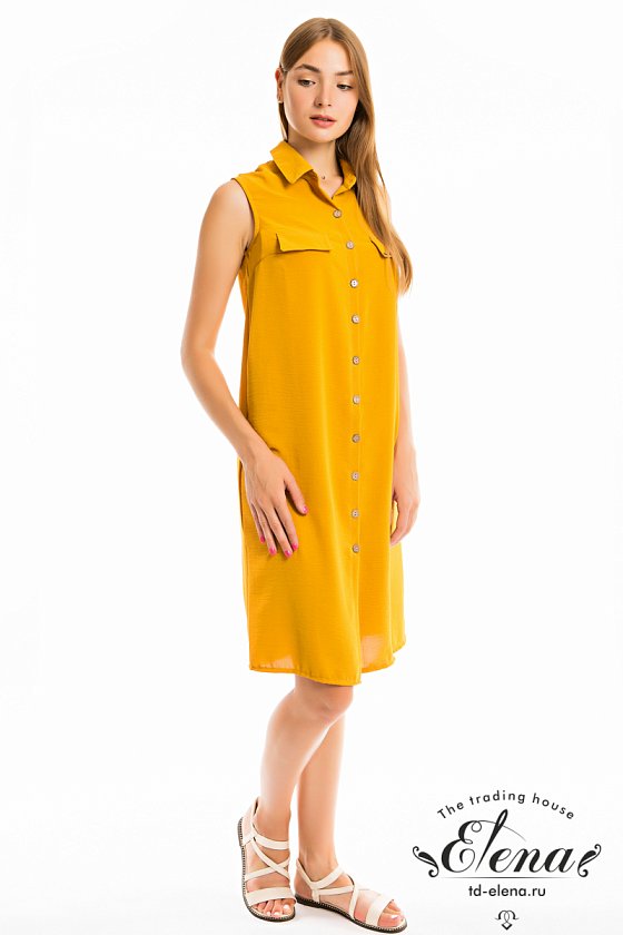 Платье из однотонного шёлкового крепа. Без рукавов, с застёжкой на пуговицы и воротником. На полочках нагрудные вытачки и декоративные клапаны.