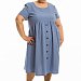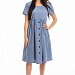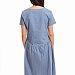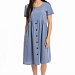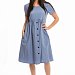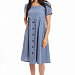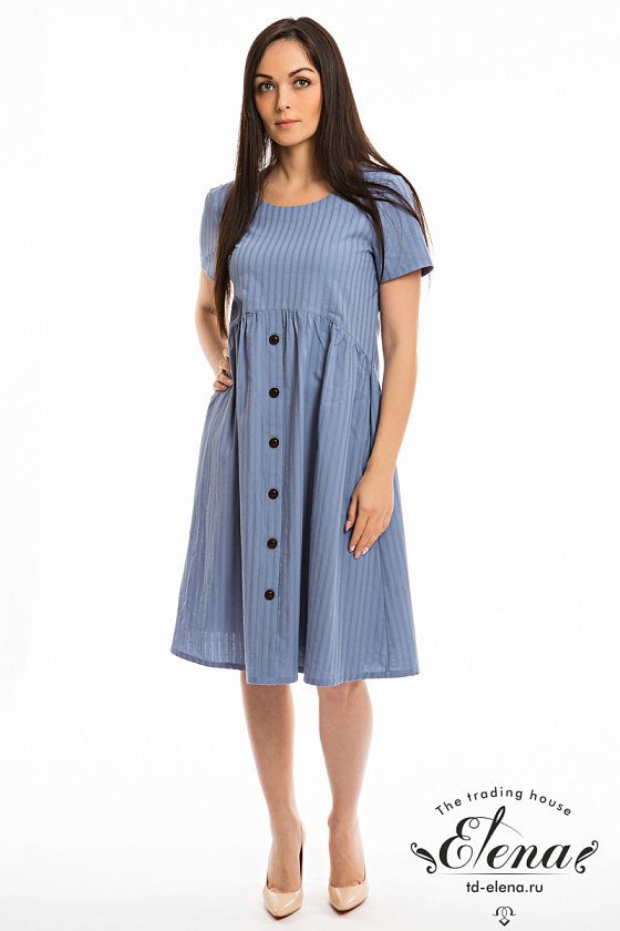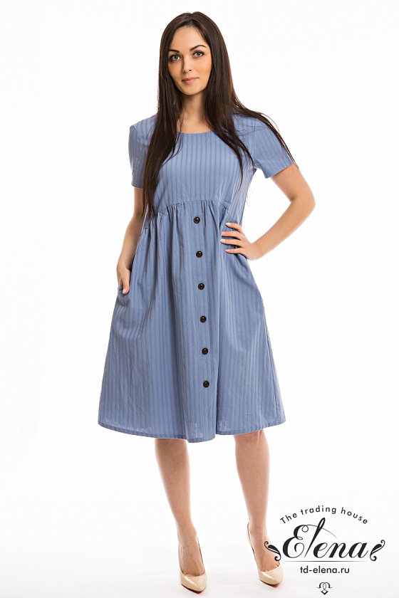 Платье из однотонного хлопка жаккард. С коротким втачным рукавом и овальным вырезом горловины. Спереди и на спинке фигурная линия отреза юбки. Юбка со сборкой, спереди застрочена складка, имитирующая застёжку на пуговицы. В боковых швах расположены карманы.