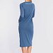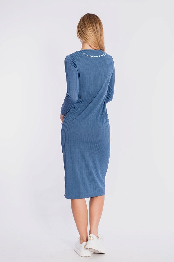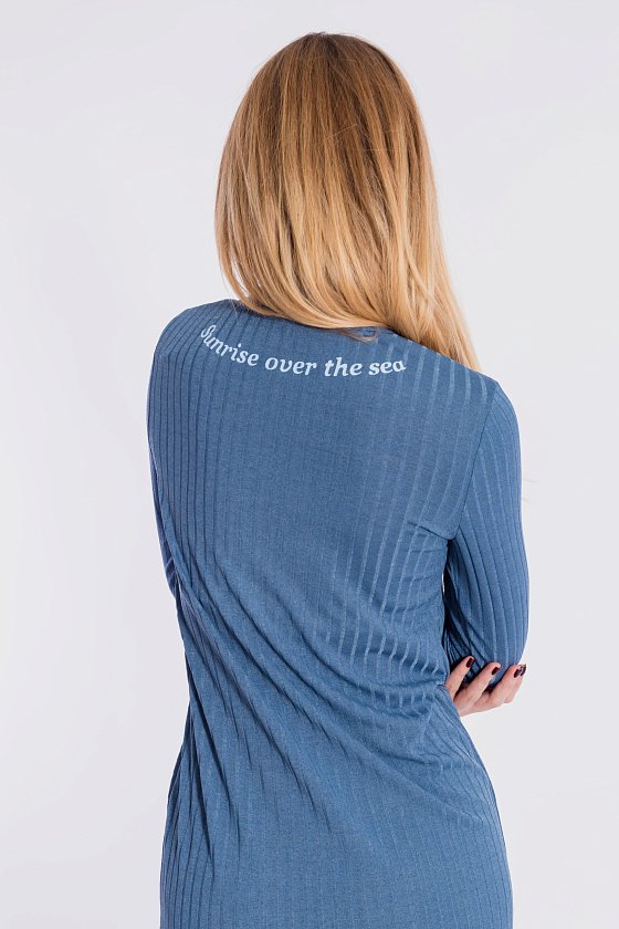 Платье из однотонной рибаны в широкий рубчик. С длинным втачным рукавом, овальной горловиной, обработанной бейкой. Длина платья ниже колена. На спинке нанесена термопечать.