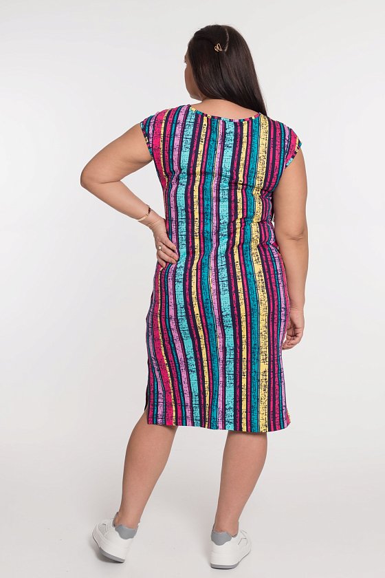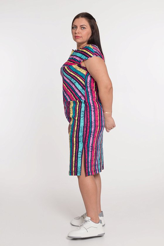 Лёгкое летнее платье из кулирки, 100% хлопок. Линия плеча спущена, спереди на горловине декоративный разрез. Внизу, по бокам, также расположены разрезы.