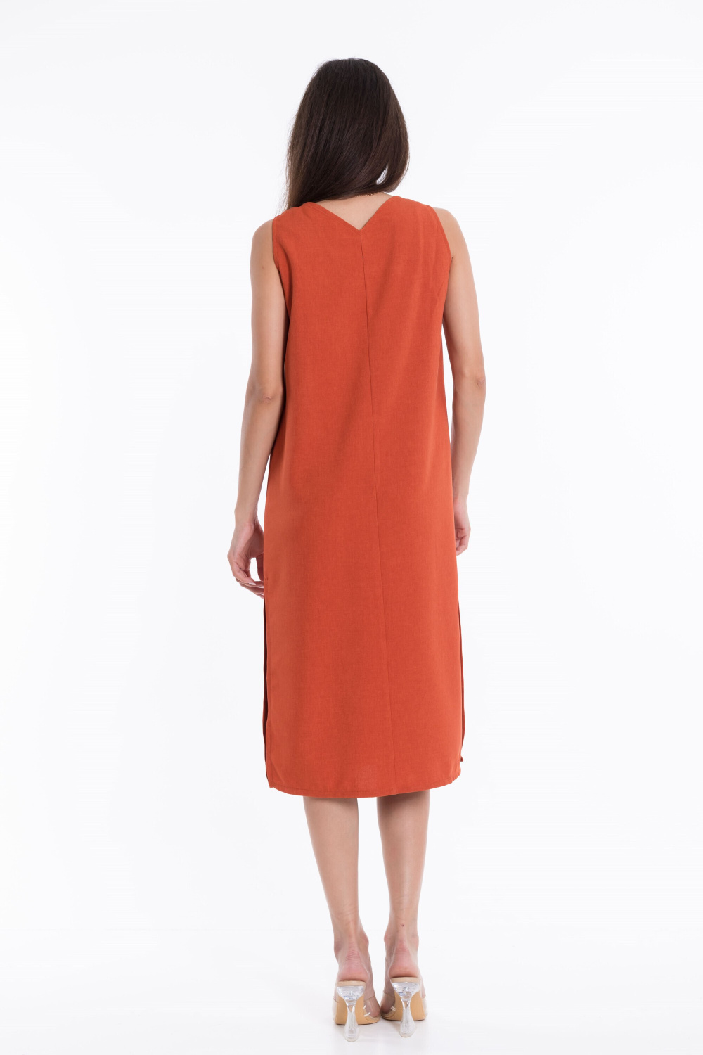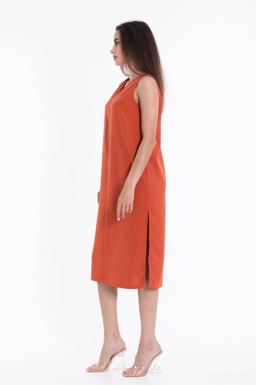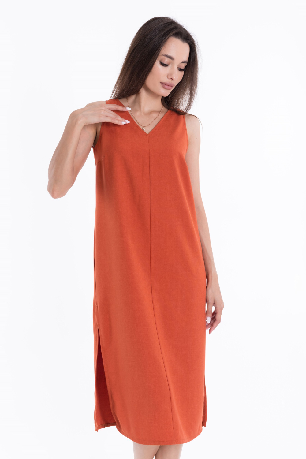 Платье из полотна "искусственный лен". Свободный силуэт, V-образный вырез горловины, средний шов по центру спинки и полочки делает платье особенно элегантным, в боковых швах разрезы.